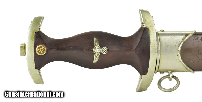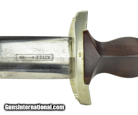 Description: German SA Dagger (Sturmabeilung) AKA Brown Shirt military organization. Maker marked “F. Dick”. An unusual maker. Blade is very good plus. No rust, no damage. Hilt is very good with no chips or cracks. Crossguard has a small “S.W.” mark for the region for which it was issued. Scabbard has very good nickel plated throat and tip parts. Body of scabbard is anodized and has some rust. Opposite side has light scratches but no rust. SOLD |