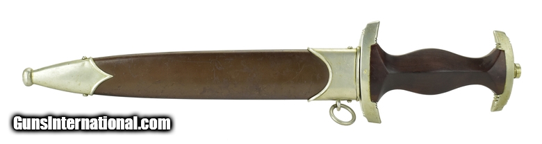 German SA Dagger (Sturmabeilung) AKA Brown Shirt military organization. Maker marked “F. Dick”. An unusual maker. Blade is very good plus. No rust, no damage. Hilt is very good with no chips or cracks. Crossguard has a small “S.W.” mark for the region for which it was issued. Scabbard has very good nickel plated throat and tip parts. Body of scabbard is anodized and has some rust. Opposite side has light scratches but no rust.