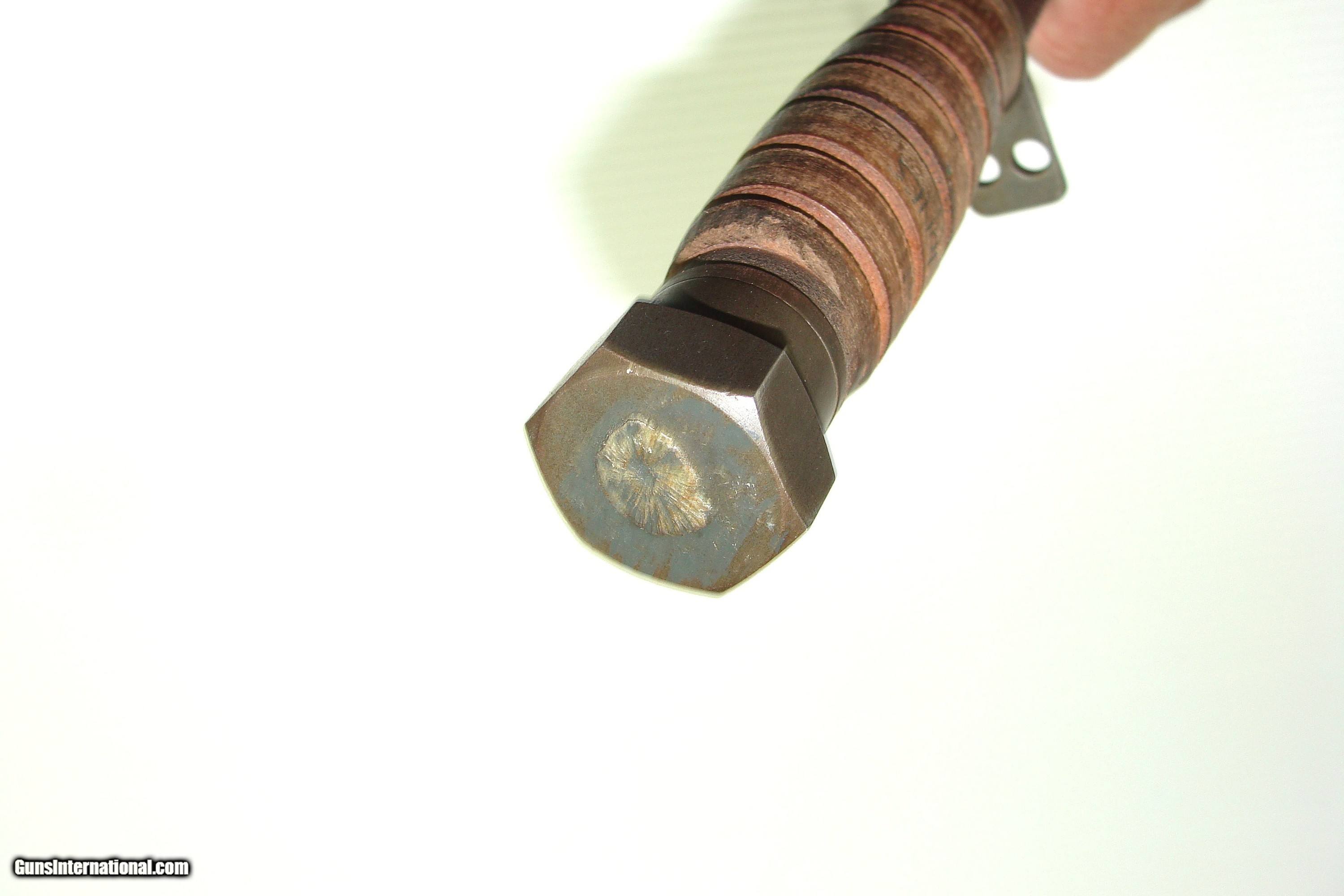 Description: JET PILOTS SURVIVAL / FIGHTING KNIFE ADOPTED 1957. IN USE LATE 50'S, EARLY 60'S WHEN WE WERE ONLY "ADVISORS" IN VIETNAM. NEAR MINT/MINT VIETNAM WARTIME PRODUCTION. SEE WALTERS Book 2, PG. 656. 6" BLADE HAS VERY SLIGHT "RUB". THE HANDLE IS MINT, NO PROBLEMS. COSSGUARD & POMMEL, FLAWLESS & MINT. THE GREYSTONE IS UNUSED. THE SCABBARD IS THE EARLY TYPE WITH TIE DOWN AT THE THROAT. THE REVERSE IS STAMPED, "JONES". I FIGURE..."JET PILOT JONES"? ~~~~~~~~~~~~~~~~~~~~~~~~~~~~~~~~~~~~~~~~~~~~~~~~~~~~~~~~~~~~~~~~~~~~~~~~~~~~~~~~~~~~~~~~~~~~~~~~~~~~~~~~~~~~~~~~~~~~~~~~~~~~~~~~~~~~ No guarantee or warranty is expressed or implied as to the usability of the items for its original purpose. The buyer certifies that he or she is of lawful age and is not prevented by any law from the purchase or possession of these items. The buyer is responsible for knowing, understanding and obeying all International, Federal, State and Local laws concerning the purchase and possession of these items. Offers Accepted If you have any questions regarding this, or any Allied Military Fighting Knife 1941-1975, please let me know. This has been my passion: collecting, dealing, & studying military history of high condition Allied Military Fighting Knives from 1941-1975. I personally guarantee the authenticity of any knife that I sell. If you're also not sure what knife you have, or what it's worth, let me know. I offer Free Advice! SOLD |
