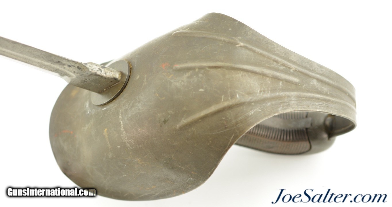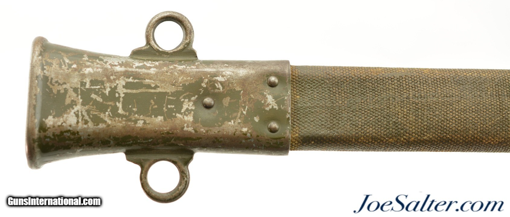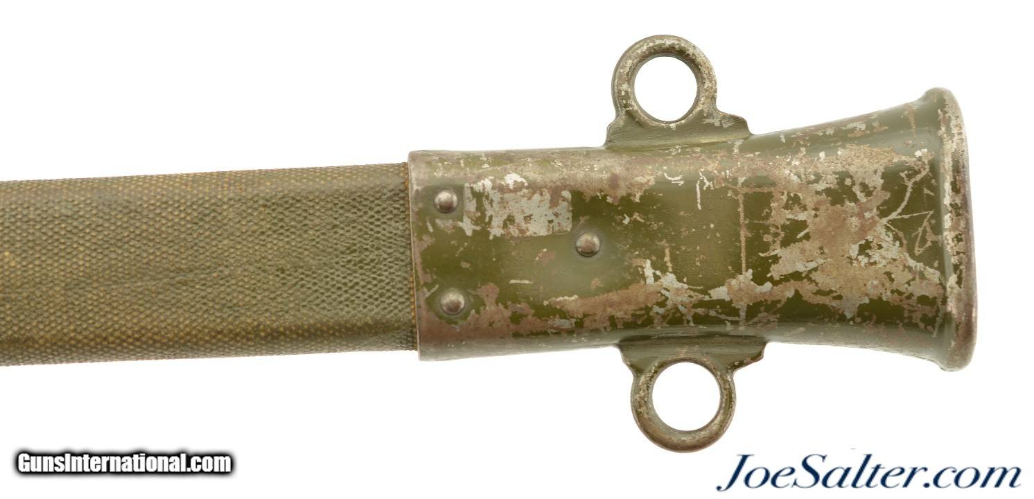 Description: This George S. Patton-designed cavalry sword measures 42" overall, with a 35 1/4" straight, tapered blade having unstopped central fullers. The blade has a mostly pale gray patina with areas of dark plum-brown freckling throughout, heaviest on the reverse forte. The ricasso markings are crisp and clear: "L.F. (flaming bomb) & C. / 1918" on the reverse, "US / (eaglehead proof)" on the obverse. The sheet metal guard has retained most of its original dark olive painted finish, with thin surface oxidation present throughout as well. The checkered metal grip likewise retains its matching painted finish with some flaking and wear that exposes the underlying gray metal. The original canvas and metal scabbard is included, with visible surface wear on the cloth wrap, as well as moderate flaking and freckling on the thoat piece. This is an about very good example of the last combat cavalry sword adopted by the U.S. Army, and would make a great representative example for a collection of US edged weapons. Price: $650.00 Contact Seller |