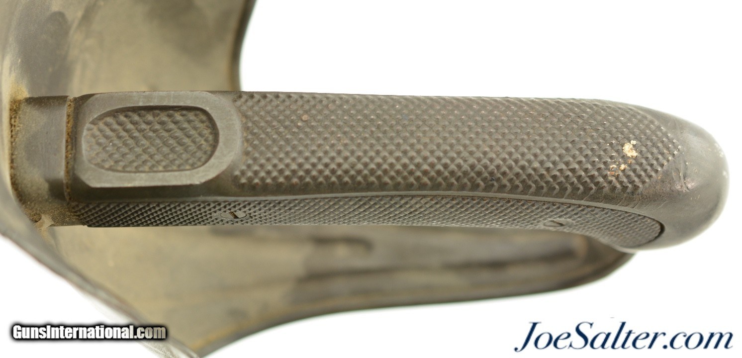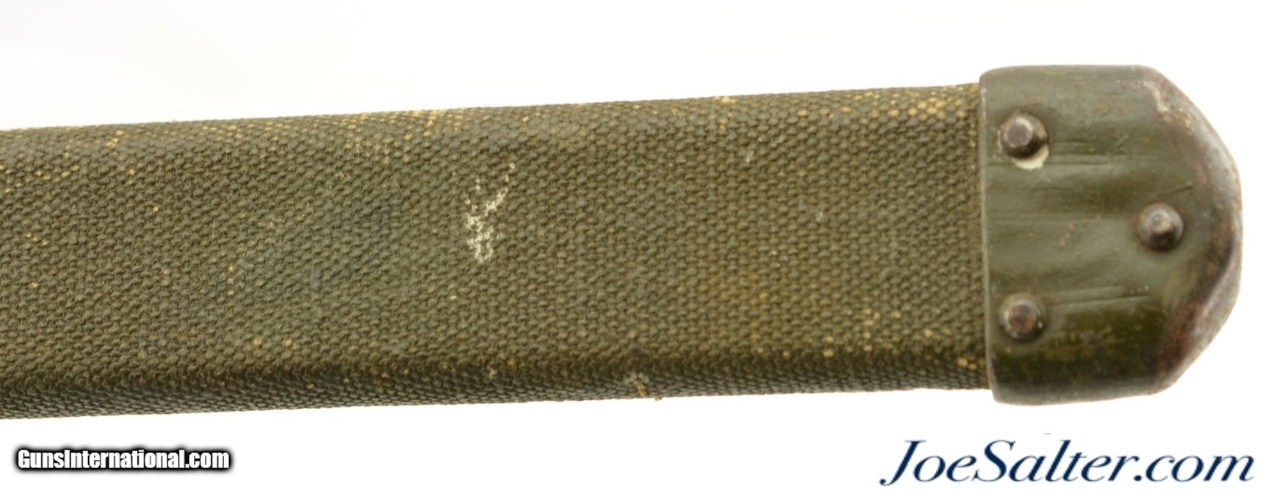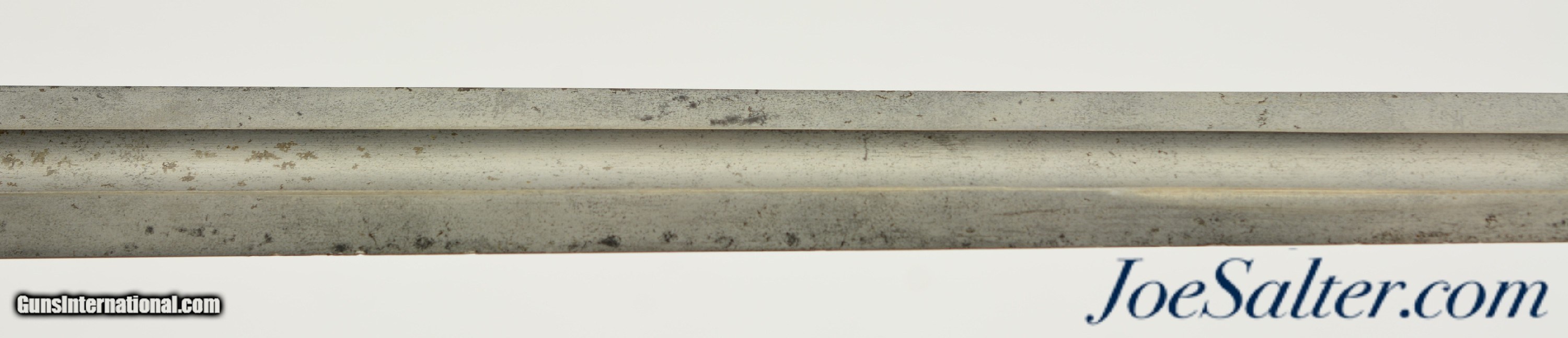 Description: This George S. Patton-designed cavalry sword measures 42" overall, with a 35 1/4" straight, tapered blade having unstopped central fullers. The blade has a mostly pale gray patina with areas of dark plum-brown freckling throughout, heaviest on the reverse forte. The ricasso markings are crisp and clear: "L.F. (flaming bomb) & C. / 1918" on the reverse, "US / (eaglehead proof)" on the obverse. The sheet metal guard has retained most of its original dark olive painted finish, with thin surface oxidation present throughout as well. The checkered metal grip likewise retains its matching painted finish with some flaking and wear that exposes the underlying gray metal. The original canvas and metal scabbard is included, with visible surface wear on the cloth wrap, as well as moderate flaking and freckling on the thoat piece. This is an about very good example of the last combat cavalry sword adopted by the U.S. Army, and would make a great representative example for a collection of US edged weapons. Price: $650.00 Contact Seller |