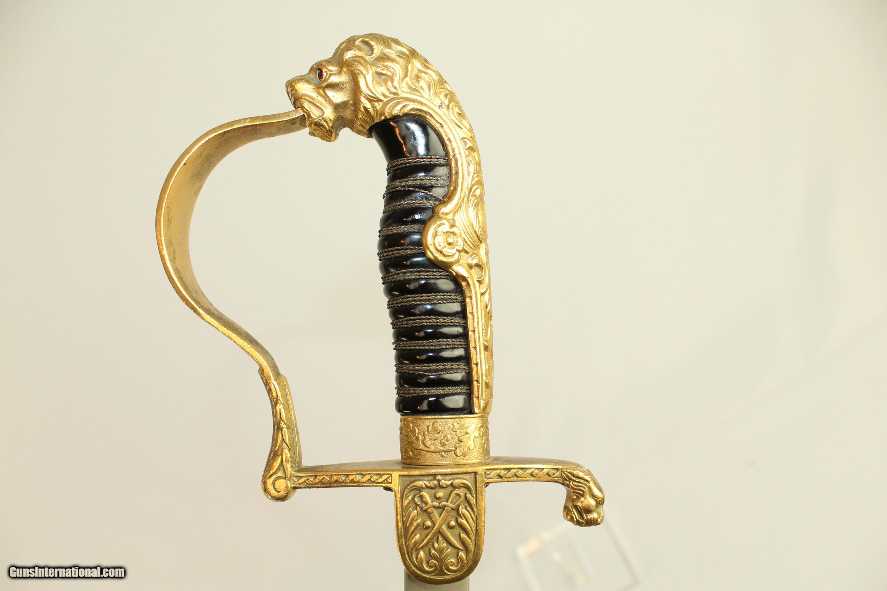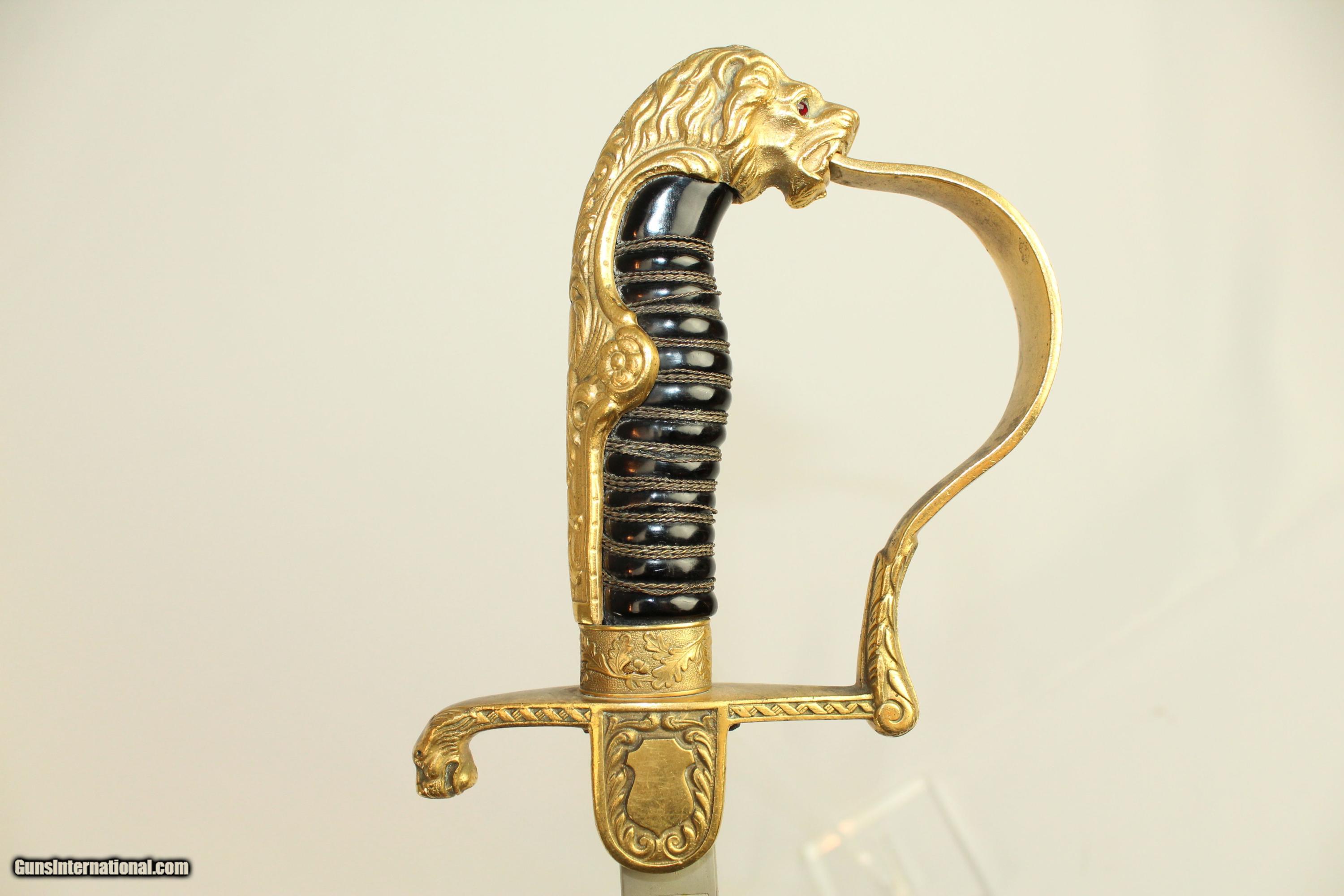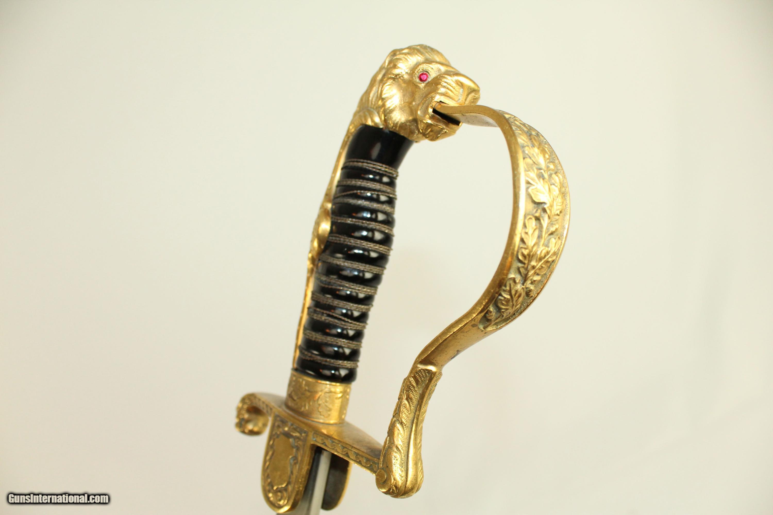 Description: Lion Head IMPERIAL German Officer’s Sword WWI-era Heer Sword with Etched Blade Here we present an antique Imperial German Lion Head Army Officer’s Sword, made in Germany circa the early 1900s. This specimen represents the design of the Heer, the German Army. Perhaps the most eye-catching feature of this sword is the lion head pommel with eyes made of red gems. About 50% of the each side of the blade is nicely etched. The metal scabbard is in very good condition, having wear from obvious carry. The sword itself is in fine condition. Own the original! This is a legitimate antique and not a reproduction. Blade is 30-3/4 inches in length. Overall condition as seen in photos. Very Fast. Very Safe. FREE SHIPPING WORLDWIDE. Delivered directly to your door by express mail! Guaranteed AUTHENTIC & Includes CERTIFICATE OF AUTHENTICITY. ancestryguns $600 #30118 SOLD |