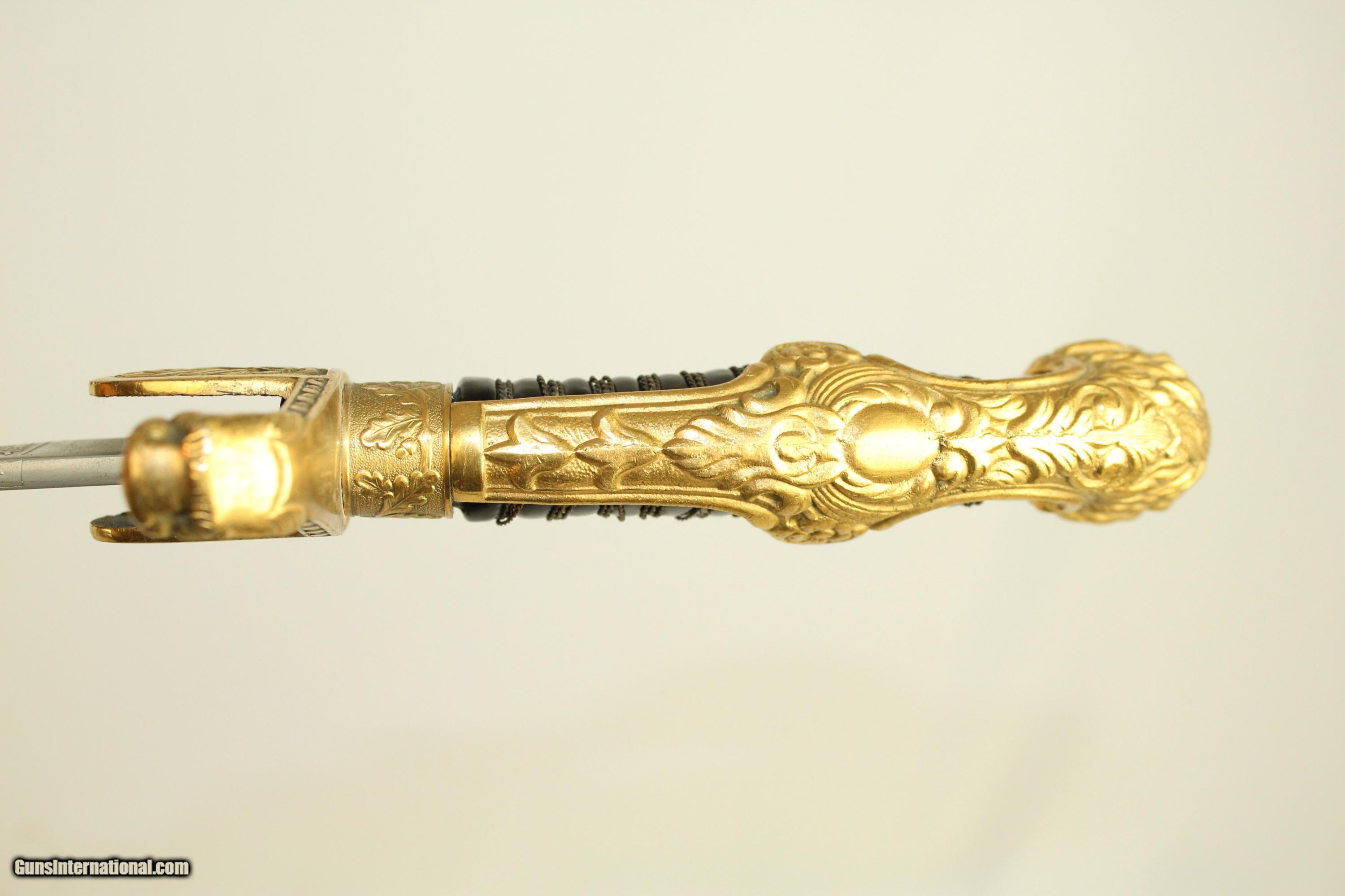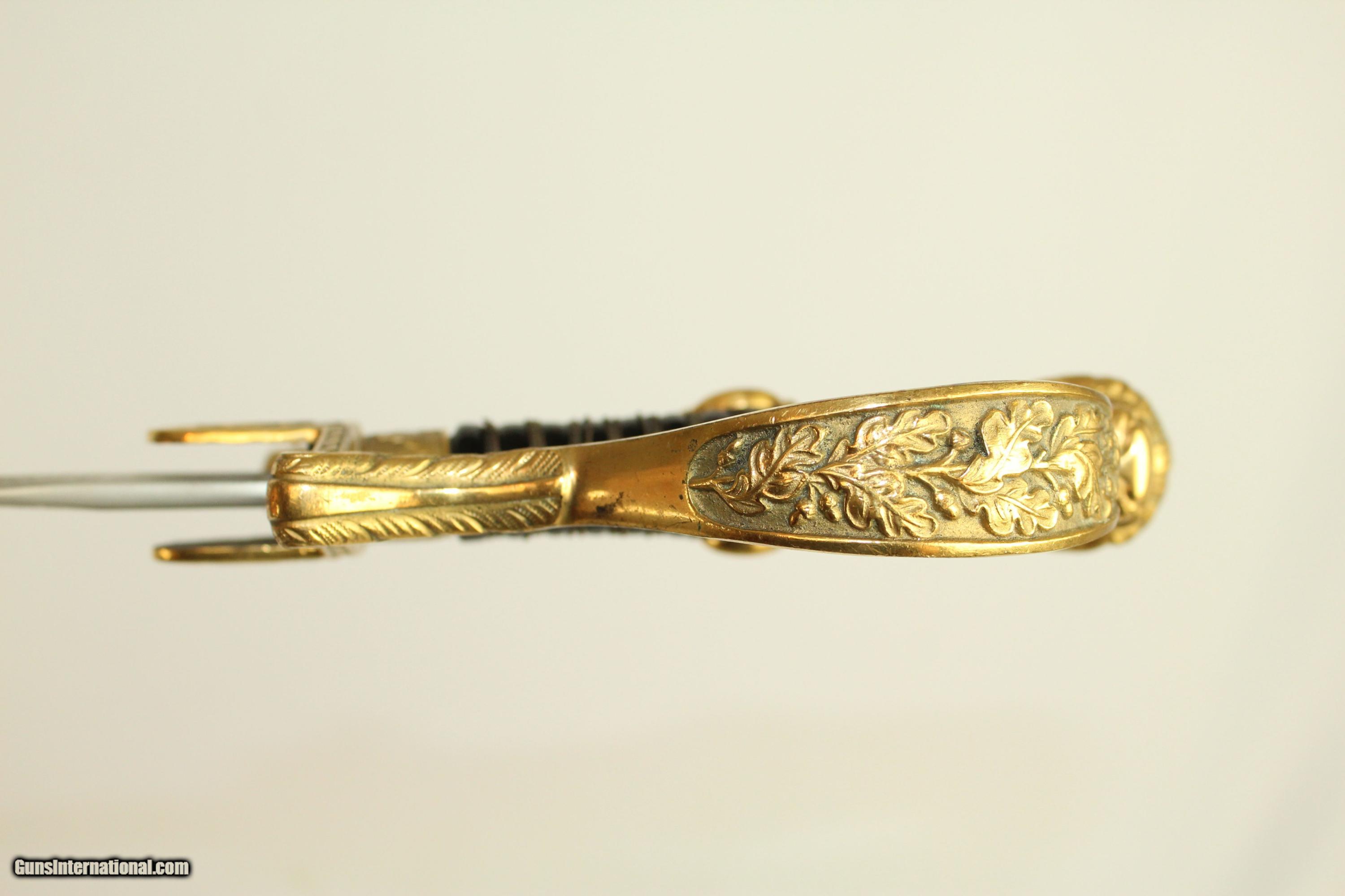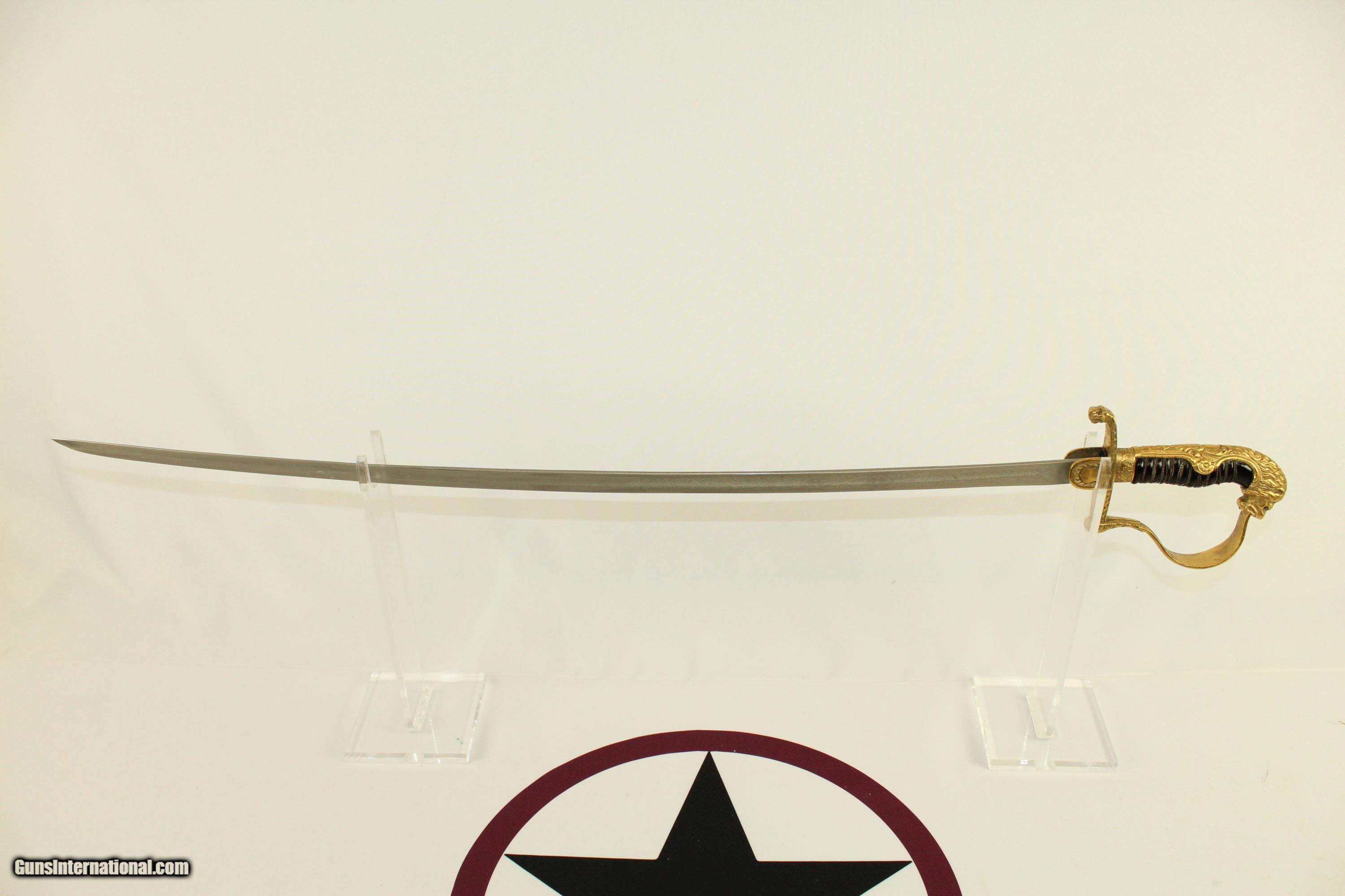 Description: Lion Head IMPERIAL German Officer’s Sword WWI-era Heer Sword with Etched Blade Here we present an antique Imperial German Lion Head Army Officer’s Sword, made in Germany circa the early 1900s. This specimen represents the design of the Heer, the German Army. Perhaps the most eye-catching feature of this sword is the lion head pommel with eyes made of red gems. About 50% of the each side of the blade is nicely etched. The metal scabbard is in very good condition, having wear from obvious carry. The sword itself is in fine condition. Own the original! This is a legitimate antique and not a reproduction. Blade is 30-3/4 inches in length. Overall condition as seen in photos. Very Fast. Very Safe. FREE SHIPPING WORLDWIDE. Delivered directly to your door by express mail! Guaranteed AUTHENTIC & Includes CERTIFICATE OF AUTHENTICITY. ancestryguns $600 #30118 SOLD |