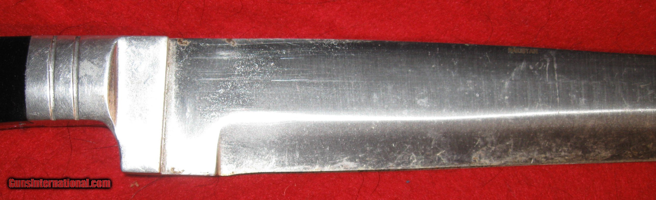 Description: THIS PAKISTANI MADE LONG KNIFE/SHORT SWORD IS 18" OVERALL WITH A 12 1/4" EDGE. THE BLADE HAS A SLIGHT KINK ABOUT HALFWAY DOWN THE BLADE. HARD TO SEE IN PICTURE BUT IT'S THERE. IT'S PRICED ACCORDINGLY. SHIPPING WILL BE ACTUAL COST USPS PRIORITY FIGURED AFTER SALE (WON'T FIT A FLAT RATE BOX) NO HANDLING OR PACKING FEES. SOLD |