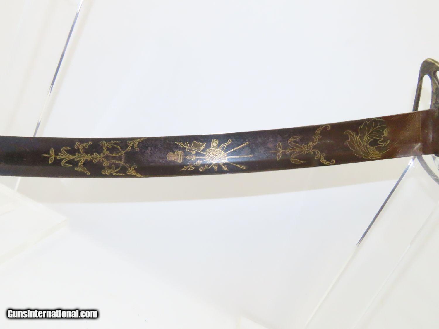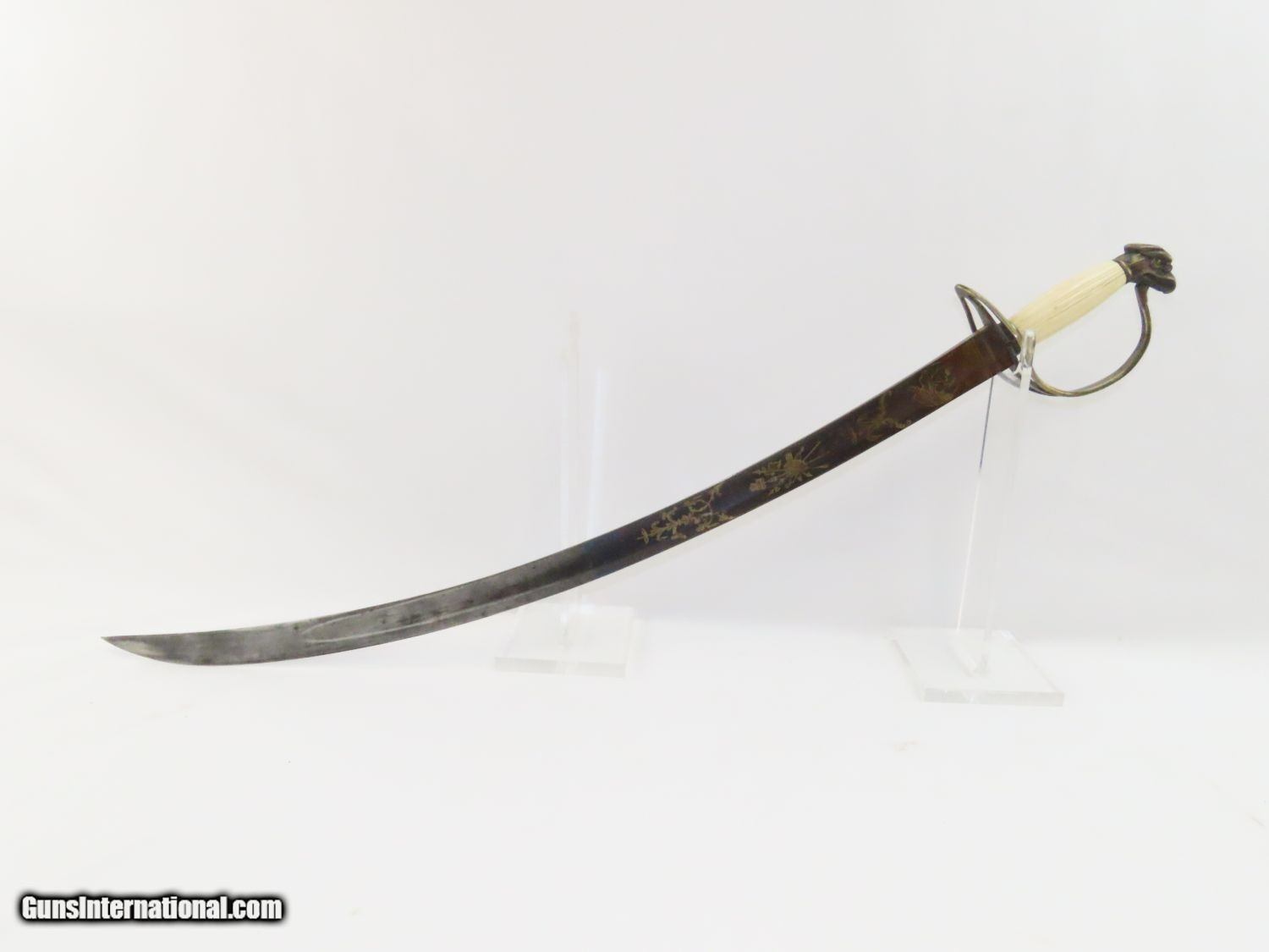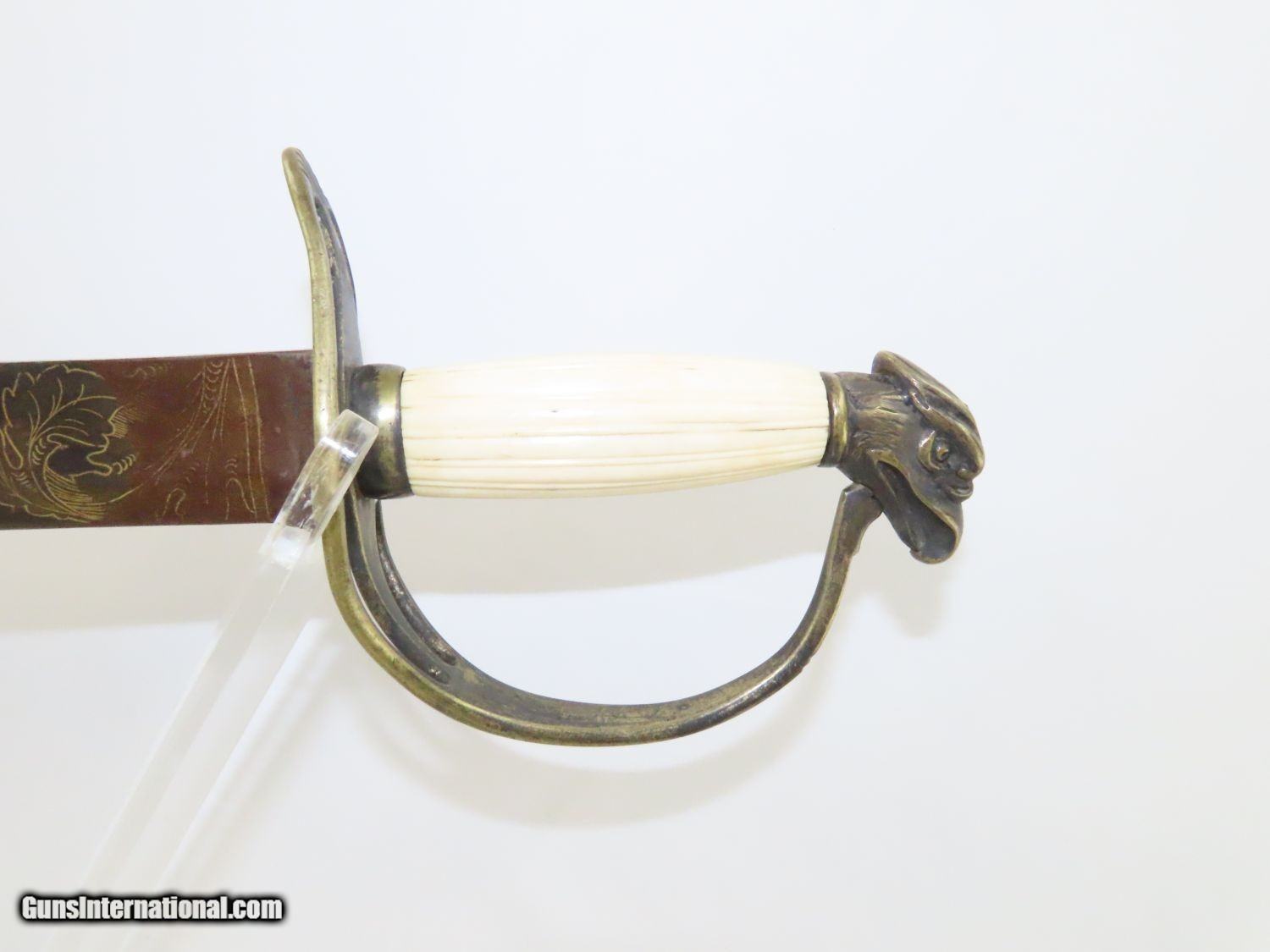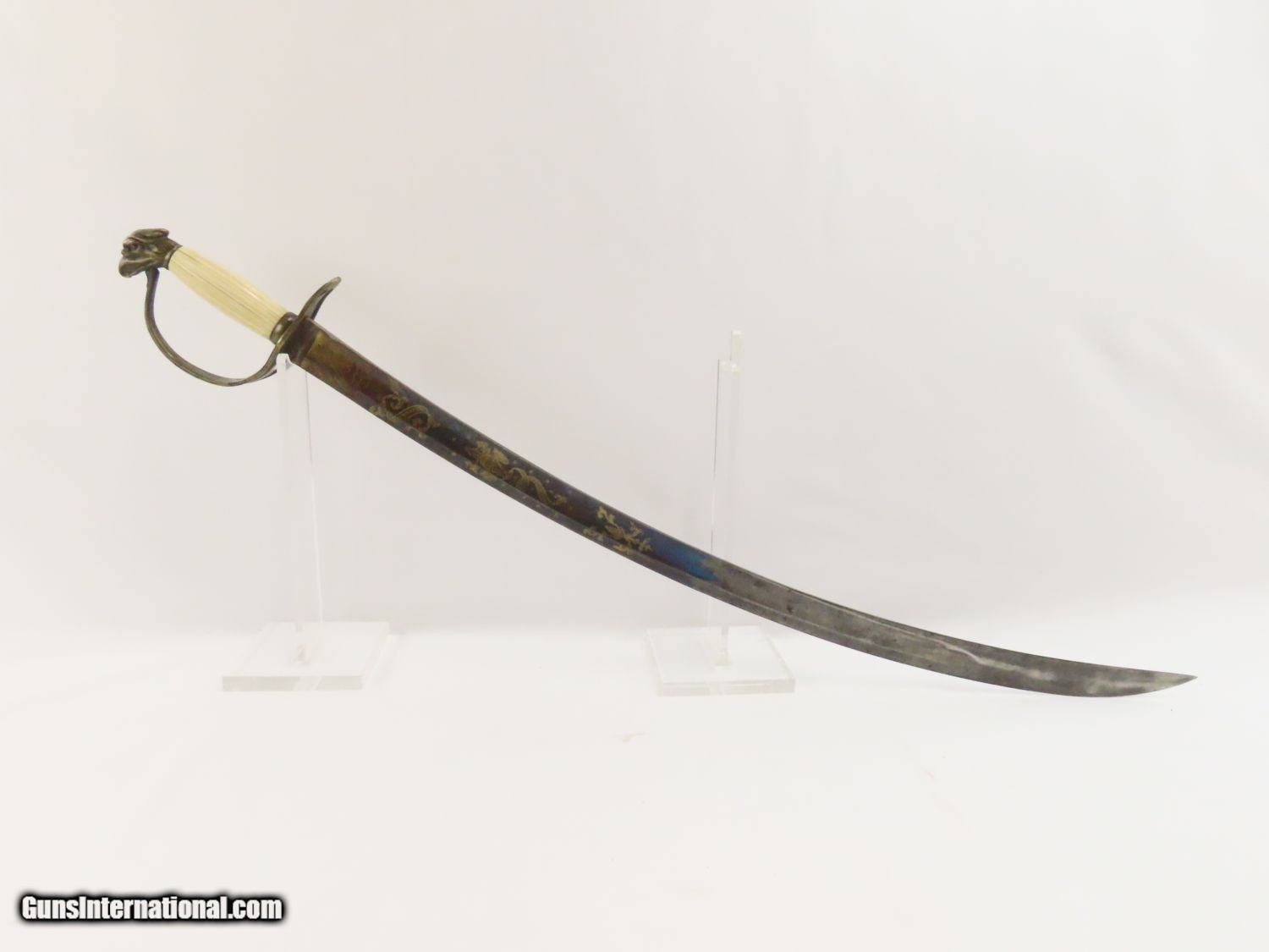 Description: Patriotic EARLY AMERICAN Antique OFFICER’S SABER with EAGLE HEAD POMMEL IVORY Grip, Nitre Blue and GOLD Finish Here we present an early American Officer’s Saber with an Eagle Head Pommel and Ivory Grip. The ‘Eagle Head” sword was popularized during the American Revolutionary War and was one of the signature weapons of the young United States through the War of 1812 and into the 1830s. This saber has an overall length of 33-1/2” with a 28" curved blade with gold-accented etching and nitre blue finished blade and an ivory grip. The scabbard is of leather. The overall condition is very good. The blade has retained much of its original blue finish and is adorned with gold inlayed U.S. symbolism. The leather scabbard is missing the drag/chape exposing the blade’s tip when sheathed. The scabbard is in good condition but is fragile. This is a stunning piece of American history! Own the original! This is a legitimate antique and not a reproduction. Overall condition as seen in photos. Very Fast. Very Safe. FREE SHIPPING WORLDWIDE. Delivered directly to your door by express mail! Guaranteed AUTHENTIC & Includes CERTIFICATE OF AUTHENTICITY. ancestryguns $1675 #200837 SOLD Antique: Yes |