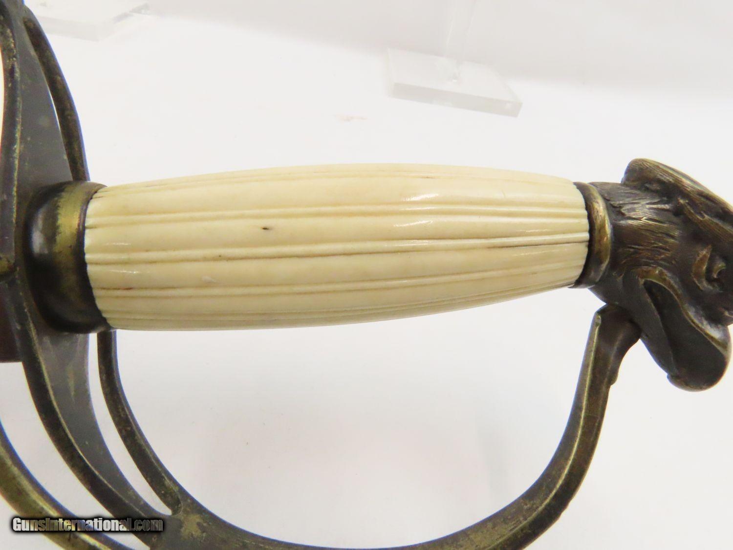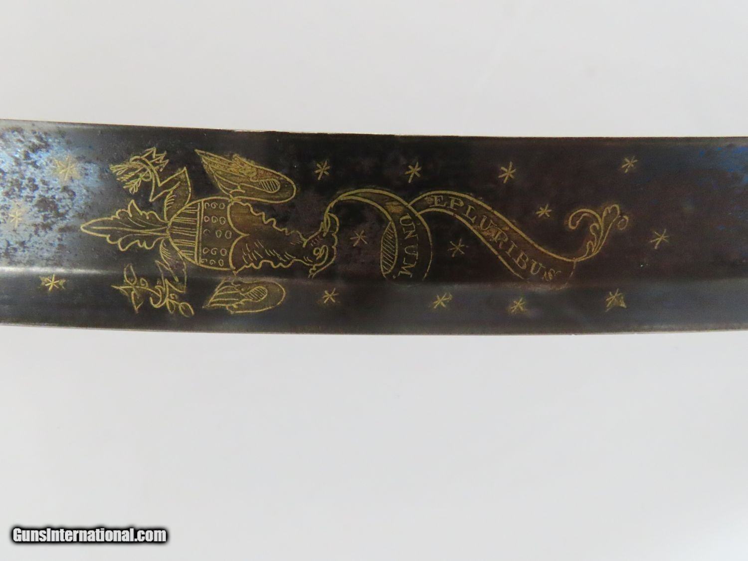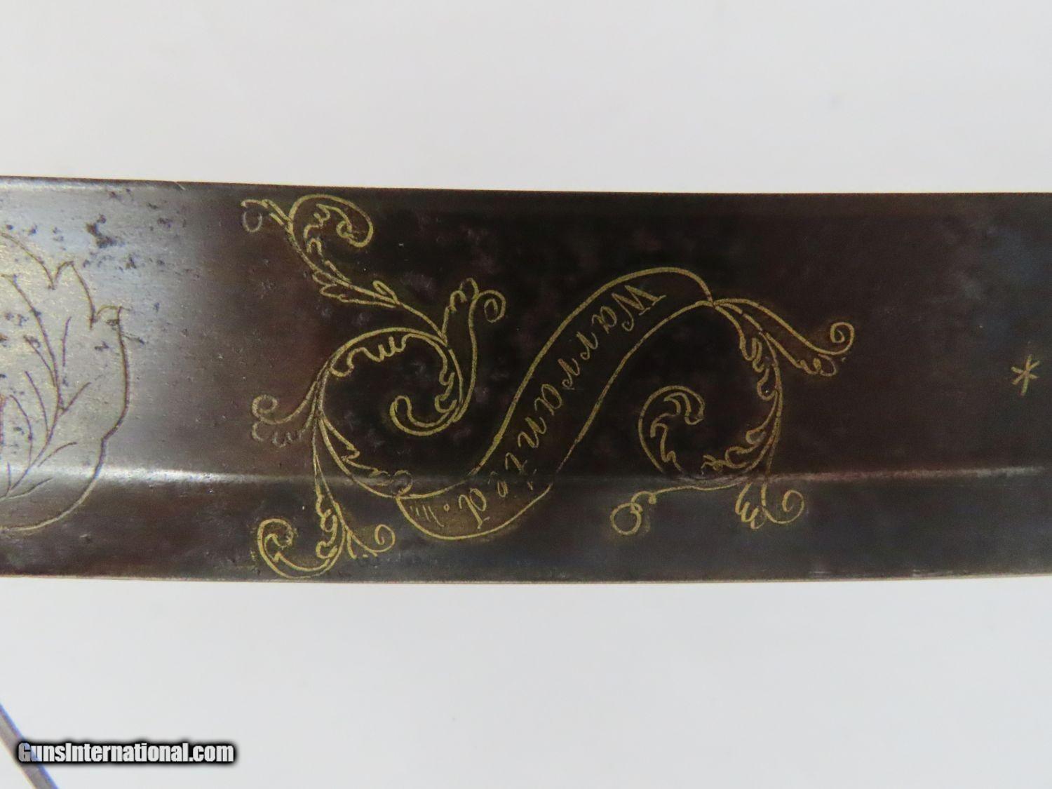 Description: Patriotic EARLY AMERICAN Antique OFFICER’S SABER with EAGLE HEAD POMMEL IVORY Grip, Nitre Blue and GOLD Finish Here we present an early American Officer’s Saber with an Eagle Head Pommel and Ivory Grip. The ‘Eagle Head” sword was popularized during the American Revolutionary War and was one of the signature weapons of the young United States through the War of 1812 and into the 1830s. This saber has an overall length of 33-1/2” with a 28" curved blade with gold-accented etching and nitre blue finished blade and an ivory grip. The scabbard is of leather. The overall condition is very good. The blade has retained much of its original blue finish and is adorned with gold inlayed U.S. symbolism. The leather scabbard is missing the drag/chape exposing the blade’s tip when sheathed. The scabbard is in good condition but is fragile. This is a stunning piece of American history! Own the original! This is a legitimate antique and not a reproduction. Overall condition as seen in photos. Very Fast. Very Safe. FREE SHIPPING WORLDWIDE. Delivered directly to your door by express mail! Guaranteed AUTHENTIC & Includes CERTIFICATE OF AUTHENTICITY. ancestryguns $1675 #200837 SOLD Antique: Yes |