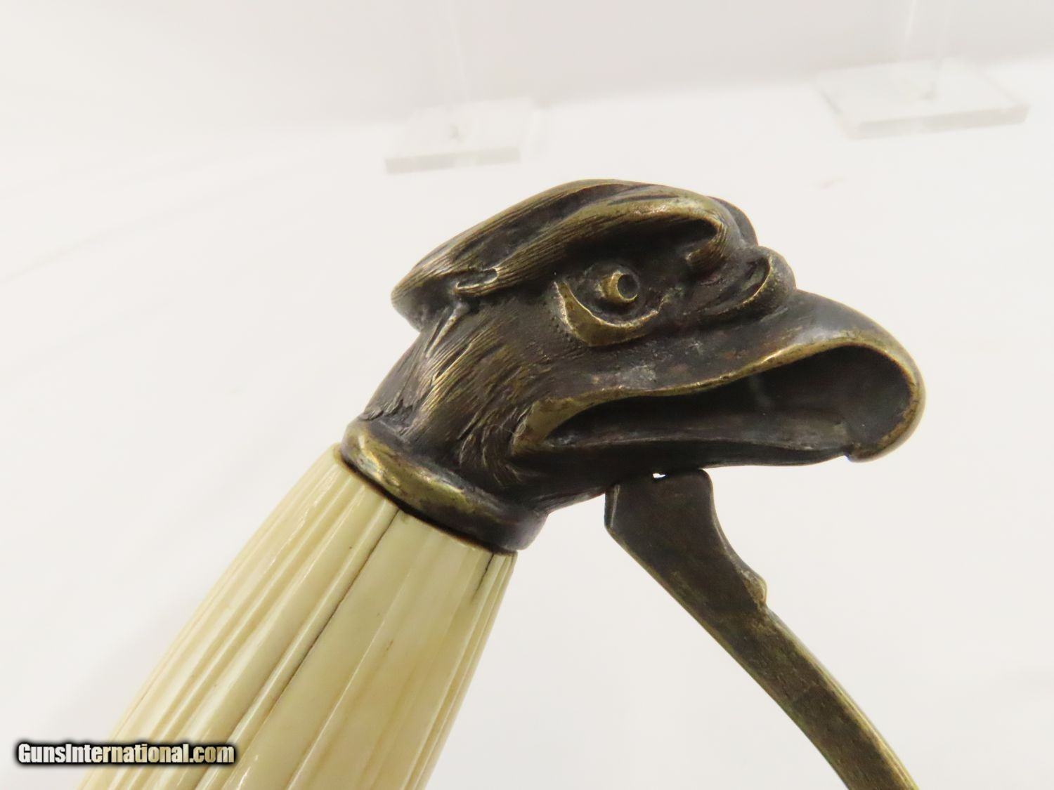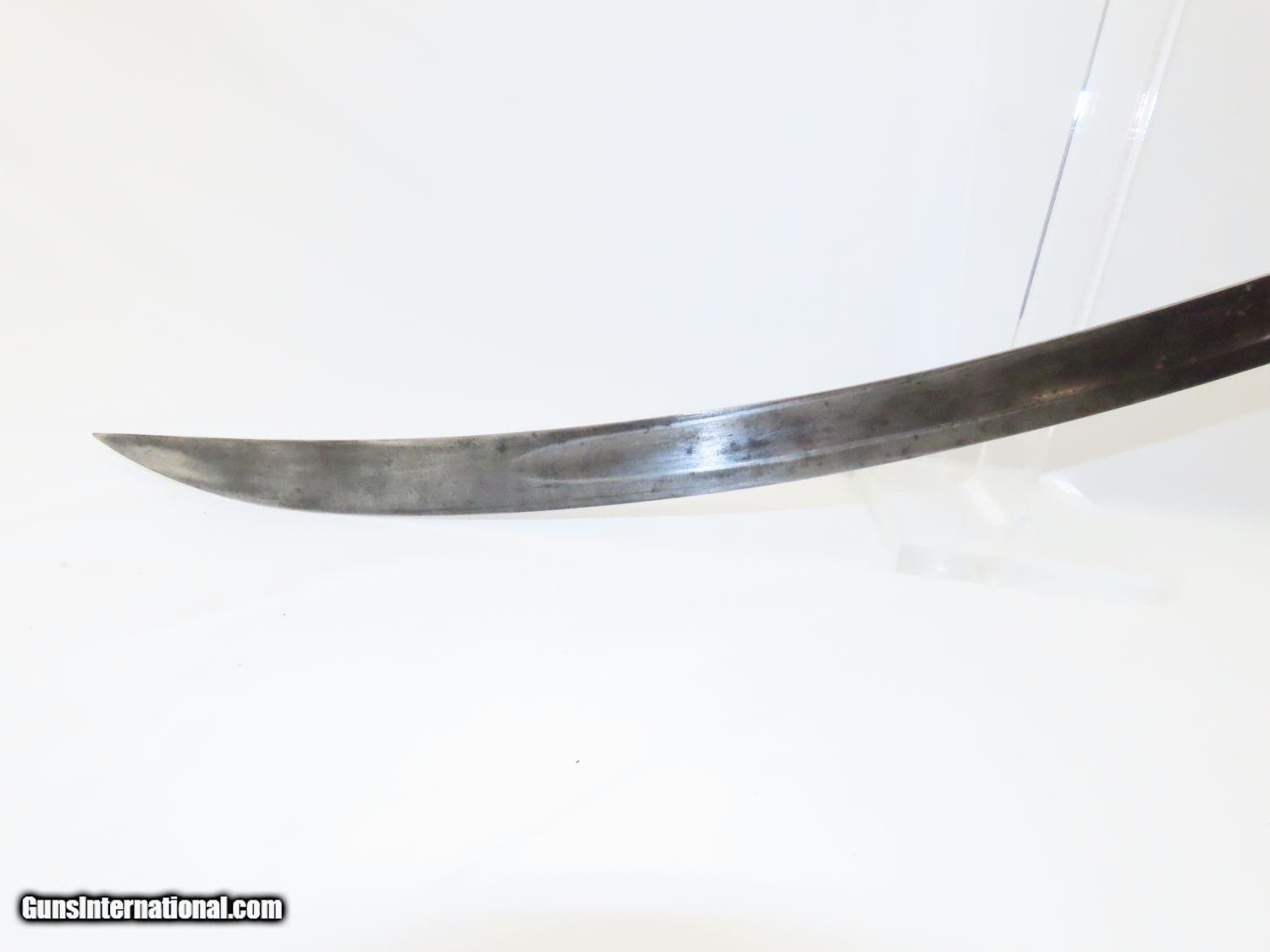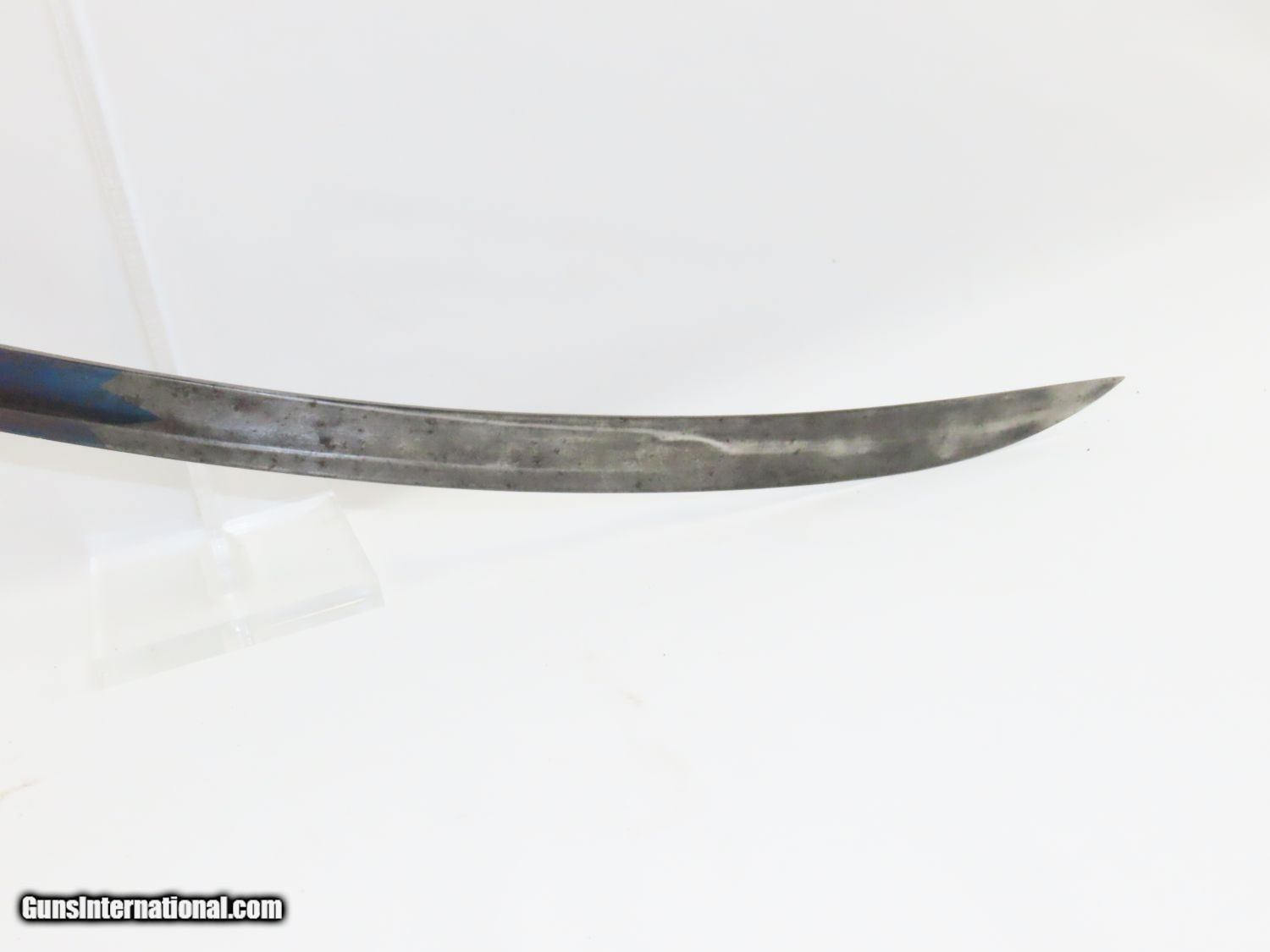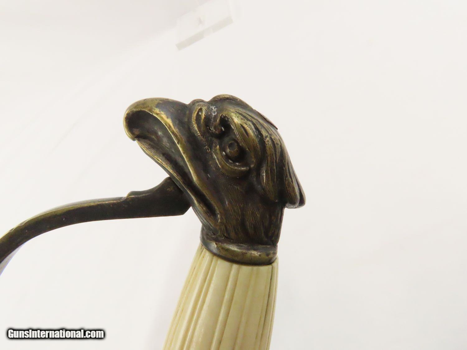 Description: Patriotic EARLY AMERICAN Antique OFFICER’S SABER with EAGLE HEAD POMMEL IVORY Grip, Nitre Blue and GOLD Finish Here we present an early American Officer’s Saber with an Eagle Head Pommel and Ivory Grip. The ‘Eagle Head” sword was popularized during the American Revolutionary War and was one of the signature weapons of the young United States through the War of 1812 and into the 1830s. This saber has an overall length of 33-1/2” with a 28" curved blade with gold-accented etching and nitre blue finished blade and an ivory grip. The scabbard is of leather. The overall condition is very good. The blade has retained much of its original blue finish and is adorned with gold inlayed U.S. symbolism. The leather scabbard is missing the drag/chape exposing the blade’s tip when sheathed. The scabbard is in good condition but is fragile. This is a stunning piece of American history! Own the original! This is a legitimate antique and not a reproduction. Overall condition as seen in photos. Very Fast. Very Safe. FREE SHIPPING WORLDWIDE. Delivered directly to your door by express mail! Guaranteed AUTHENTIC & Includes CERTIFICATE OF AUTHENTICITY. ancestryguns $1675 #200837 SOLD Antique: Yes |