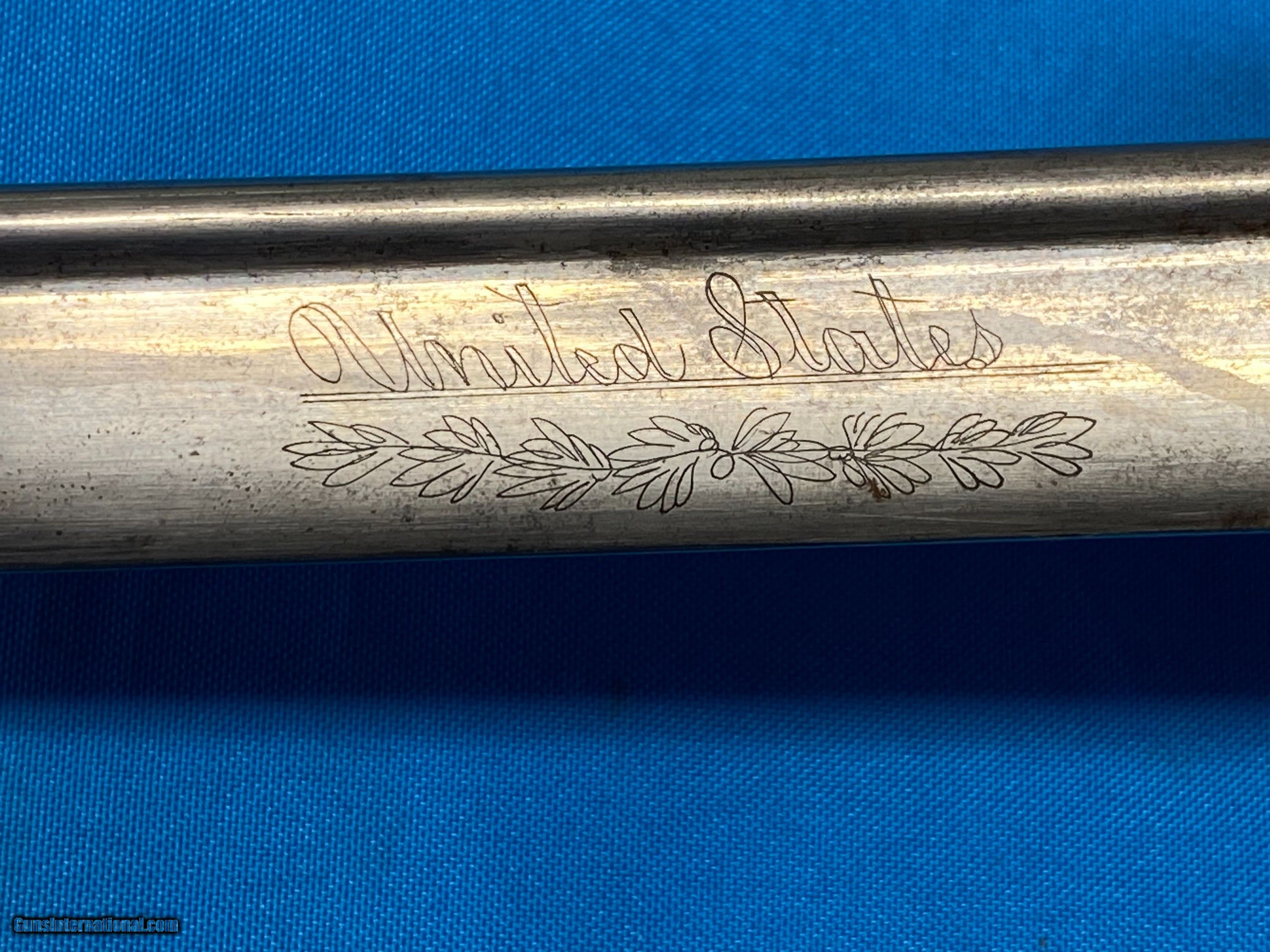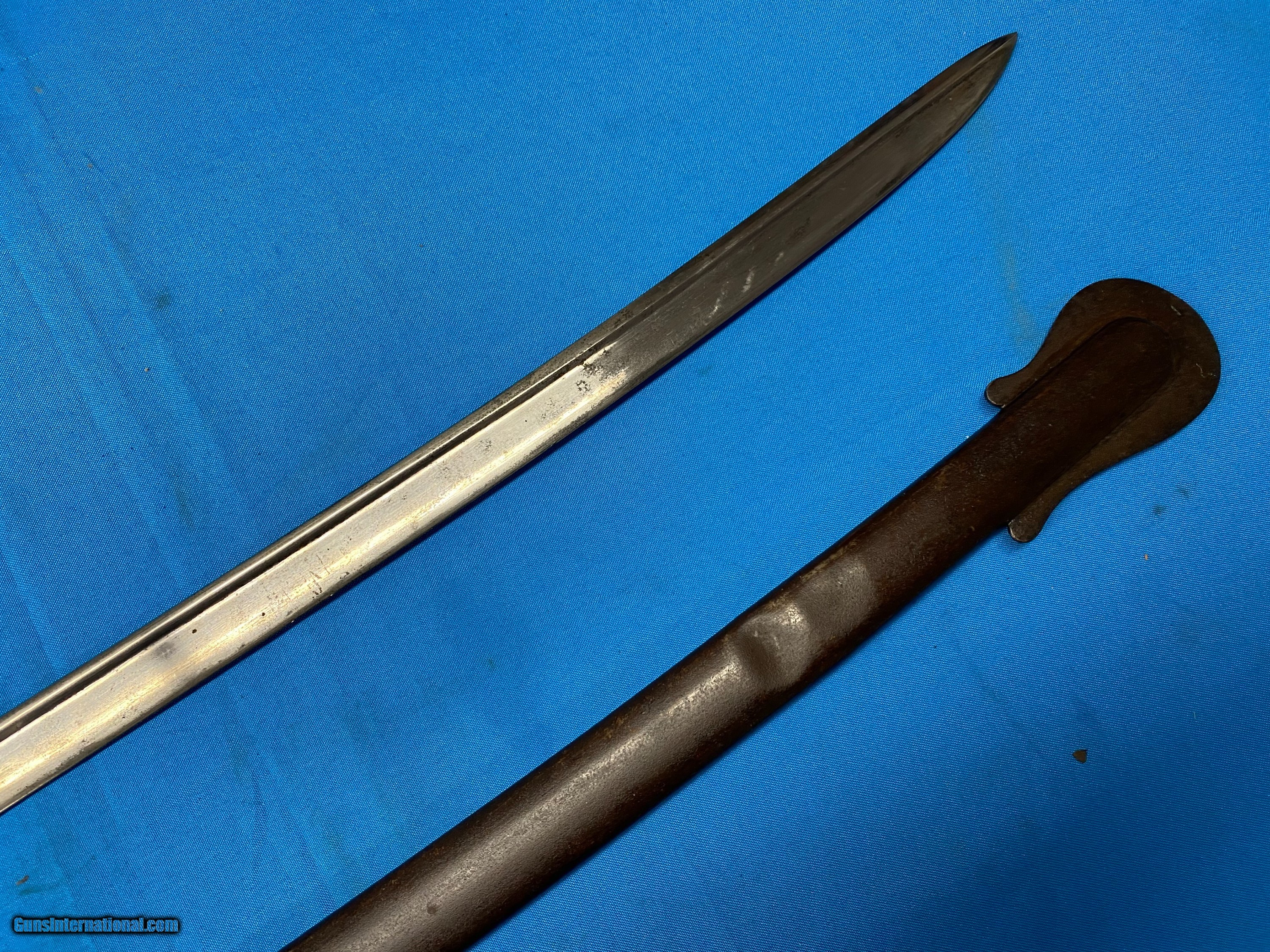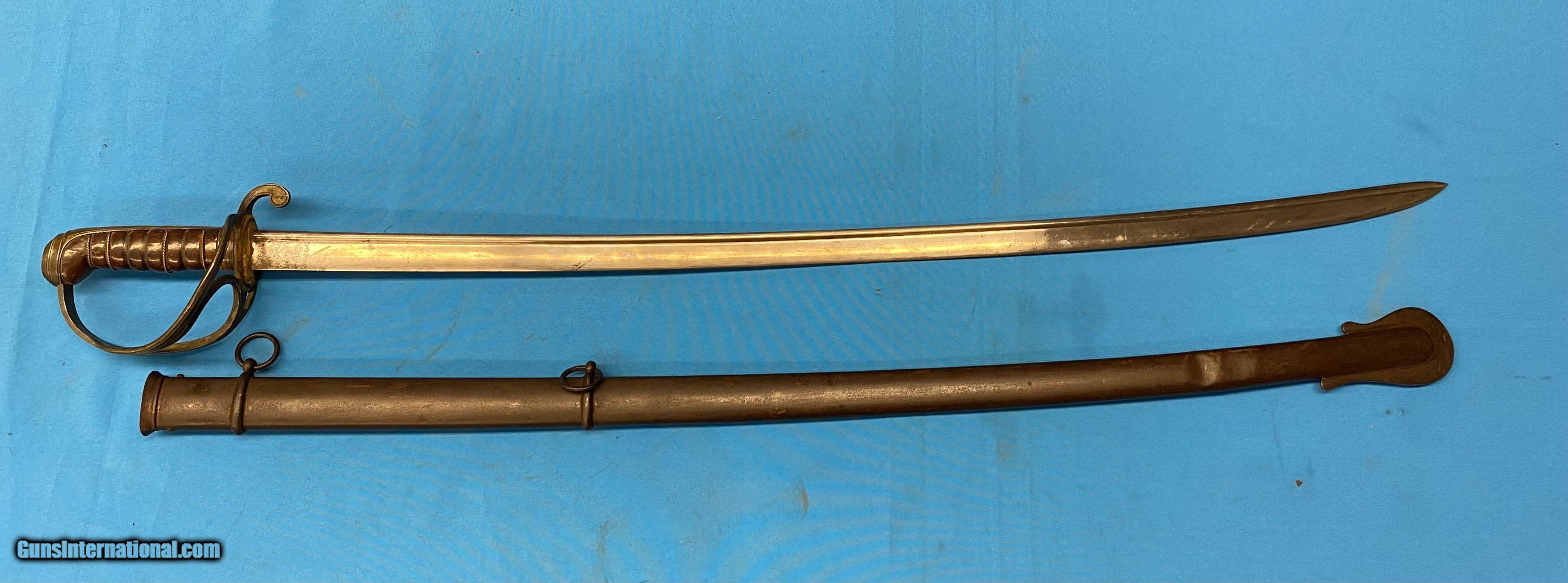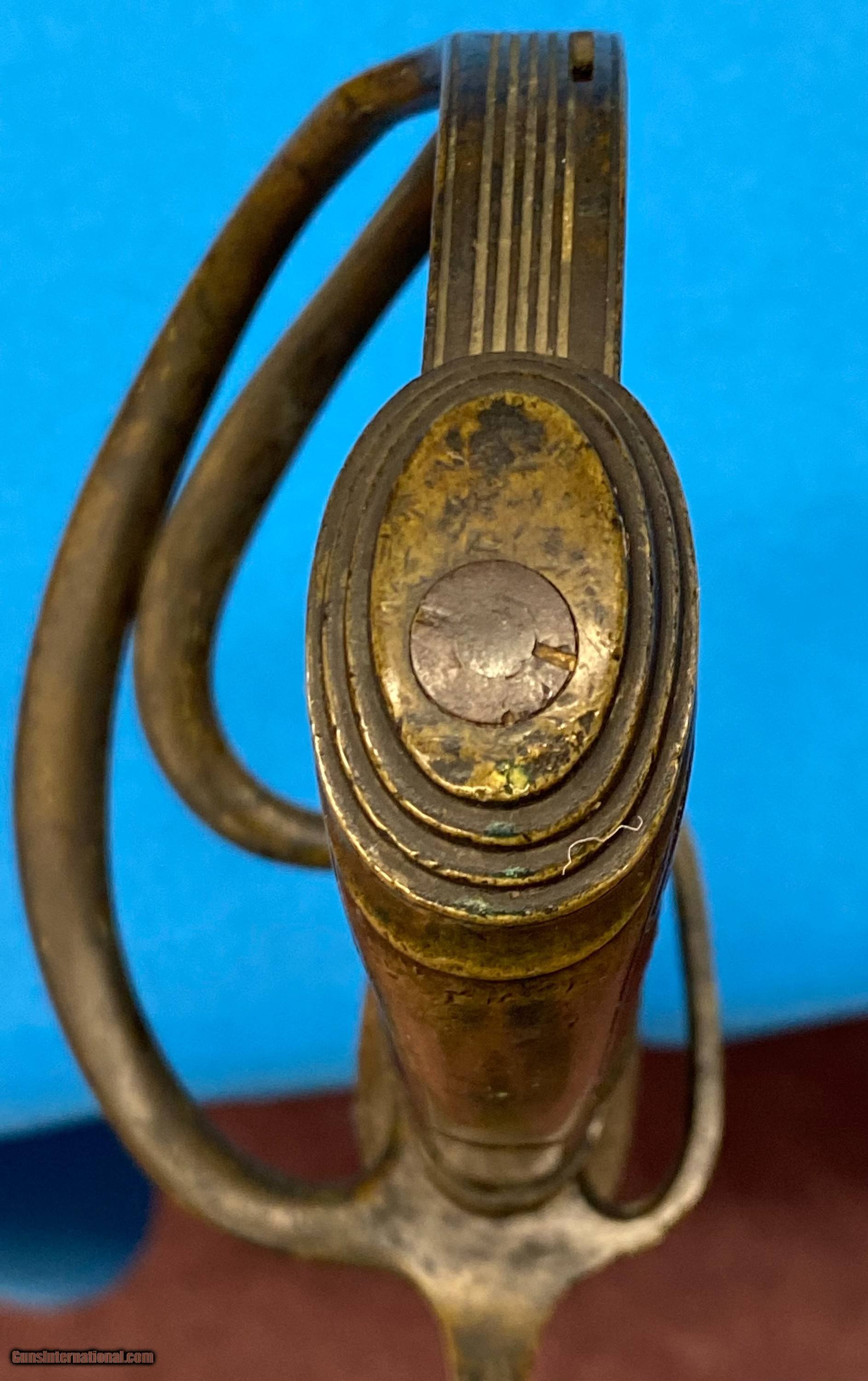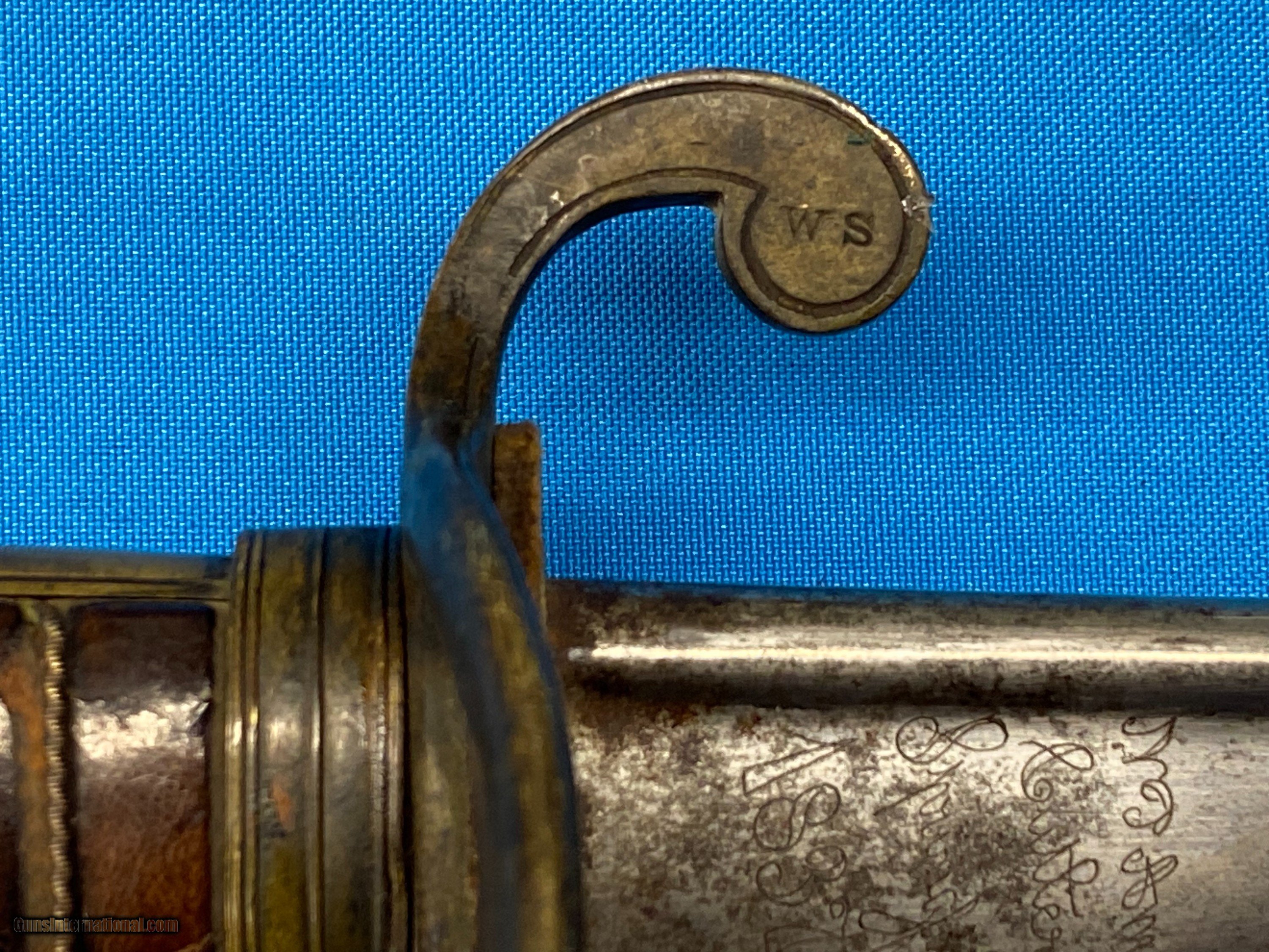 Description: This is an excellent example of the U.S. Cavalry’s first standard issued saber, the Model 1833. This saber is dated 1837 and was produced by the legendary N.P. Ames Cutler of Springfield in 1837 during the “Frontier Wars”, also known as the Indian Wars. In 1833, the U.S. Army formed its first official mounted regiments, the First and Second Dragoons. These soldiers rode into battle, and then dismounted to fight, the beginning of the United States Cavalry. Until then the only mounted units available to the nation were state and local mounted militia, often equipped with surplus older-model sabers, as per the 1808 “Act for Arming and Equipping the Whole Body of the Militia of the United States.” The blades, largely from government stores, including 20,000 Nathan Starr sabers contracted between 1812 and 1818 (with final delivery made in 1822), served as American horse soldiers’ primary weapons for decades. From 1834 through 1839, the government contracted with the N.P. Ames Company for 6,100 Model 1833 Dragoon sabers, which were based on the Pattern 1822 British Officers’ Light Cavalry Saber. Soon after the sabers were issued, American soldiers complained that the weapon was altogether too light, and that the blade itself was not suitable for a good thrust. Further, the scabbard was prone to being dented or bent, all legitimate grievances for men whose lives depended on the weapons. Sometime during its short production life, Ames increased the 1833 Dragoon sabers’ weight from 13½ ounces to 19½ ounces, while the blade’s 34-inch length was not changed in any way; the scabbard was lengthened from 35 inches to 36 inches. This blade is almost exactly 34” in length while the scabbard is 35” and is one of the earlier produced ones. While not as durable as desired, the 1833 Dragoon saber was expertly finished with a gleaming brass hilt with a knuckle bow and two-branch guard, and a pommel topped with a recessed slotted nut that facilitated replacement of broken blades in the field, all of which is present and correct on this example. The handles on enlisted sabers were wrapped in black leather with seven rows of twisted brass-wire wrapping which three are no longer present unfortunately on this handle. The leather wrap is still present on the handle but is now worn to an almost brown color. Blades were etched “N.P. AMES, CUTLER, SPRINGFIELD,” along with the date of manufacture, ranging from as early as 1834 to as late as 1840. The etching on the ricasso is still present and able to be read properly with a date of 1837. The opposite side of the blade has a lovely script etching that reads as United States. The U.S. sub inspector’s initials “W.S. is stamped on the quillon on the brass guard. The blade is still surprisingly bright and in very nice condition. The scabbard is steel and made with a flared trumpet- style throat, narrow saber strap ring bands with key rings. The finish is almost completely gone and the color now presents itself as being a darkened brown with surface oxidation as well as past pitting. There are two bends one on each side of the scabbard at the bottom. These bends were intentionally done to keep the sword from rattling when riding. This is an incredible, rare example of the US Cavalry’s first official saber SOLD |