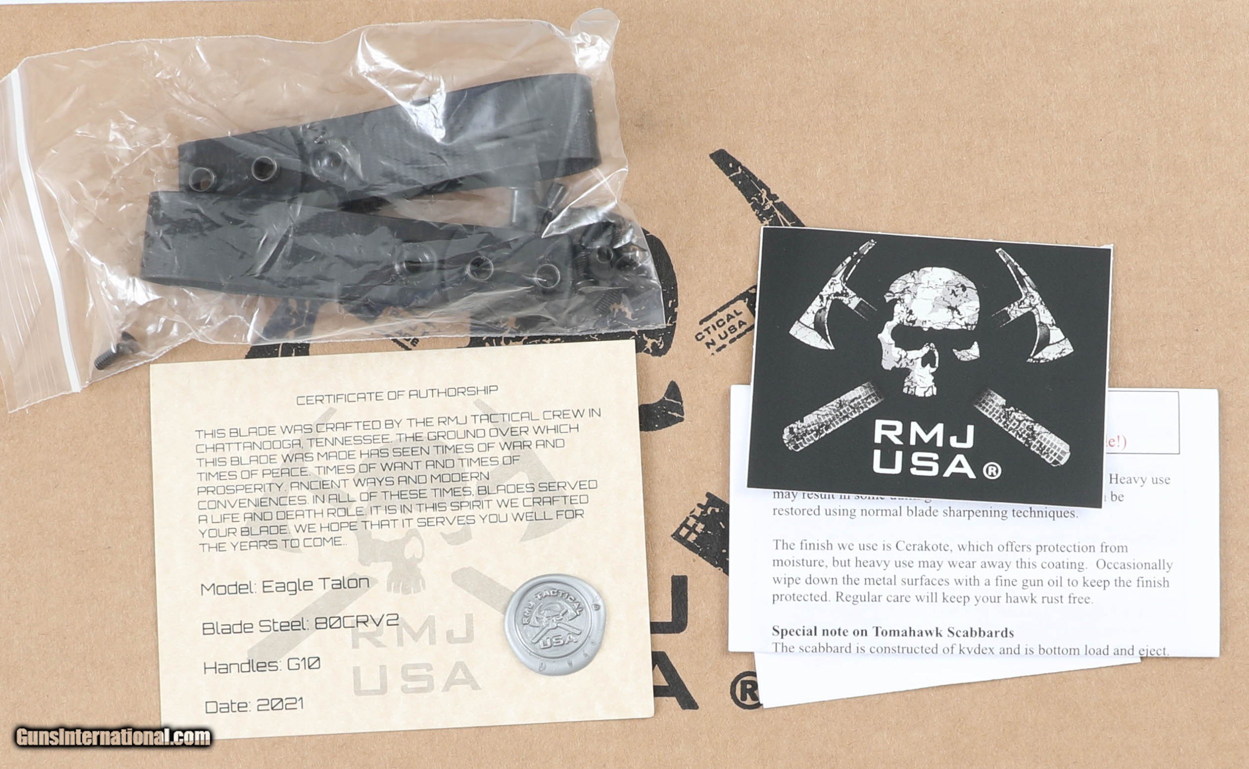Description: The Eagle Talon draws inspiration from 18th Century fighting tomahawks but in the form of a fully modern, high-tech production. The result is an integral (one-piece) steel construction with incredible styling and durability. Its .400"-thick 80CrV2 steel runs from the head through the handle which is flanked by long, textured G-10 grips. The 7" axe head has a sharpened front edge and comes to a strong point at the opposite end. The tomahawk comes with a molded kydex sheath and two low-ride M.O.C. straps. Overall Length: 18" Blade Length: 7" Cutting Edge: 2.875" Blade Steel: 80CrV2 Blade Hardness: 57-58HRC Blade Thickness: .400" Weight: 1 pound 15 ounces SOLD |