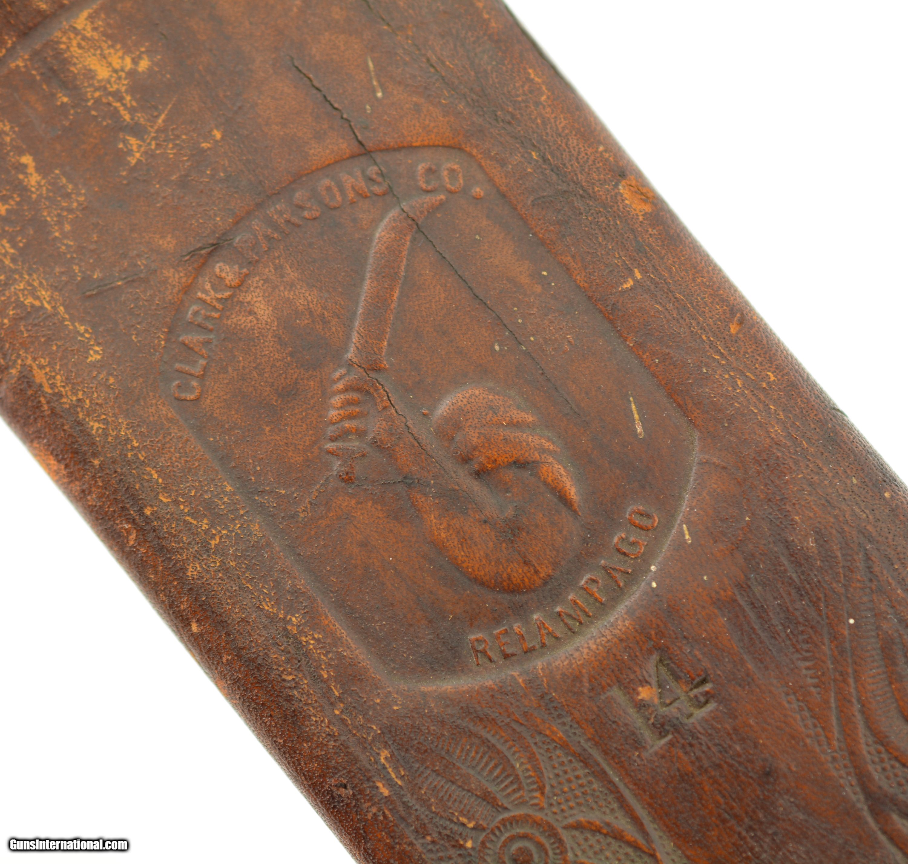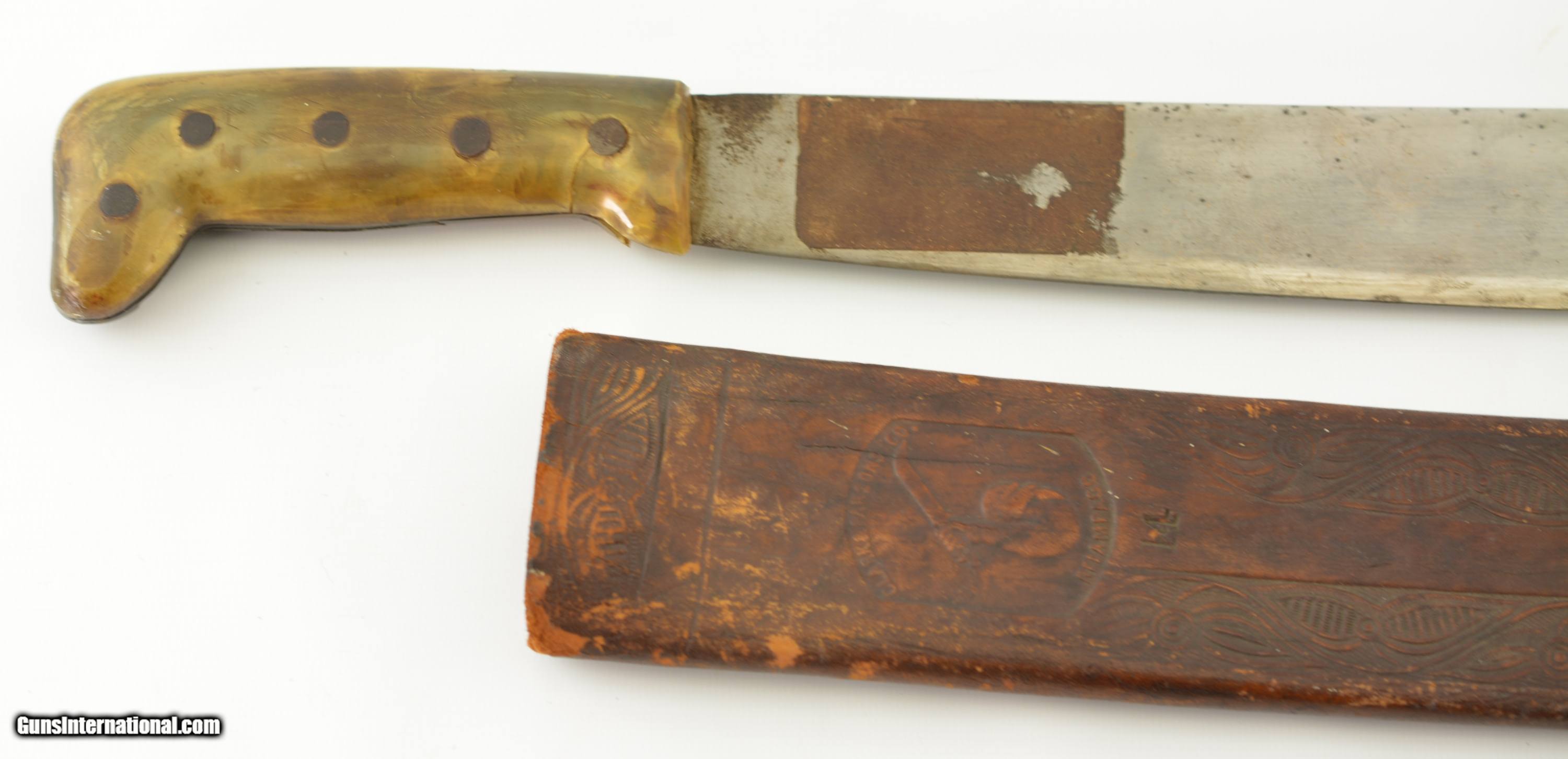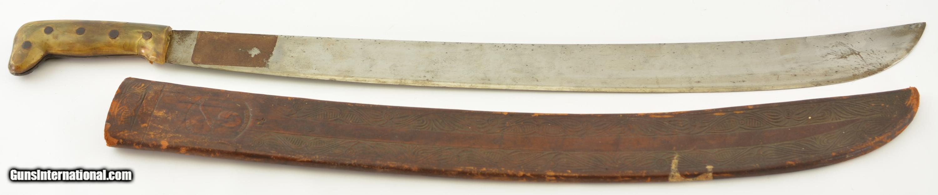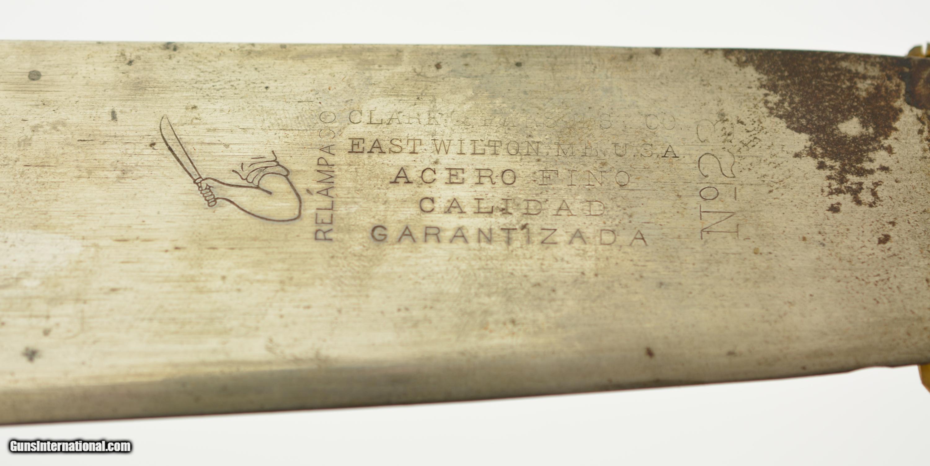 Description: This is a No. 23 Machete manufactured by Clark & Parsons Co. in East Wilton, Maine. This scarce machete was made between 1894 and 1904 after which the company was bought out by Dunn Edge Tool of Oakland, Maine. Very well made it measures 29 3/4" overall with a rugged 24 1/2" blade marked in a similar fashion to the famous Collins machetes: "Clark & Parsons Co. / East Wilton, ME U.S.A. / Acero Fino / Calidad / Garantizada" with arm and machete logo over "Relampago". It has a five rivet horn handle that is now missing a piece below the bottom rivet on the left grip panel and comes in a fancy leather scabbard with the company logo over "14" and is in very good condition with wear along the throat and tip which has a small hole. A seldom encountered, well made machete that was heavily sold in Cuba and made in Maine. SOLD |