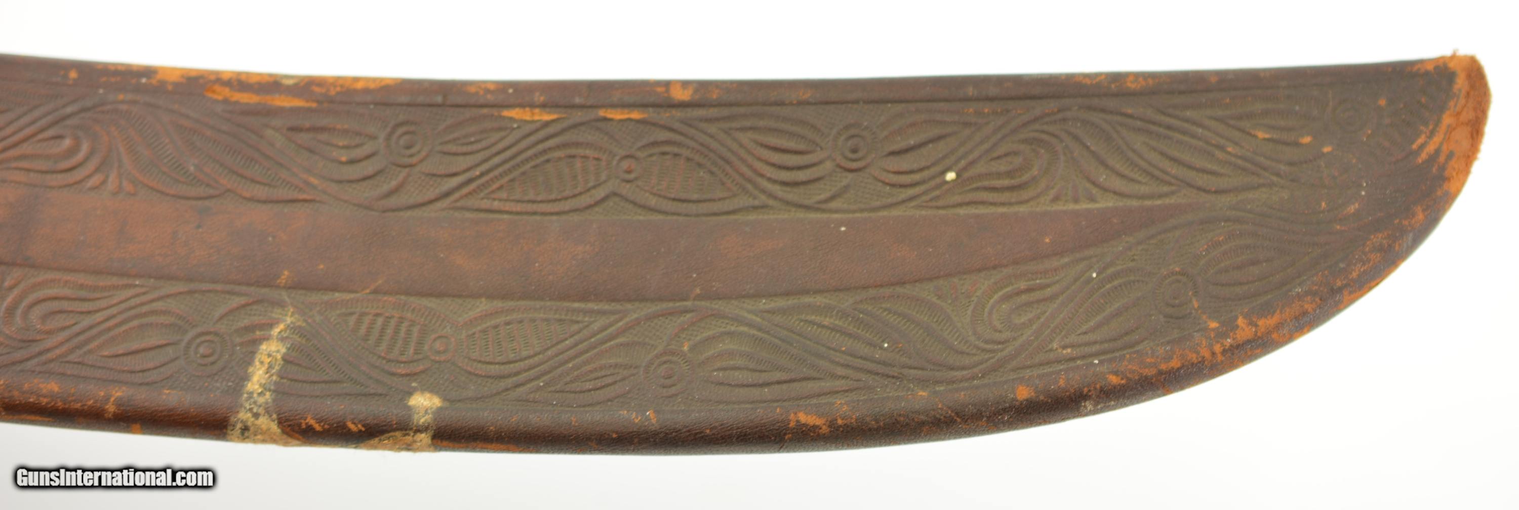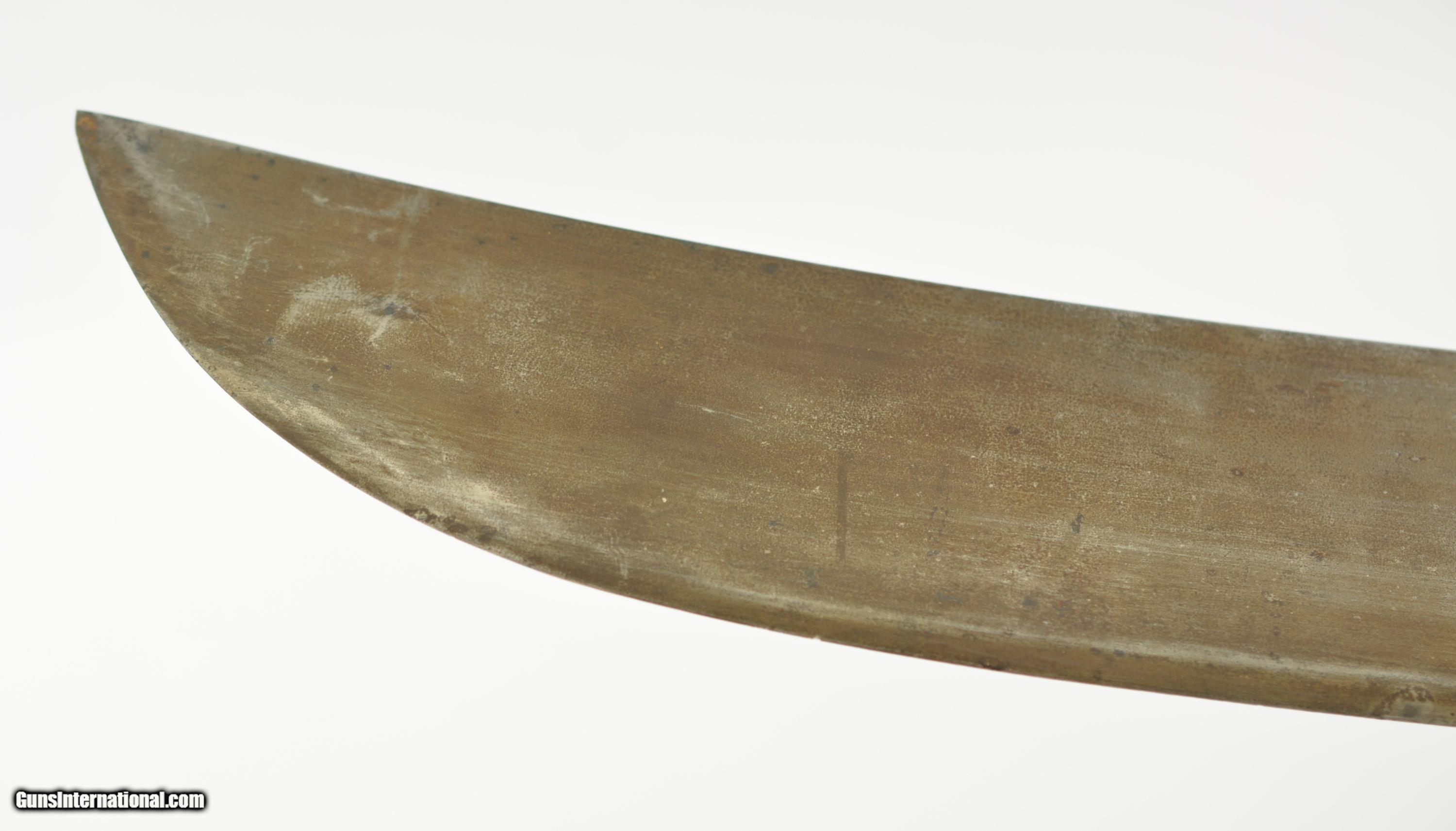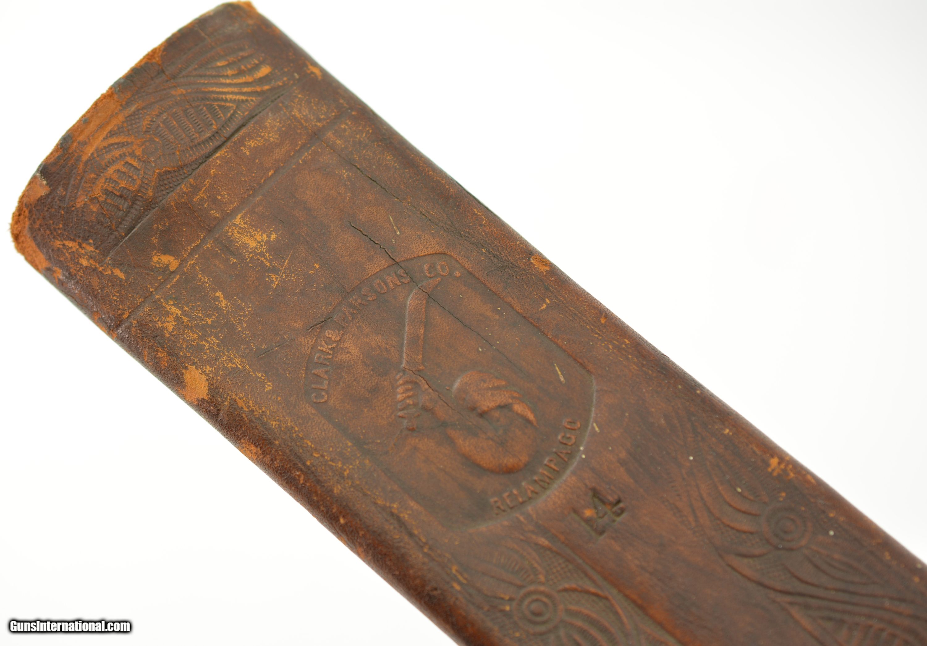 Description: This is a No. 23 Machete manufactured by Clark & Parsons Co. in East Wilton, Maine. This scarce machete was made between 1894 and 1904 after which the company was bought out by Dunn Edge Tool of Oakland, Maine. Very well made it measures 29 3/4" overall with a rugged 24 1/2" blade marked in a similar fashion to the famous Collins machetes: "Clark & Parsons Co. / East Wilton, ME U.S.A. / Acero Fino / Calidad / Garantizada" with arm and machete logo over "Relampago". It has a five rivet horn handle that is now missing a piece below the bottom rivet on the left grip panel and comes in a fancy leather scabbard with the company logo over "14" and is in very good condition with wear along the throat and tip which has a small hole. A seldom encountered, well made machete that was heavily sold in Cuba and made in Maine. SOLD |