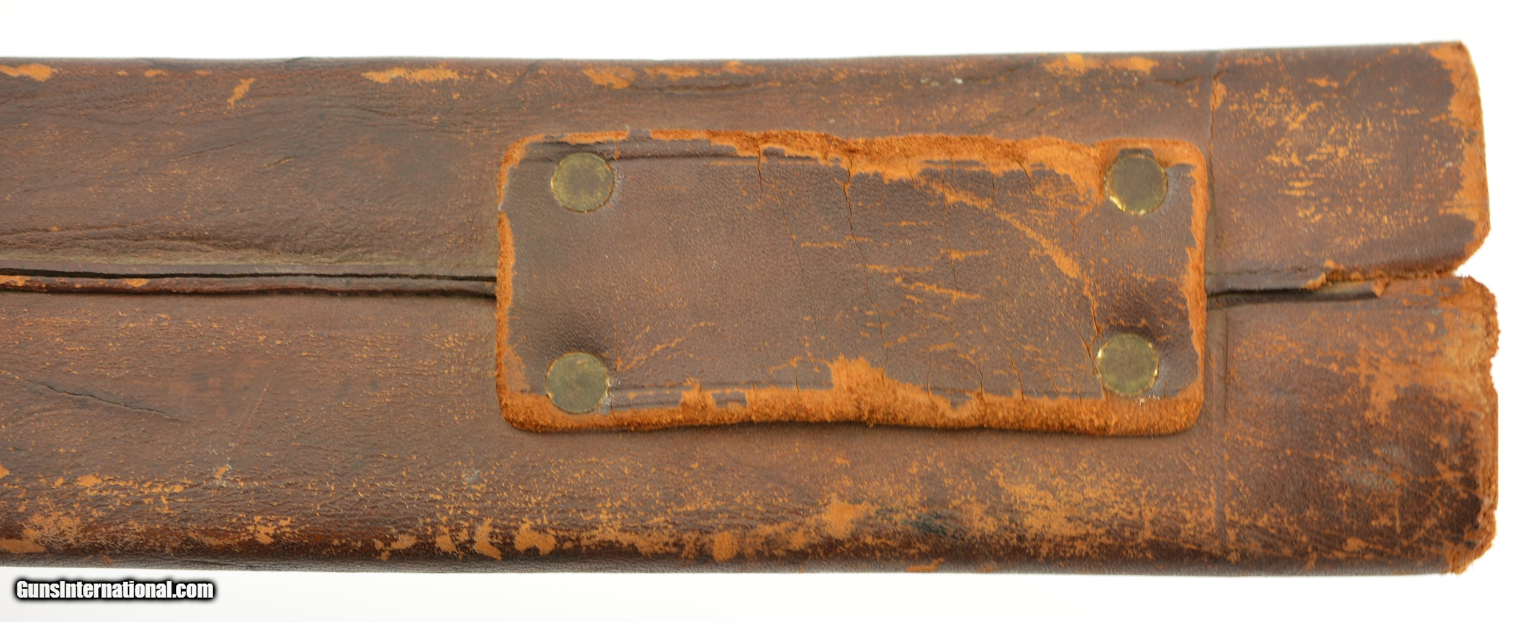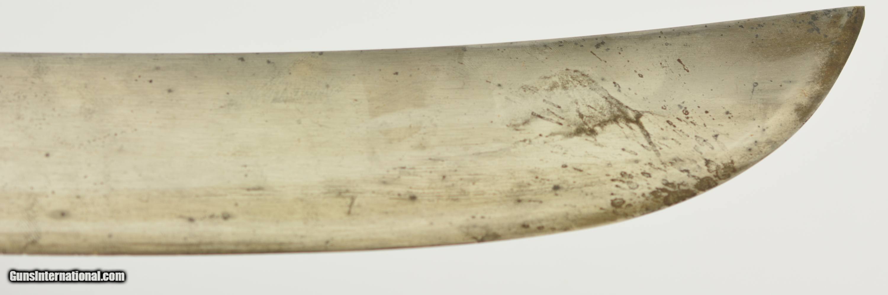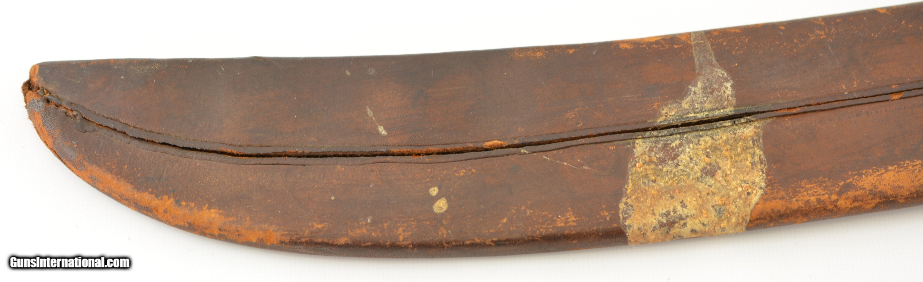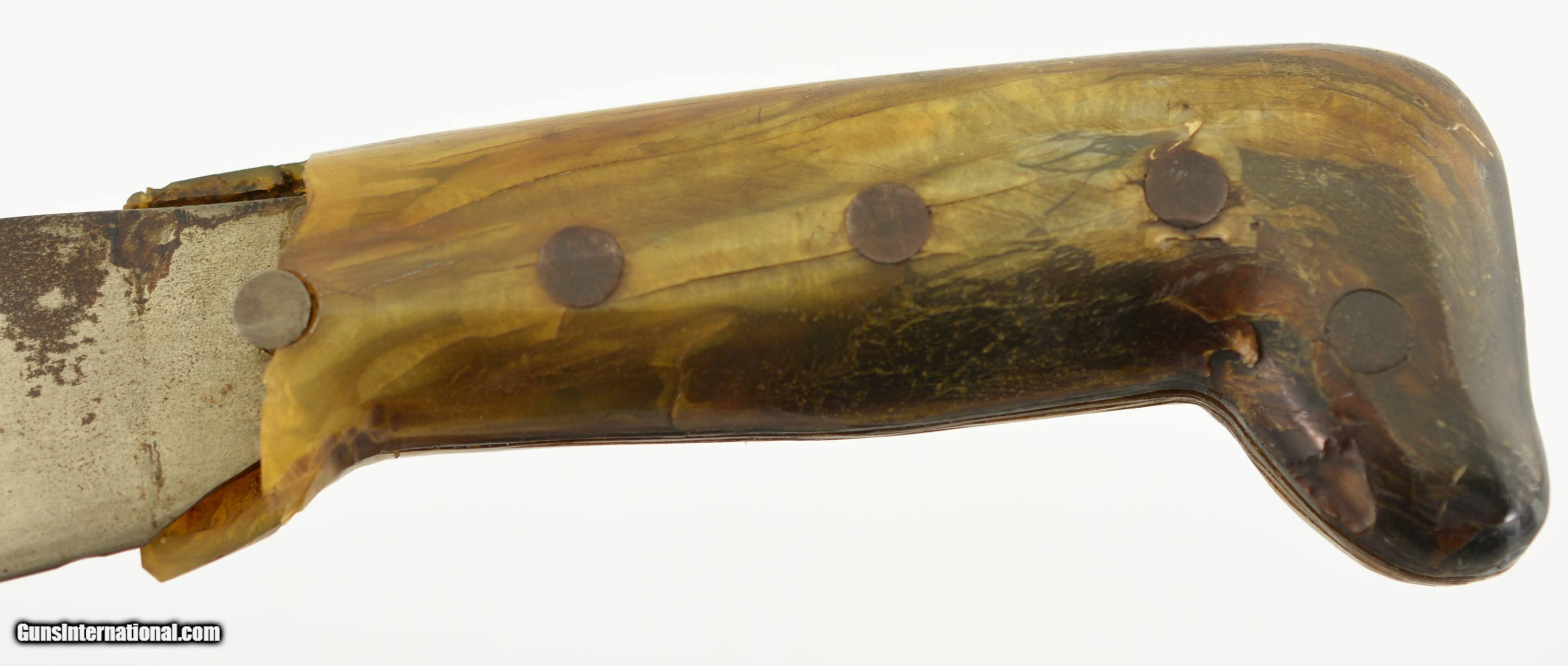 Description: This is a No. 23 Machete manufactured by Clark & Parsons Co. in East Wilton, Maine. This scarce machete was made between 1894 and 1904 after which the company was bought out by Dunn Edge Tool of Oakland, Maine. Very well made it measures 29 3/4" overall with a rugged 24 1/2" blade marked in a similar fashion to the famous Collins machetes: "Clark & Parsons Co. / East Wilton, ME U.S.A. / Acero Fino / Calidad / Garantizada" with arm and machete logo over "Relampago". It has a five rivet horn handle that is now missing a piece below the bottom rivet on the left grip panel and comes in a fancy leather scabbard with the company logo over "14" and is in very good condition with wear along the throat and tip which has a small hole. A seldom encountered, well made machete that was heavily sold in Cuba and made in Maine. SOLD |