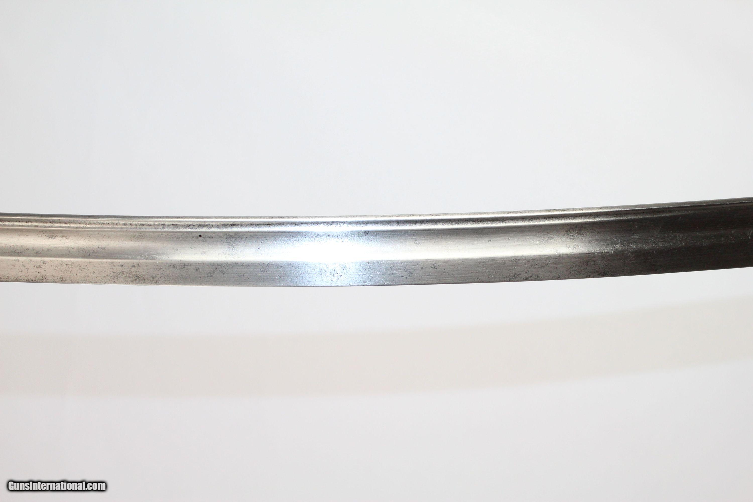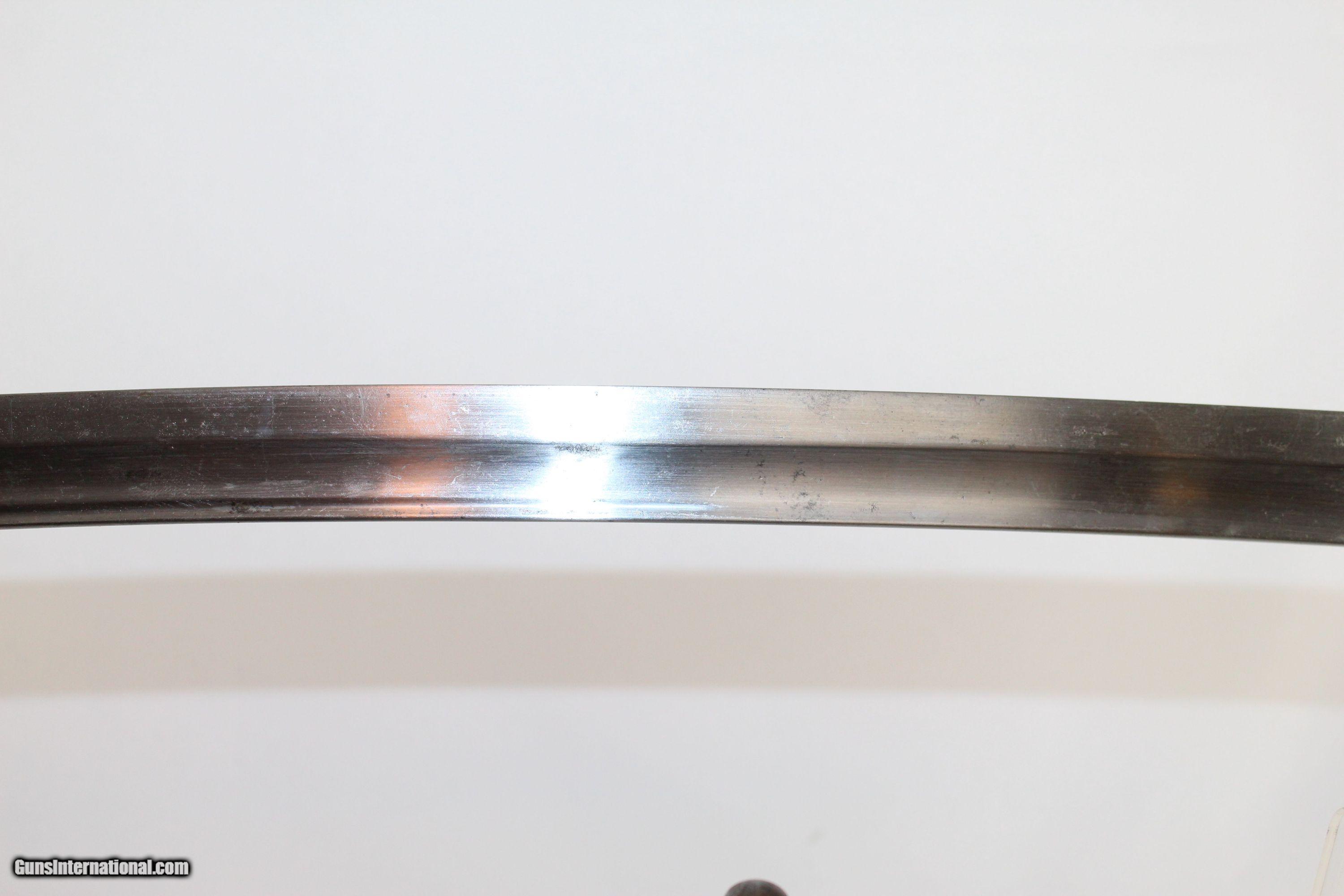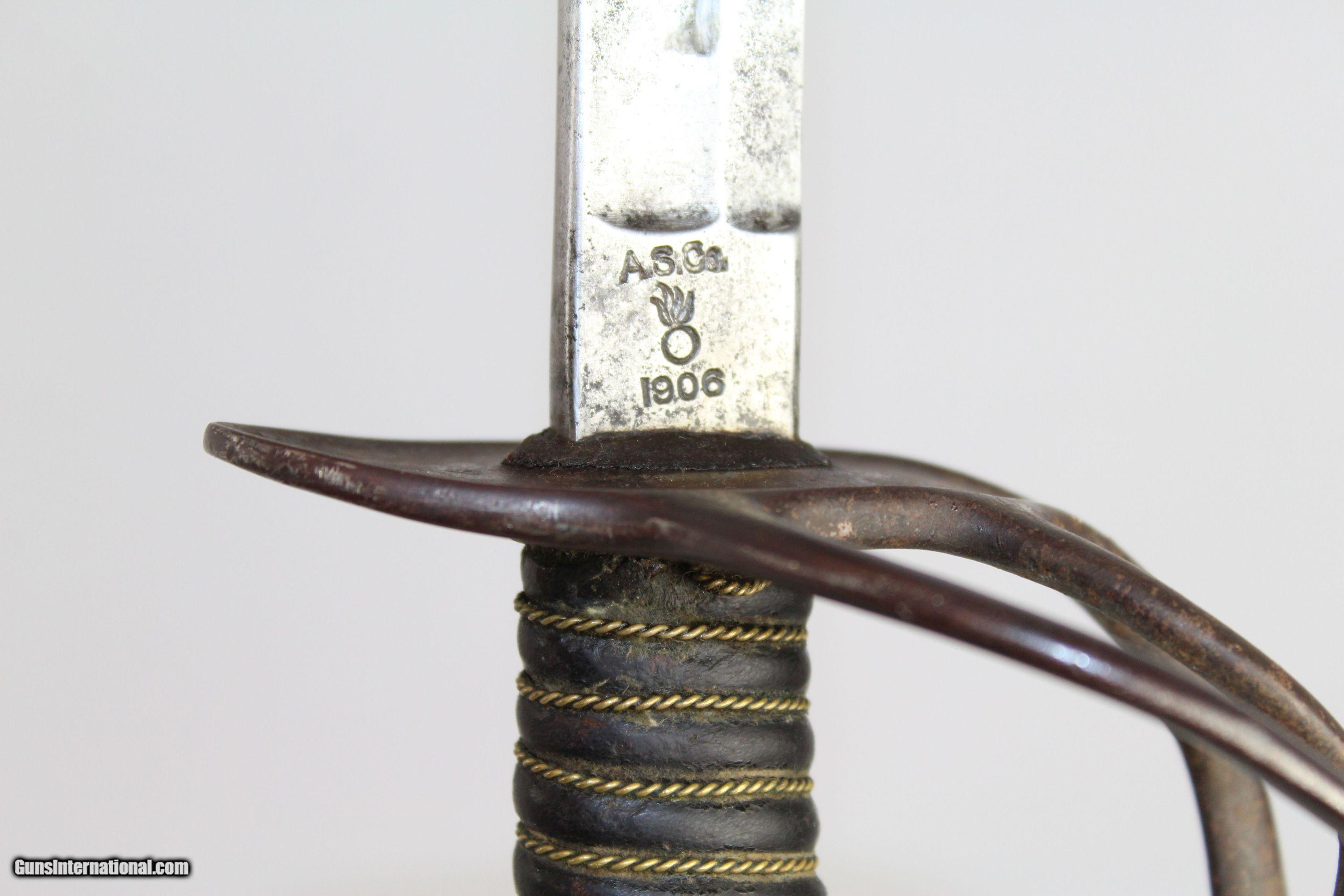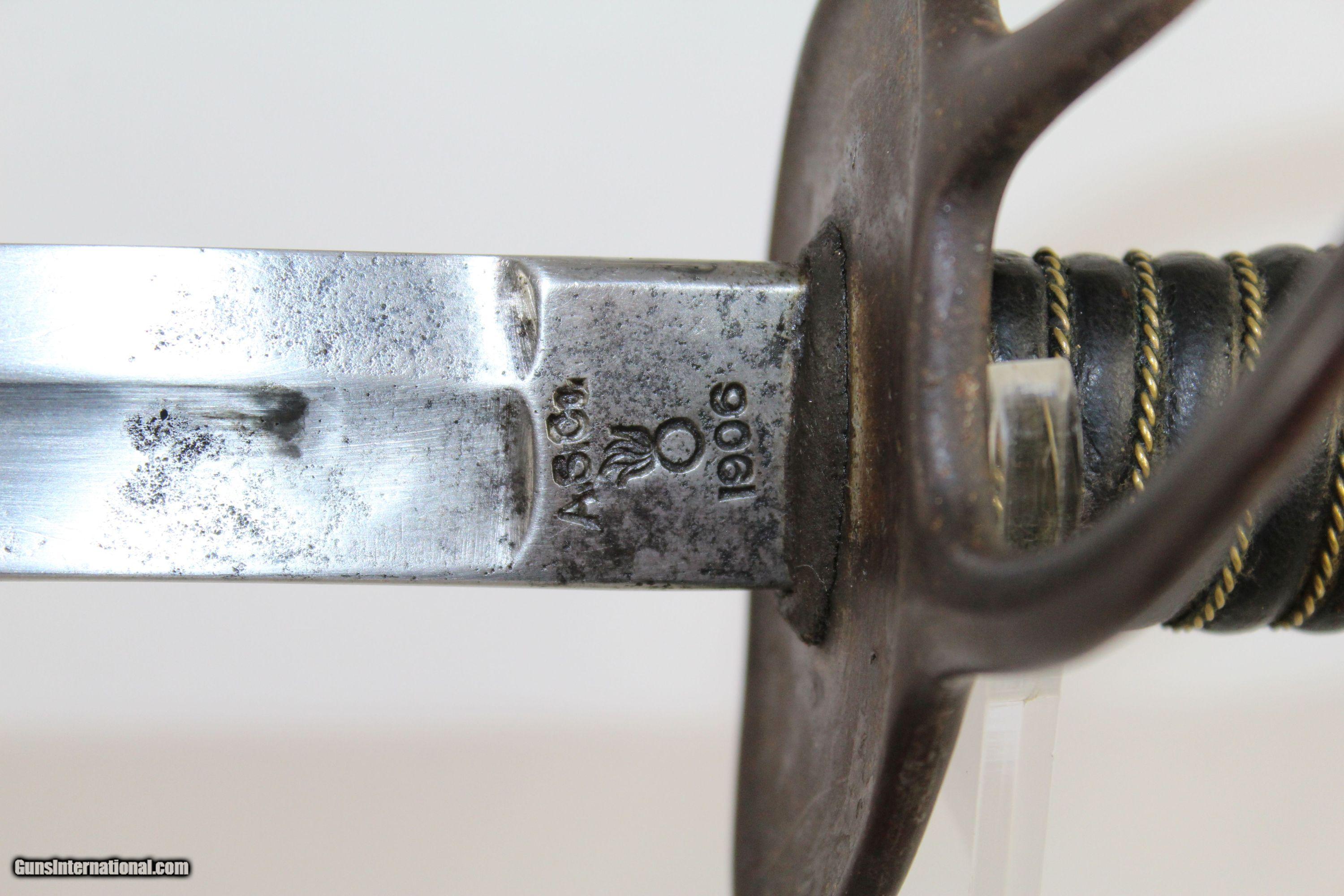Description: SCARCE US Model 1906 LIGHT CAVALRY Saber by AMES Last Issued Light Cavalry Blade Issued to US Cavalry Here we present a scarce Ames U.S. Model 1906 Light Cavalry Saber, made in 1906 by Ames Sword Company in Chicopee Falls, Massachusetts. Fewer than 20,000 of these blades were made. This model is significant to the collector in that it was the last light cavalry saber issued to U.S. cavalry troops and the second to last cavalry sword issued at all to U.S. cavalry (replaced soon after by young George Patton’s straight bladed sword). It was during this period when traditional cavalry use and blade use was drawing its last breaths. This saber would have been used in conflicts such as the Moro Rebellion in the Philippines. The design was a fairly old one, not changing much from the original Model 1860 Light Cavalry Saber from the American Civil War. The brass guard was replaced with an iron one, and the rings on the scabbard moved closer together for ease of carry. This specimen is marked “A.S.Co.” with a U.S. Ordnance Dept. flaming bomb proof mark and the date “1906”. The other side of the ricasso is marked “US” and “J.H.C.”, which are the government inspector’s initials. The scabbard is marked with the inspector’s initials “G.E.W.” for G.E. Worgen, and “A20”, which may be a unit rack number. The overall condition is very good. The iron hardware and scabbard are dark with age. The markings are clear. The original leather wrap is thinning, but 90% there, with original wire wrap still tight. The original leather washer remains. The blade is bright, having been protected by the scabbard. Here is a scarce example of a U.S. Cavalry blade. Own the original! This is a legitimate antique and not a reproduction. Overall condition as seen in photos. Very Fast. Very Safe. FREE SHIPPING WORLDWIDE. Delivered directly to your door by express mail! Guaranteed AUTHENTIC & Includes CERTIFICATE OF AUTHENTICITY. ancestryguns $750 #5194 SOLD |