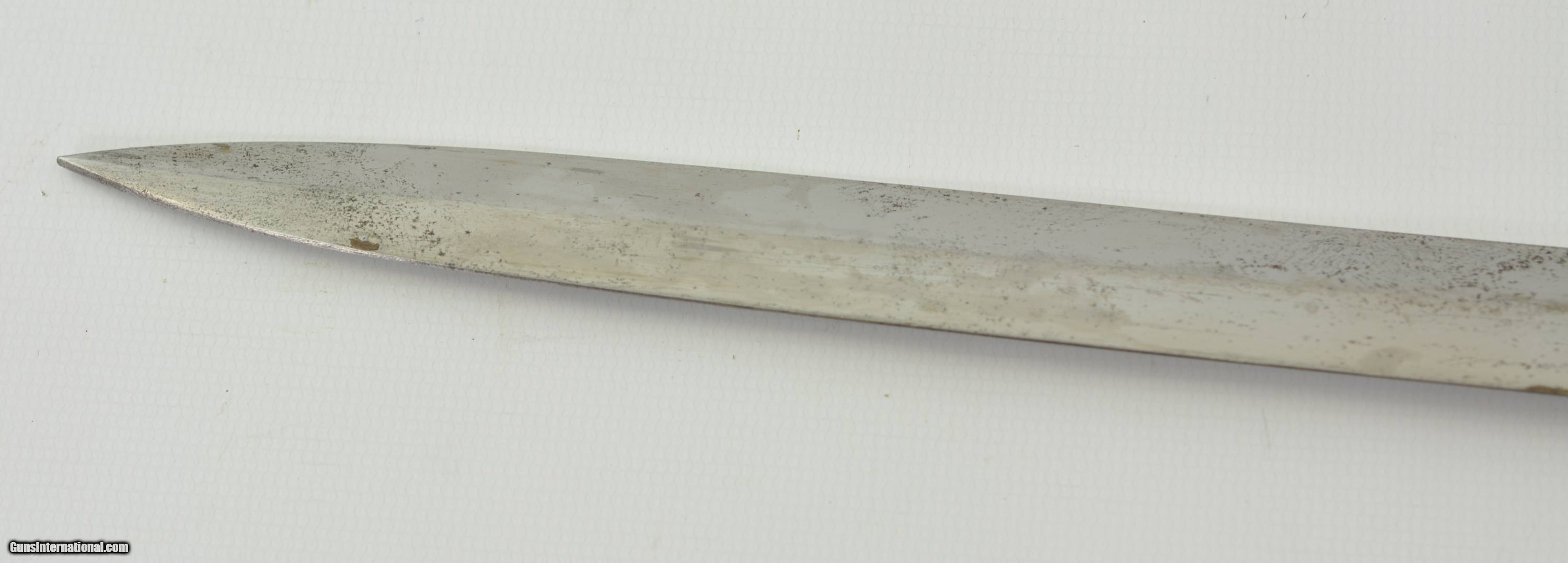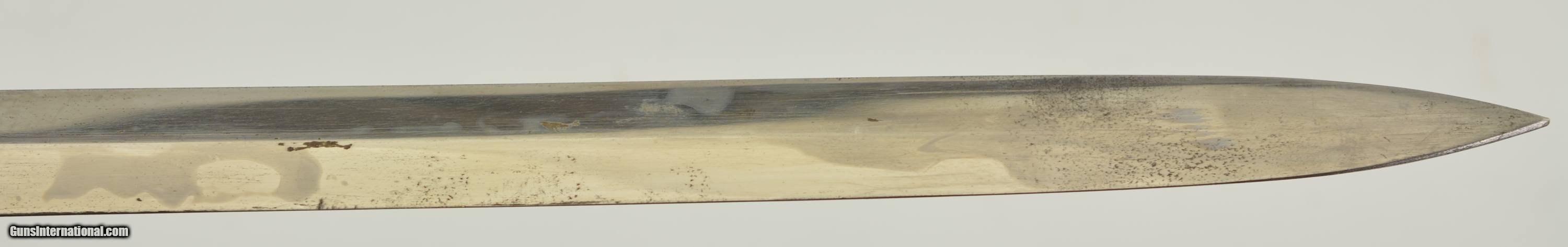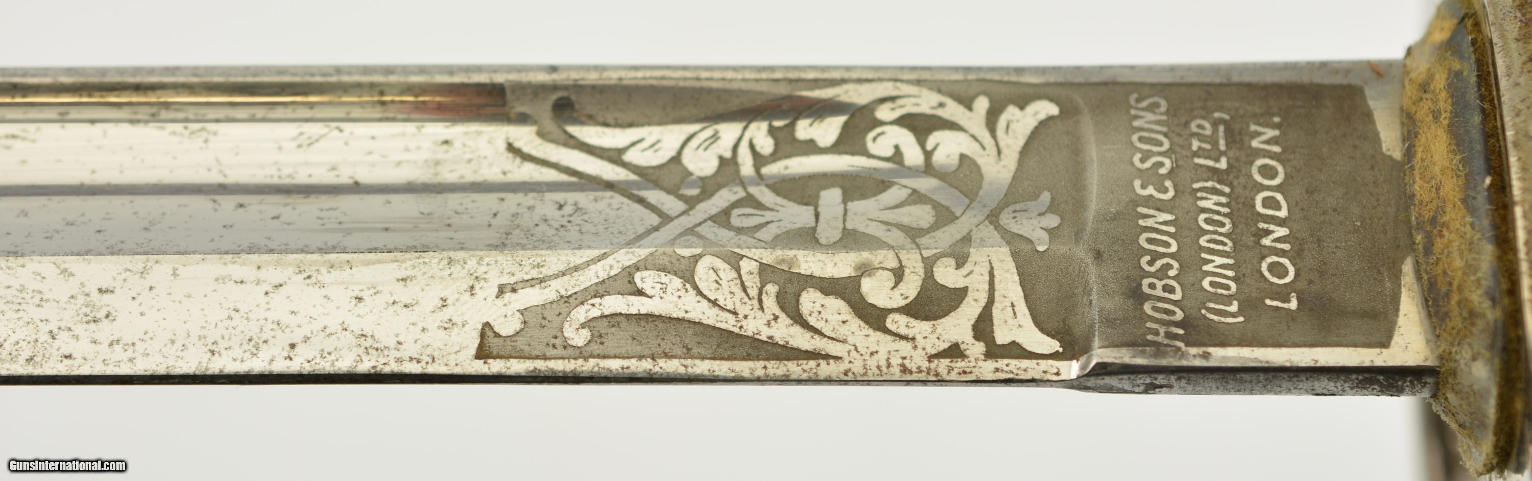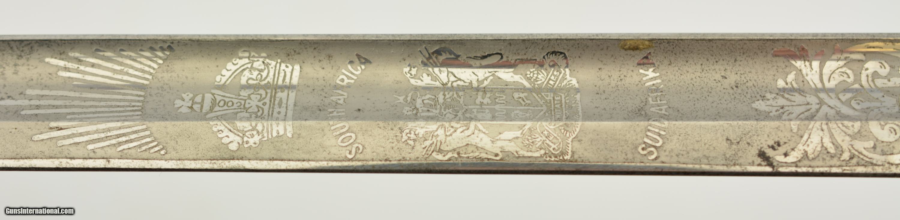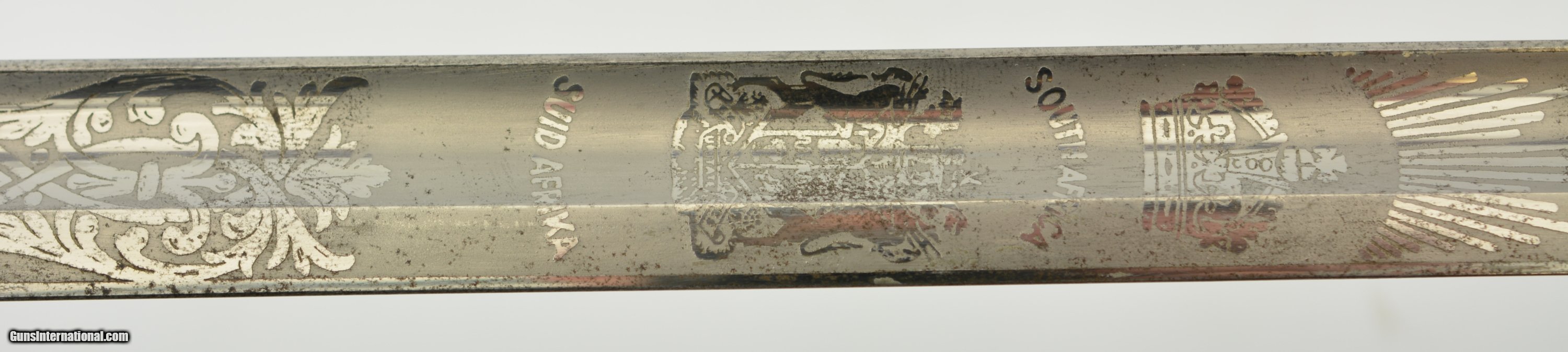 Description: This is a private purchase sword, made ca. 1950, that measures 41" overall with a 34 7/8" straight, single-edged blade with 2/3 length single fullers and scrollwork embellished etched panels. The blade has a bright nickel patina with scattered specks of dark freckling throughout. The ricasso is marked “HOBSON & SONS / (LONDON) LTD. / LONDON" on the reverse, and the Royal South African crest on both etched panels. The hilt has the typical three branch guard with single forward-swept quillon, and has evenly distributed spots of dark brown freckling throughout. The shagreen grip is intact, although slightly discolored in a few spots, and has an intact braided wire wrap. The sword comes with an original undented metal scabbard that has the same spots of dark brown freckling as the hilt. This is a handsome, British-made South African military sword, and rates good-very good condition overall. SOLD Manufacturer: South Africa Model: Sword |