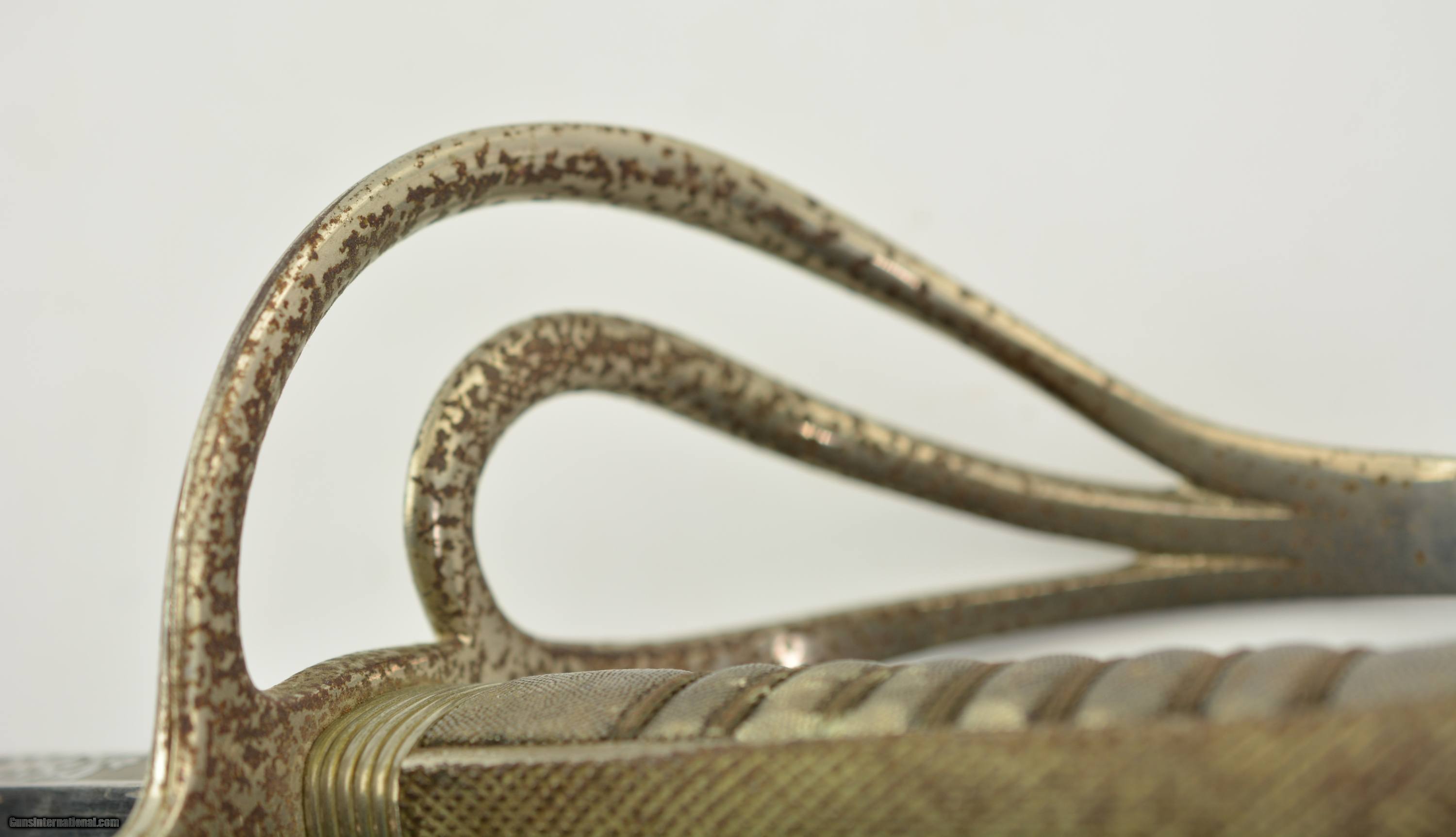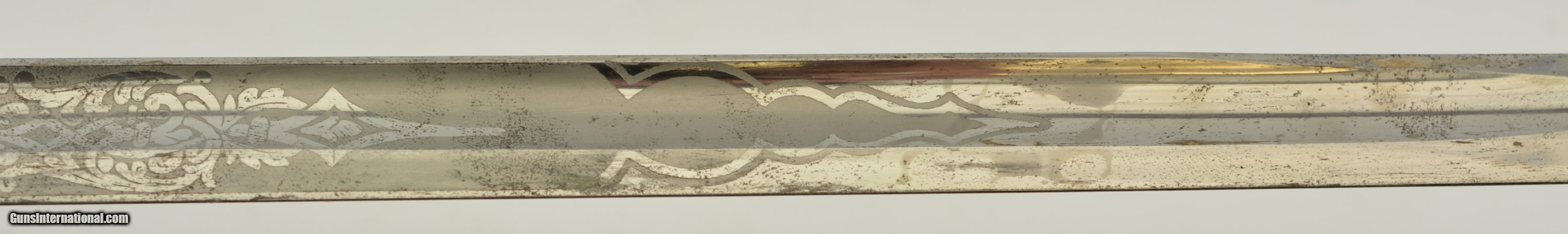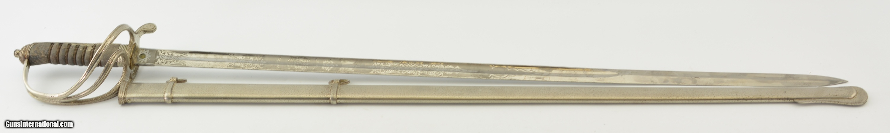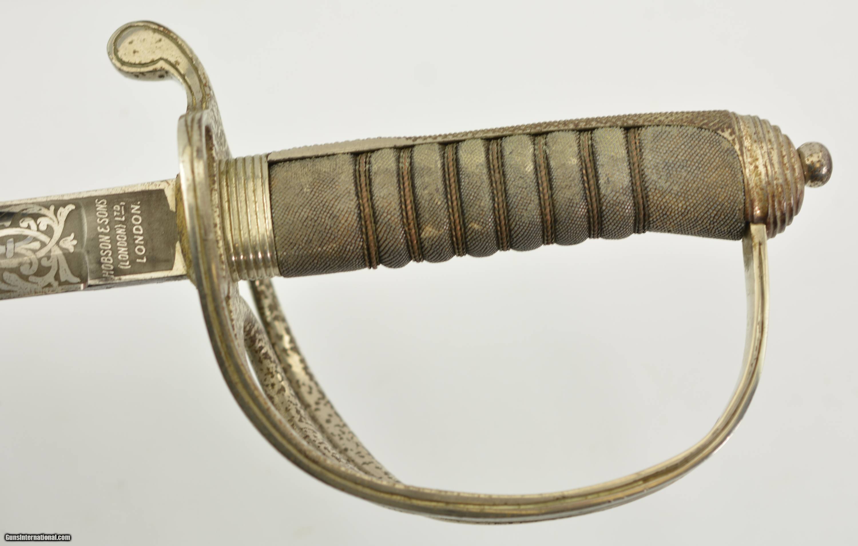 Description: This is a private purchase sword, made ca. 1950, that measures 41" overall with a 34 7/8" straight, single-edged blade with 2/3 length single fullers and scrollwork embellished etched panels. The blade has a bright nickel patina with scattered specks of dark freckling throughout. The ricasso is marked “HOBSON & SONS / (LONDON) LTD. / LONDON" on the reverse, and the Royal South African crest on both etched panels. The hilt has the typical three branch guard with single forward-swept quillon, and has evenly distributed spots of dark brown freckling throughout. The shagreen grip is intact, although slightly discolored in a few spots, and has an intact braided wire wrap. The sword comes with an original undented metal scabbard that has the same spots of dark brown freckling as the hilt. This is a handsome, British-made South African military sword, and rates good-very good condition overall. SOLD Manufacturer: South Africa Model: Sword |