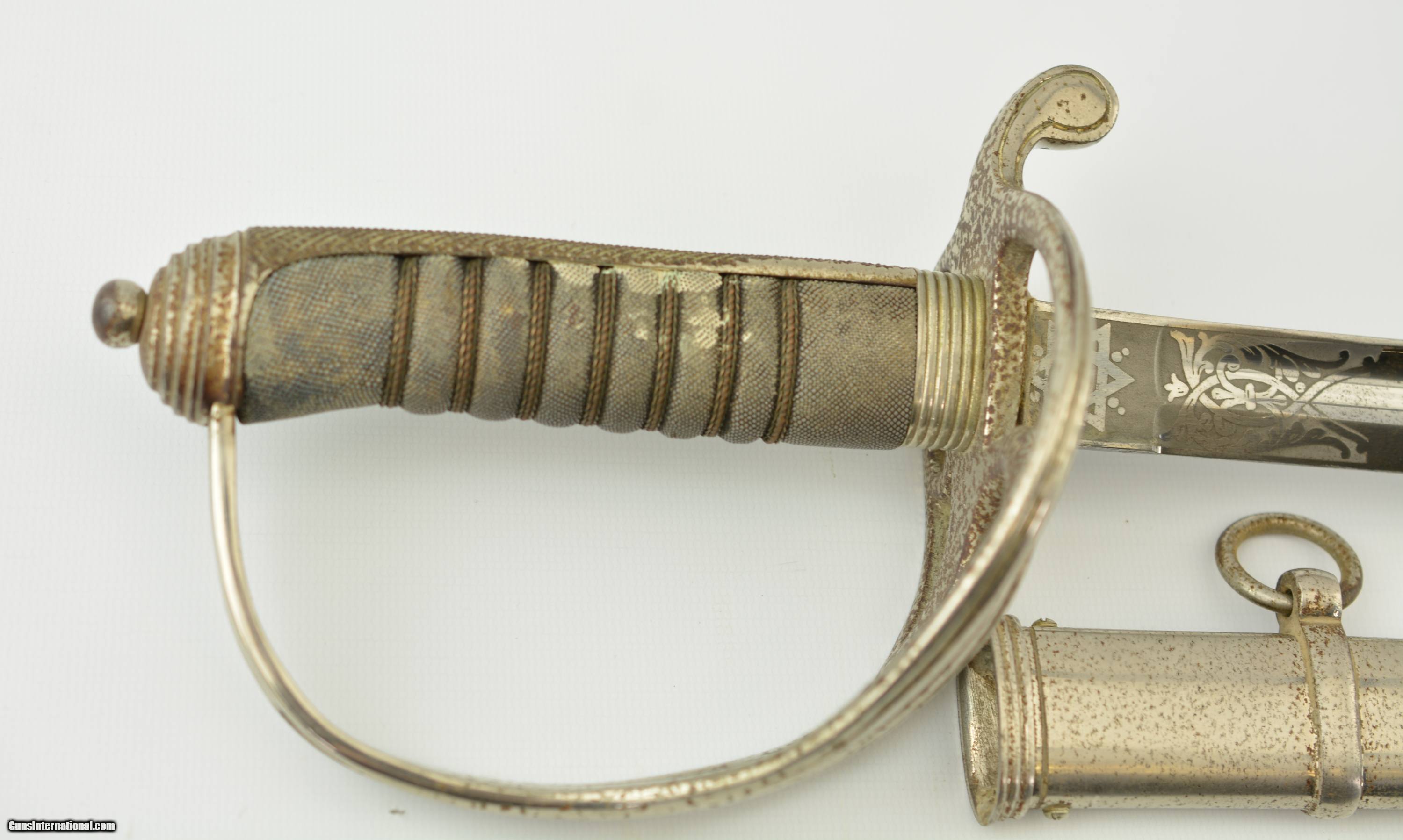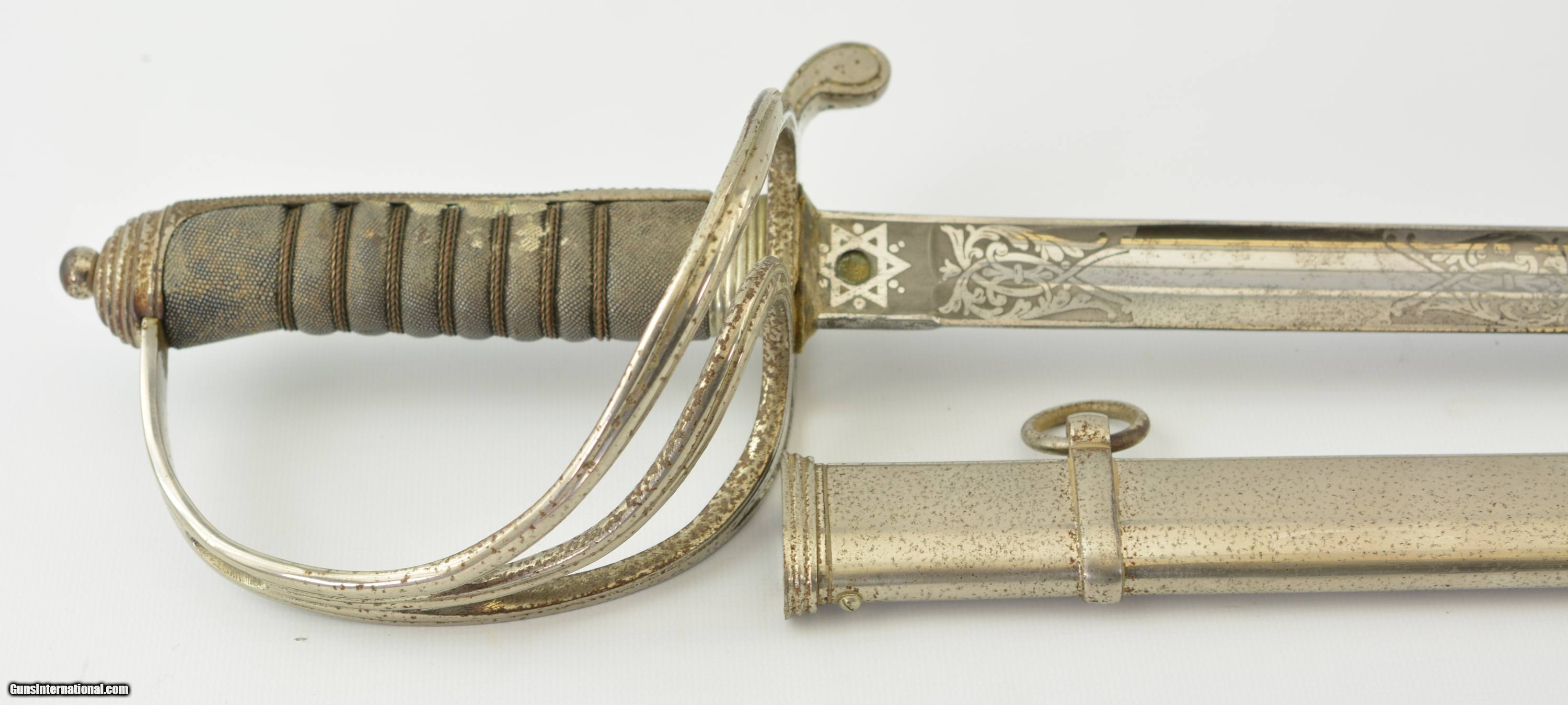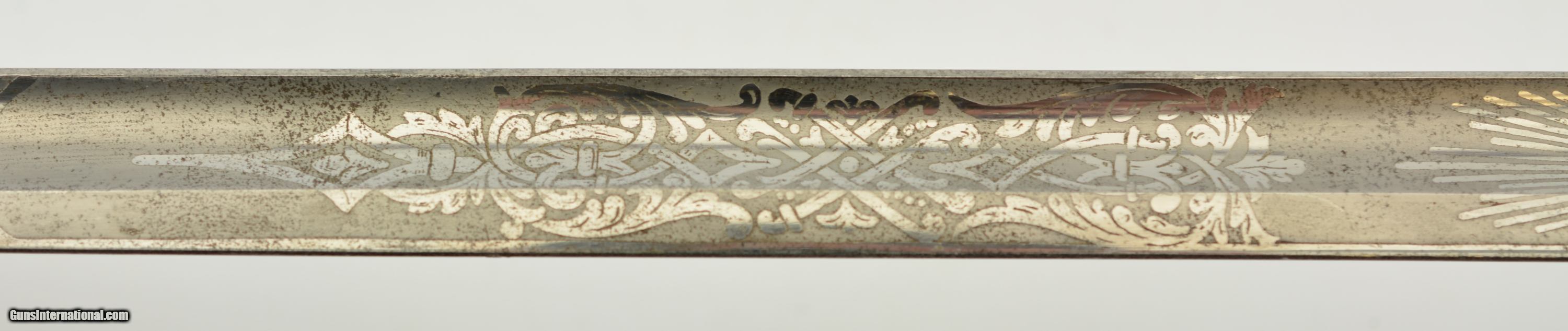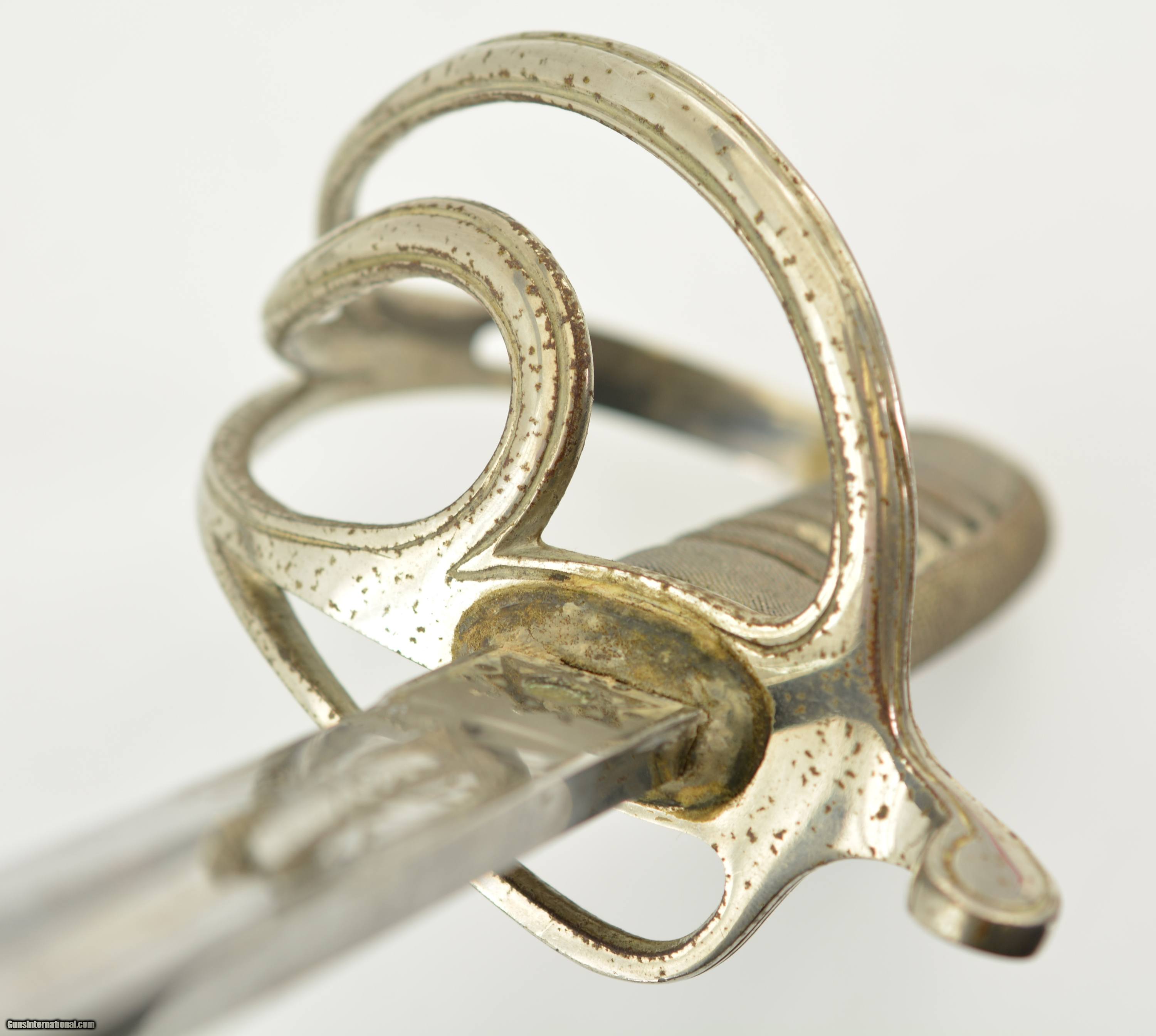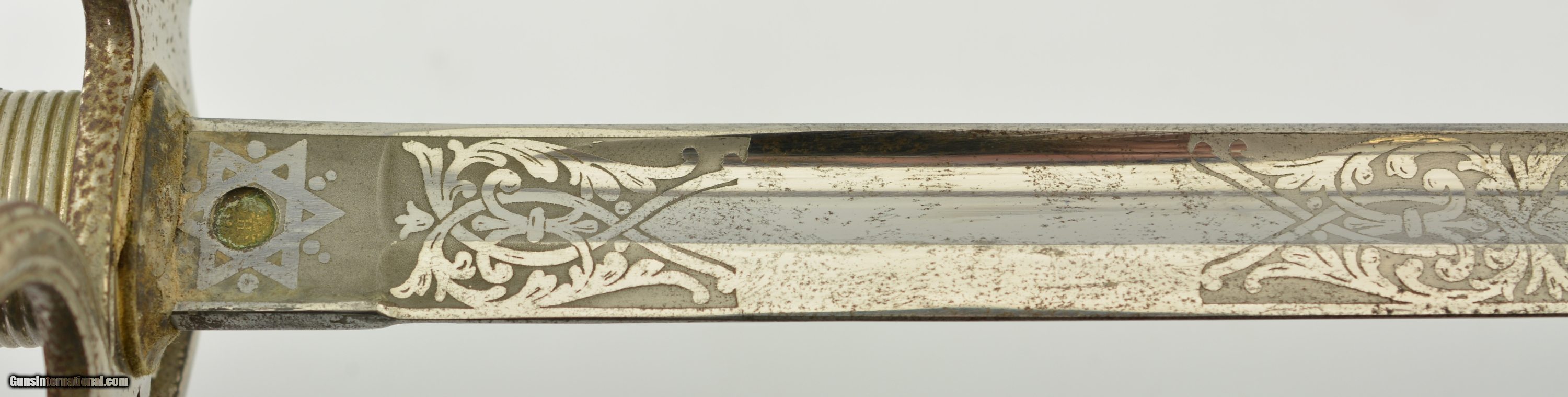 Description: This is a private purchase sword, made ca. 1950, that measures 41" overall with a 34 7/8" straight, single-edged blade with 2/3 length single fullers and scrollwork embellished etched panels. The blade has a bright nickel patina with scattered specks of dark freckling throughout. The ricasso is marked “HOBSON & SONS / (LONDON) LTD. / LONDON" on the reverse, and the Royal South African crest on both etched panels. The hilt has the typical three branch guard with single forward-swept quillon, and has evenly distributed spots of dark brown freckling throughout. The shagreen grip is intact, although slightly discolored in a few spots, and has an intact braided wire wrap. The sword comes with an original undented metal scabbard that has the same spots of dark brown freckling as the hilt. This is a handsome, British-made South African military sword, and rates good-very good condition overall. SOLD Manufacturer: South Africa Model: Sword |