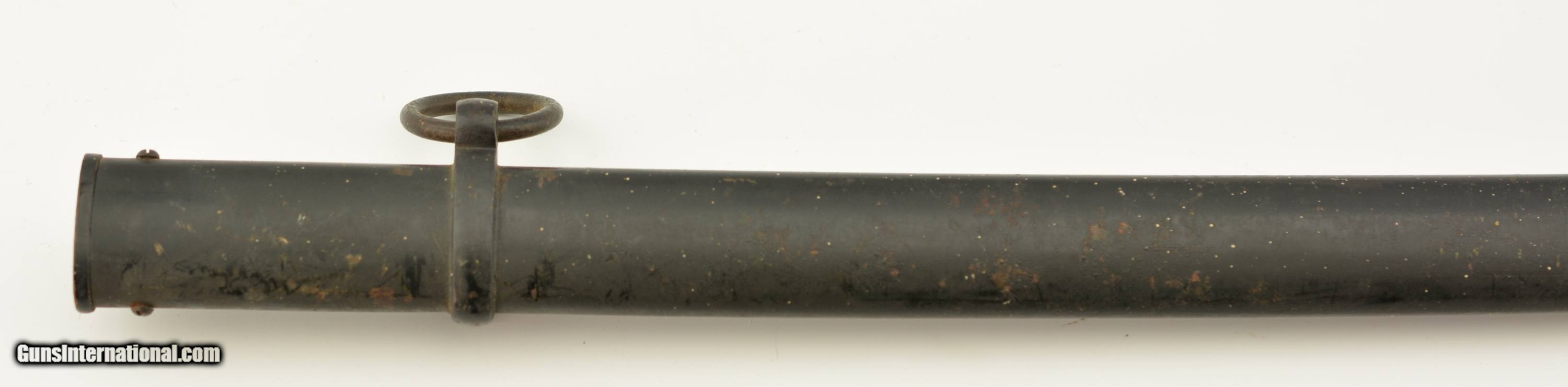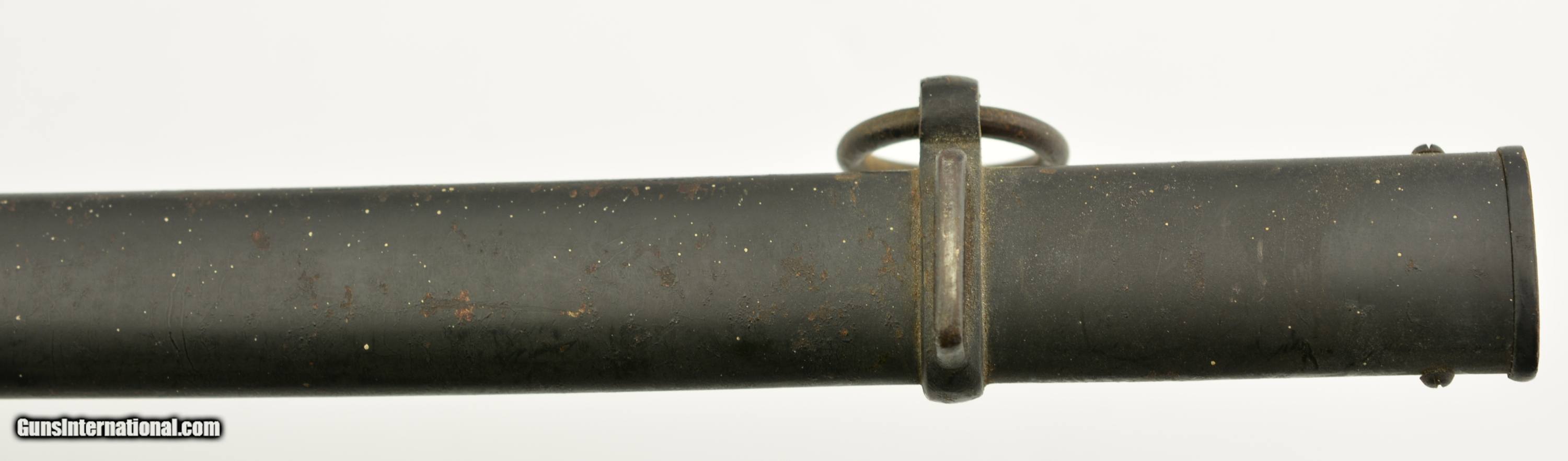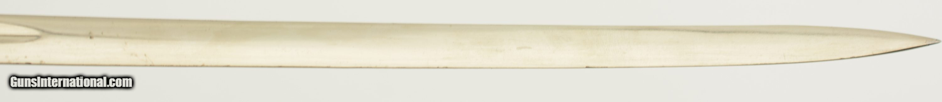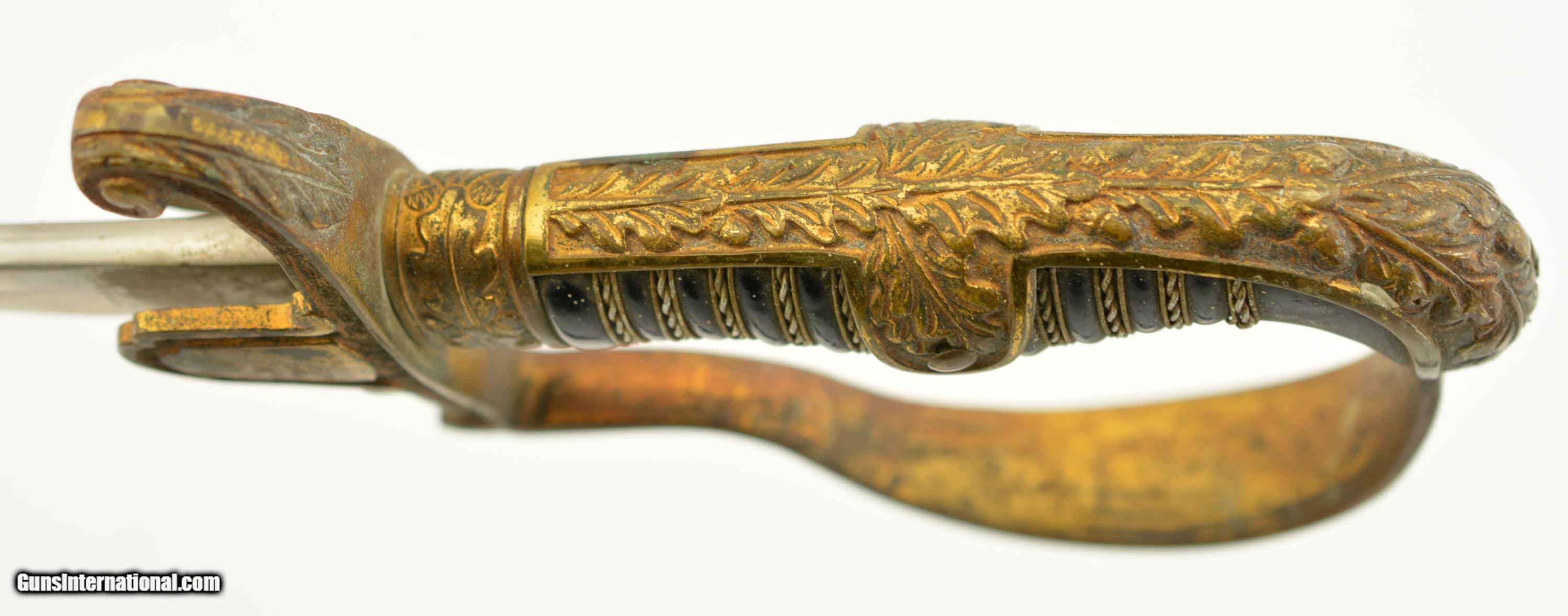 Description: This sword measures 38" overall with a 32 1/2" slightly curved, single-edged blade having 3/4 length unstopped single fullers. The steel has an overall excellent original polish and crisp Eickhorn "Squirrel" trademark on the ricasso obverse. The hilt is Eickhorn's "Freiherr" pattern (engraved, dovehead hilt with cast Wehrmacht eagle on the obverse langet) and has a mellow russet and ochre patina on the brass with original gilt finish remaining on the low spots of the oak leaf and acorn motif relief embellishments. The reverse "P" guard has some small areas of oxidation along the exterior. The black composite grip is in fine shape with some mild surface wear evident, and a braided wire wrap. The undented metal scabbard has about 70-75% of the original black paint finish remaining with the balance flaked to the underlying plum-brown oxidized base metal, and some further flecks of paint along the entire surface. This is a fine World War II sword overall. SOLD Manufacturer: German Model: Sword |