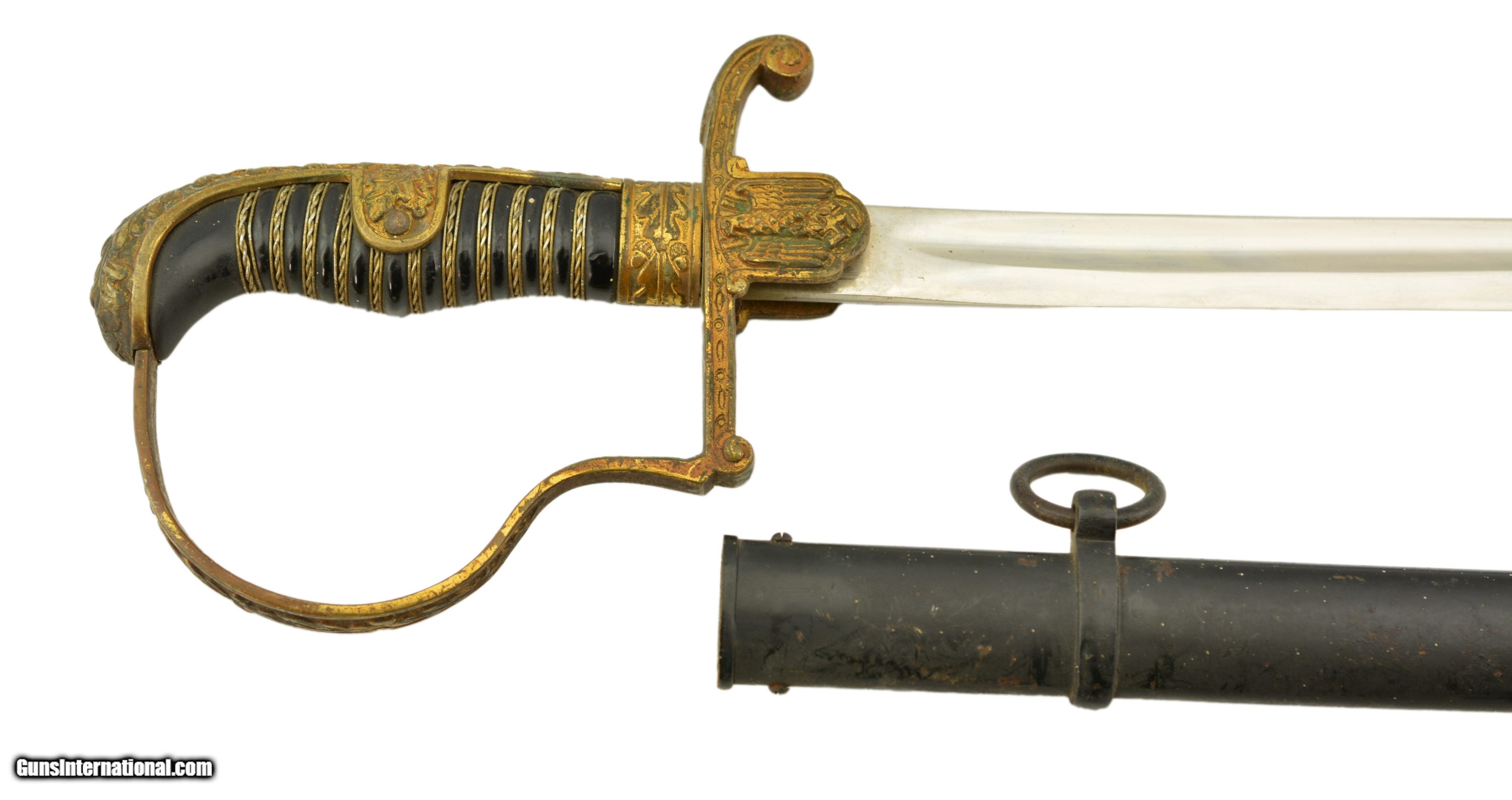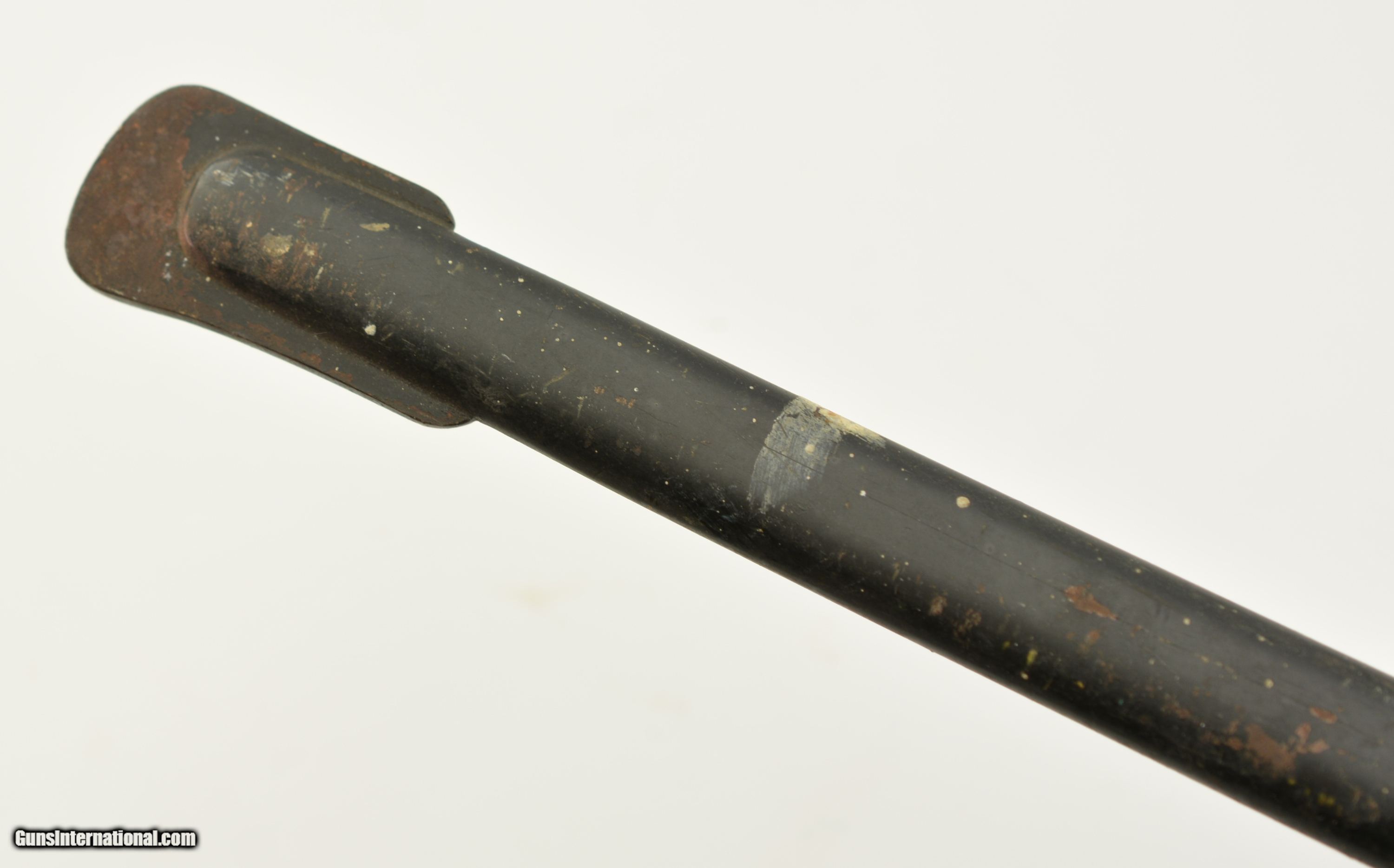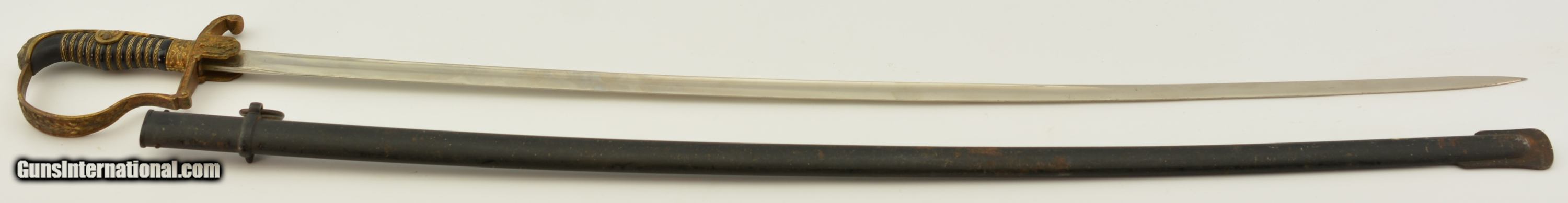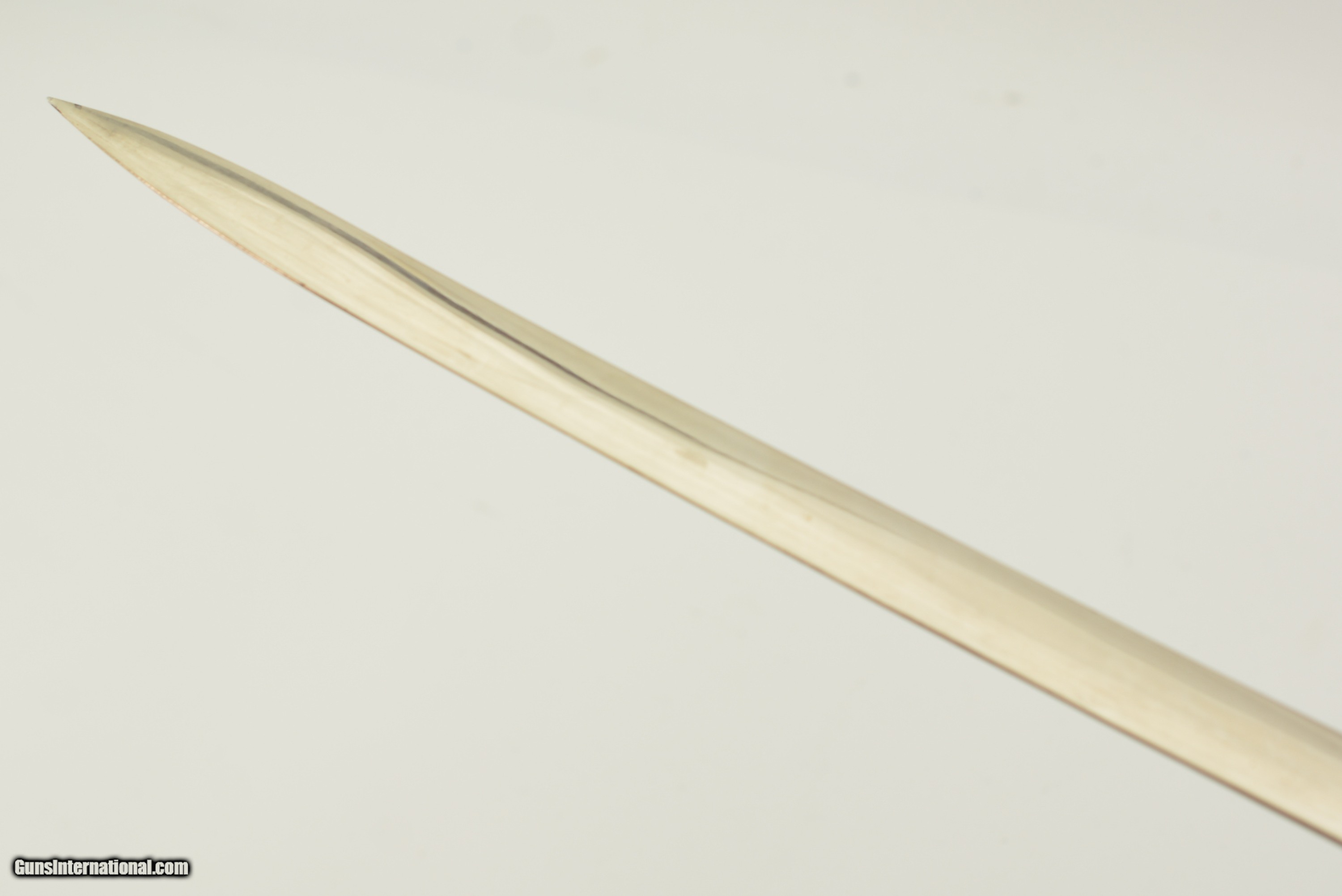 Description: This sword measures 38" overall with a 32 1/2" slightly curved, single-edged blade having 3/4 length unstopped single fullers. The steel has an overall excellent original polish and crisp Eickhorn "Squirrel" trademark on the ricasso obverse. The hilt is Eickhorn's "Freiherr" pattern (engraved, dovehead hilt with cast Wehrmacht eagle on the obverse langet) and has a mellow russet and ochre patina on the brass with original gilt finish remaining on the low spots of the oak leaf and acorn motif relief embellishments. The reverse "P" guard has some small areas of oxidation along the exterior. The black composite grip is in fine shape with some mild surface wear evident, and a braided wire wrap. The undented metal scabbard has about 70-75% of the original black paint finish remaining with the balance flaked to the underlying plum-brown oxidized base metal, and some further flecks of paint along the entire surface. This is a fine World War II sword overall. SOLD Manufacturer: German Model: Sword |