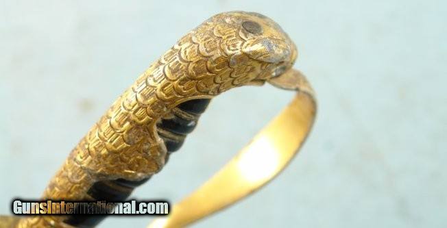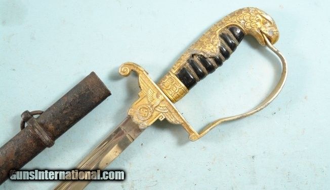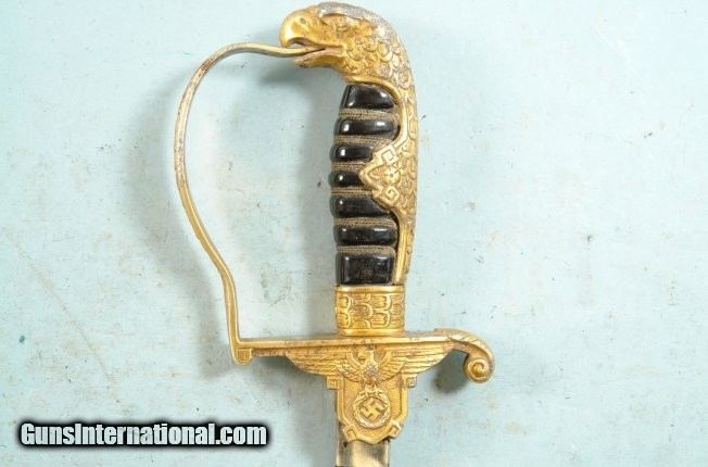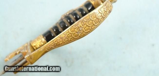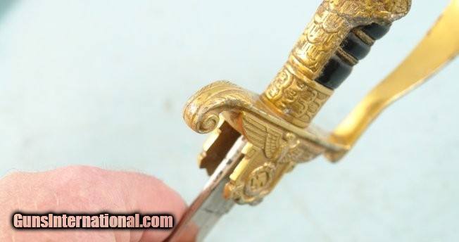 Description: WW2 GERMAN NAZI CLEMENT & JUNG PRISON OFFICIAL’S SWORD AND SCABBARD. 36” o/a with 30” blade. Gilded brass hilt. All original with most of the gilding on hilt and polish on blade. Scabbard with attic patina and flaking black finish. Maker signed on the ricasso “CLEMENT & JUNG”. One of most desirable Nazi swords. Also one of the most ornate. Very scarce. SOLD |