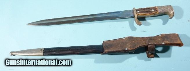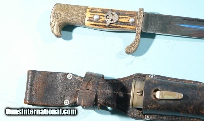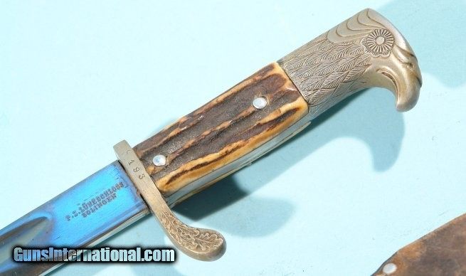 Description: WW2 ORIGINAL NAZI EAGLEHEAD POLICE DAGGER AND SCABBARD & FROG. Excellent condition overall and all matching as has same number on back of scabbard throat as well as hilt "193". Ricasso stamped "P.D. Luneschloss/ Solingen" with mint original finish 13" blade. Original stag grip panels with original Nazi Eagle in wreath device. Crisp with original patina hilt with oakleaf and eaglehead pommel. Original nickel plating on throat and drag of scabbard. Scabbard leather in mint condition with excellent stitching. Original period frog with makers name stamped on back. Excellent rivets and stitching as well as button retainer. Regt. marking crossed out on back of scabbard throat above serial number. SOLD |