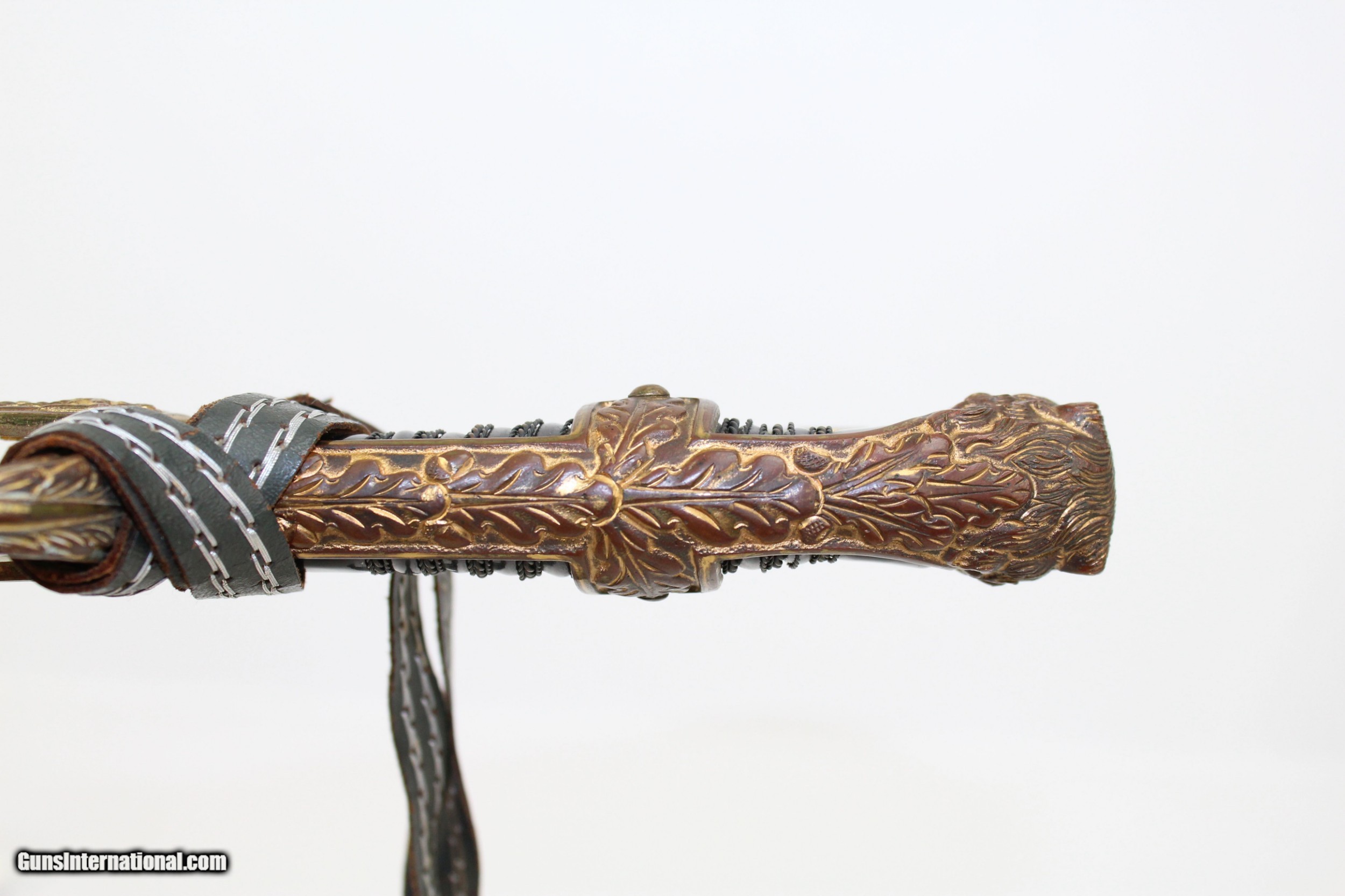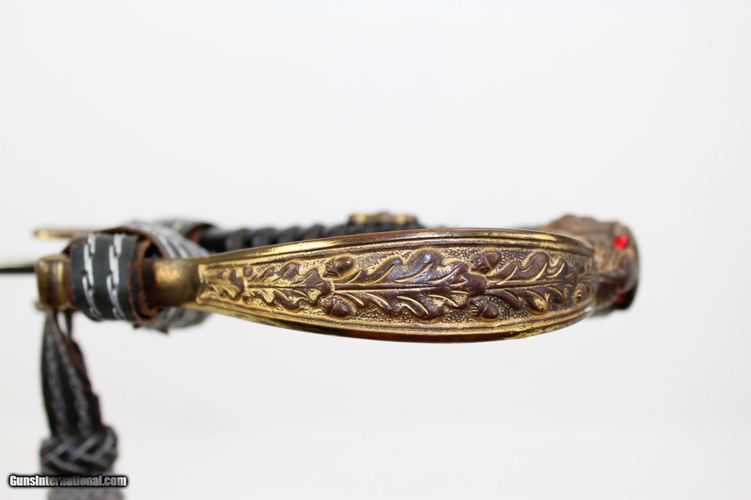 Description: WWII Antique Nazi Third Reich German Officer Sword Ornate Lion’s Head WWII Sword Here we present an antique Nazi Third Reich Lion Head Officer’s Sword by Eikhorn, made in Solingen, Germany circa 1940. Generally speaking, swords were not extremely practical for combat by the time the Second World War came around; however, they were still prized for dress uniforms and status symbols. They were worn at formal ceremonies, weddings, parties, parades and funerals. The Wermacht, Luftwaffe, Kriegsmarines and sundry other Nazi affiliates all had their own swords and styles. This specimen is very nice and in good condition. The pommel features a lion’s head with colored stones in the eye sockets. The right side of the guard features and eagle on a swastika. The front of the handguard is decorated with oak leaves. The blade is highly polished. The edge has not been sharpened or ever intended to be sharpened. The scabbard was painted black and bears no major scratches or dings. Own the original! This is a legitimate antique and not a reproduction. Overall condition as seen in photos. Very Fast. Very Safe. FREE SHIPPING WORLDWIDE. Delivered directly to your door by express mail! Guaranteed AUTHENTIC & Includes CERTIFICATE OF AUTHENTICITY. ancestryguns $850 #6660.1 SOLD |