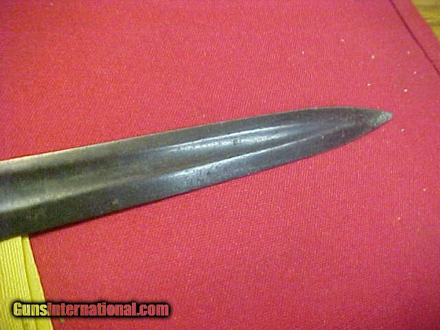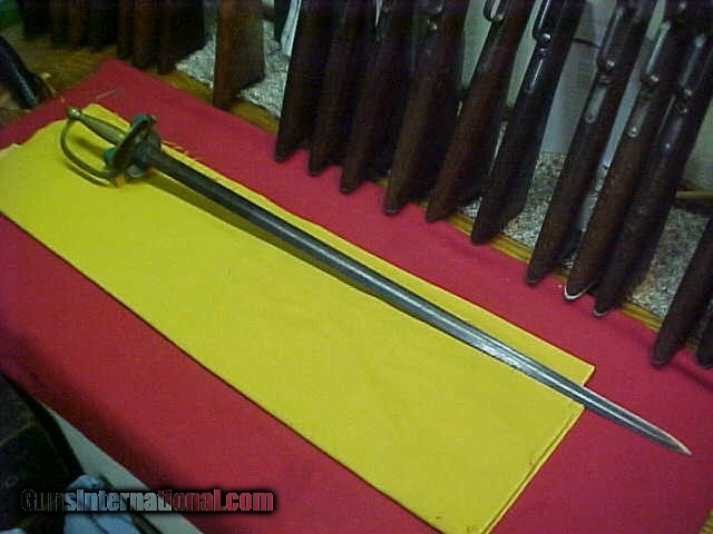 Description: #0948 Horstman & Sons, Philadelphia Model 1860 non-Commissioned Officers sword, standard military issued sword with the solid brass handle. As sometimes encountered, this one has had one of the two hand guard sides bent down which made this sword much easier when carried in post-Civil War parades and similar situations. This sword is missing its leather sheathb and the blade does have some minor mottled staining, but with the forementioned guard, these are the only deficits to this otherwise very collectable Civil War edged weapon. About VG as described. $220 SOLD |