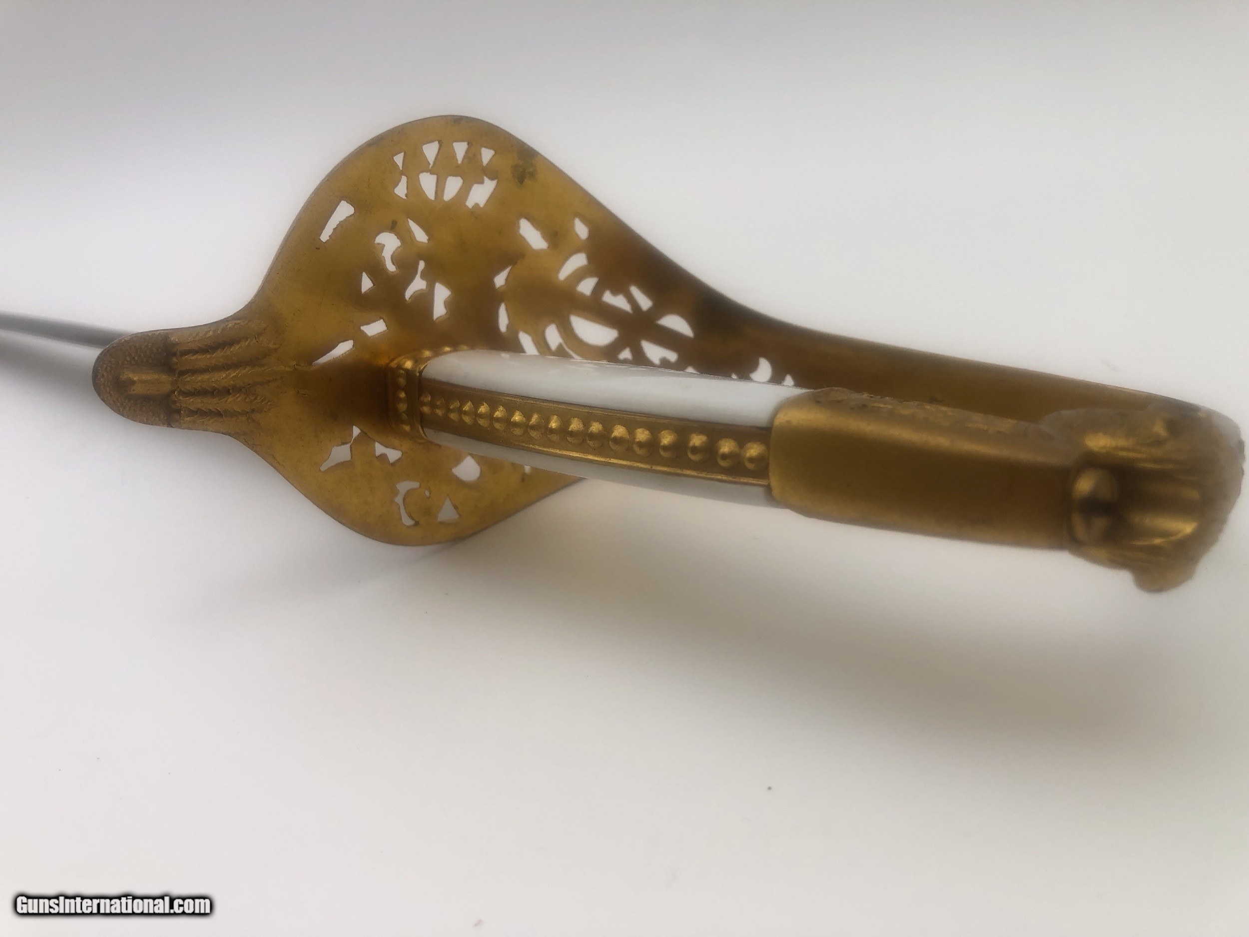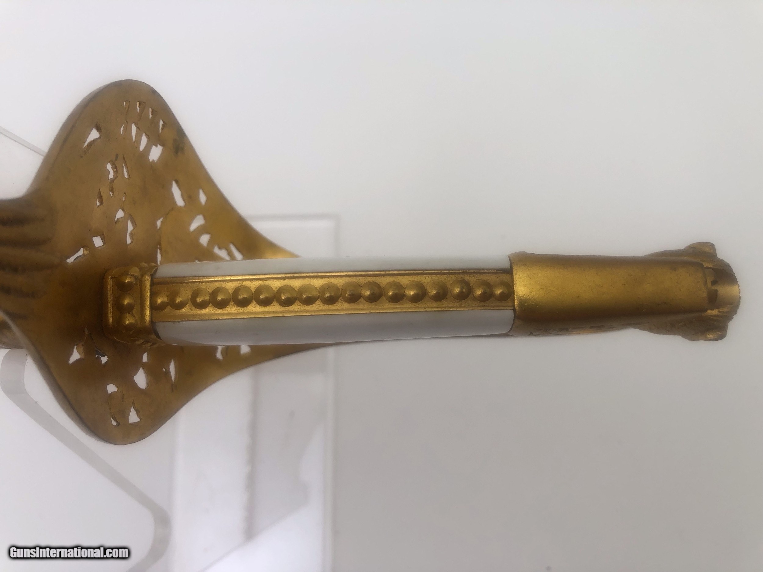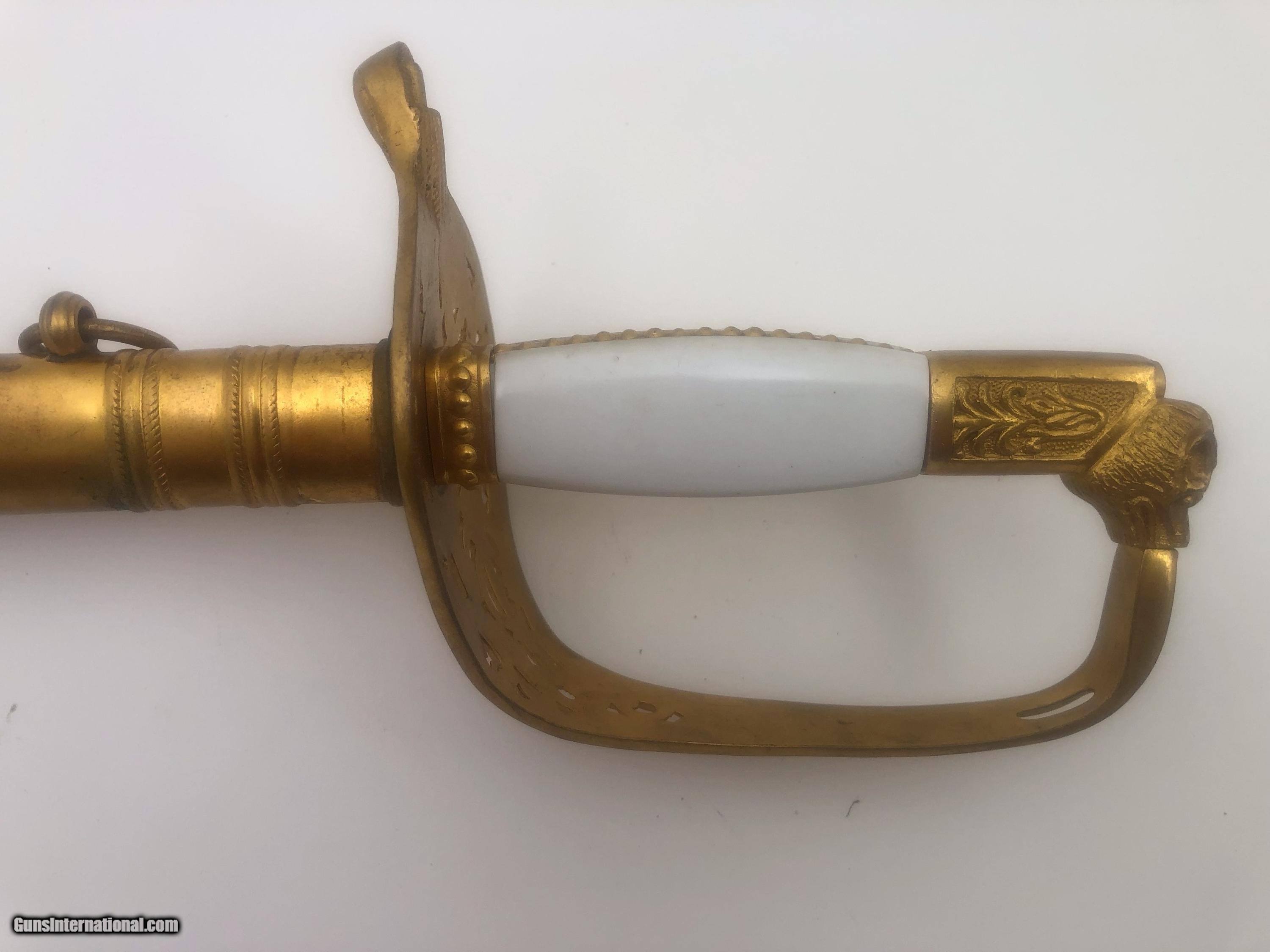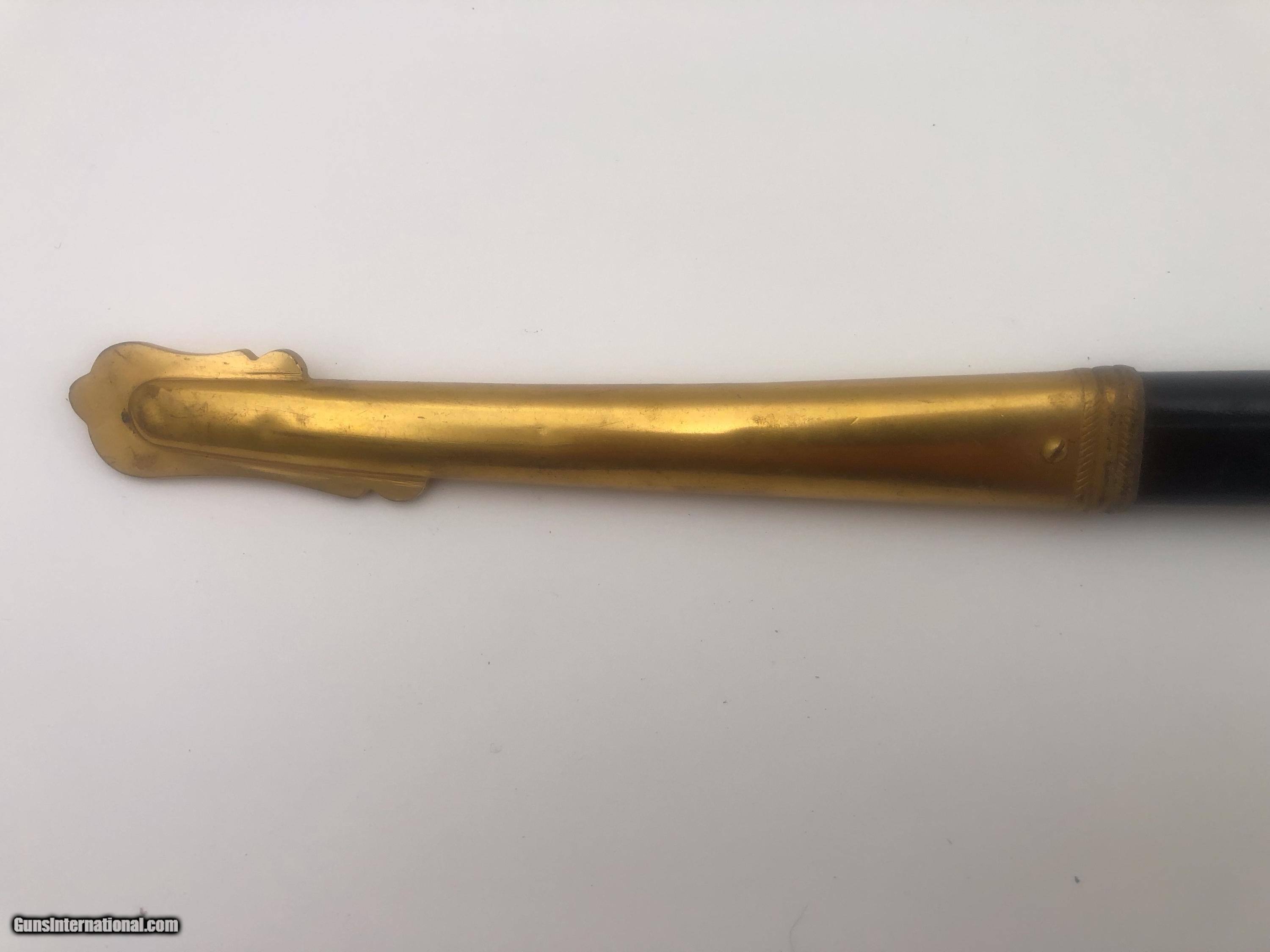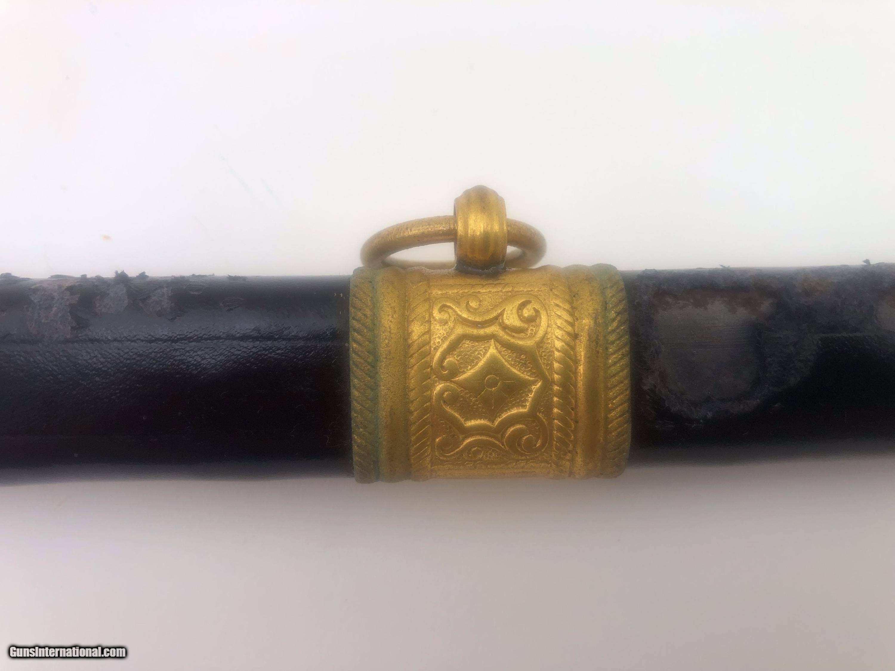 Description: A 19th Century Argentine Naval Officers Sword in leather scabbard with some type of white grip. The mounts are brass with gold wash. The blade is etched with anchors and a floral patern. Dimensions Overall in scabbard approx.33.5" Sword length approx. 32.5" Blade length 27.5" Blade width .76" Condition The sword is very good with great etching and retaining almost all of the gold wash on mounts The leather scabbard covering has several losses from some kind of animal chewing. SOLD |