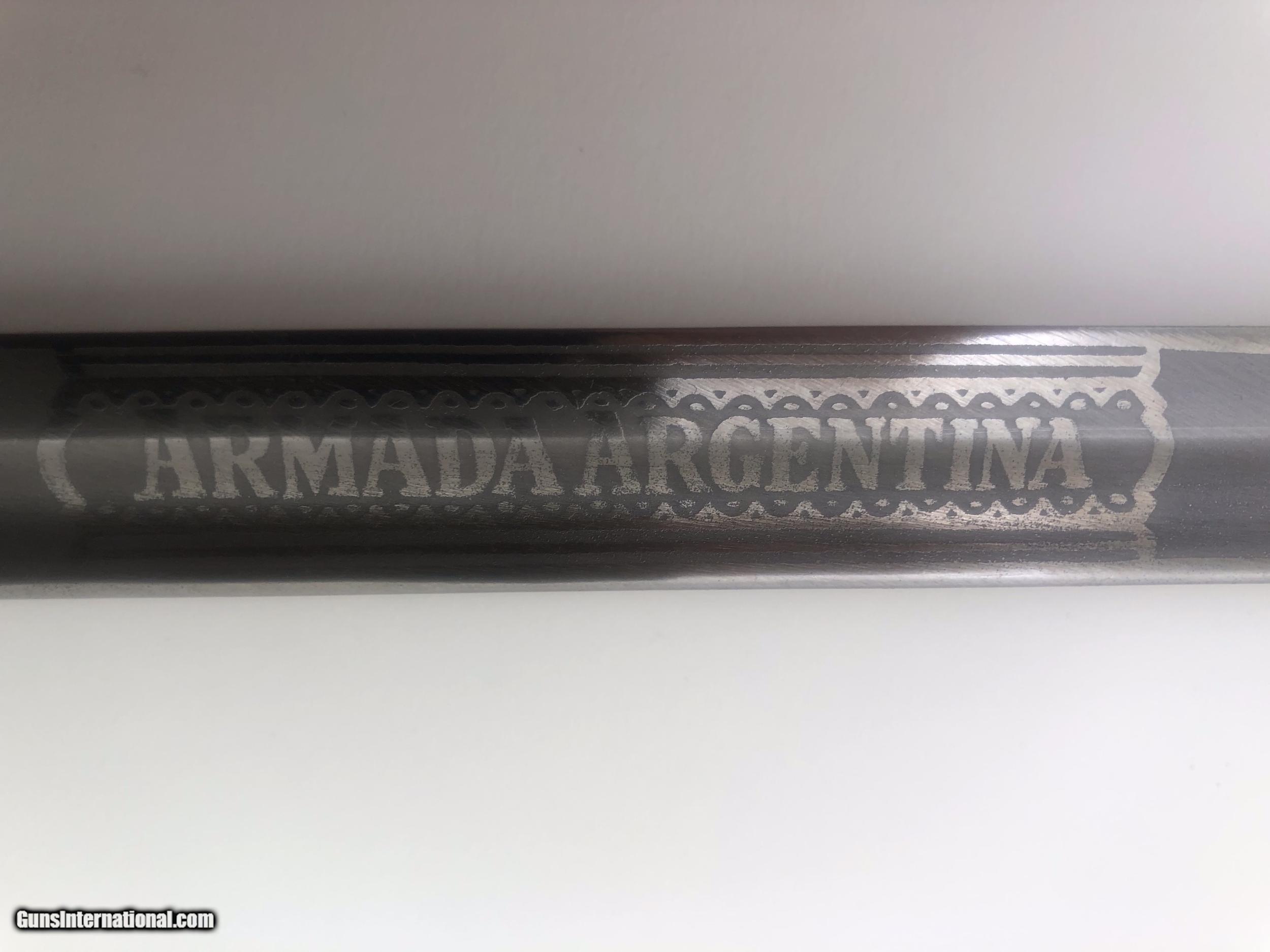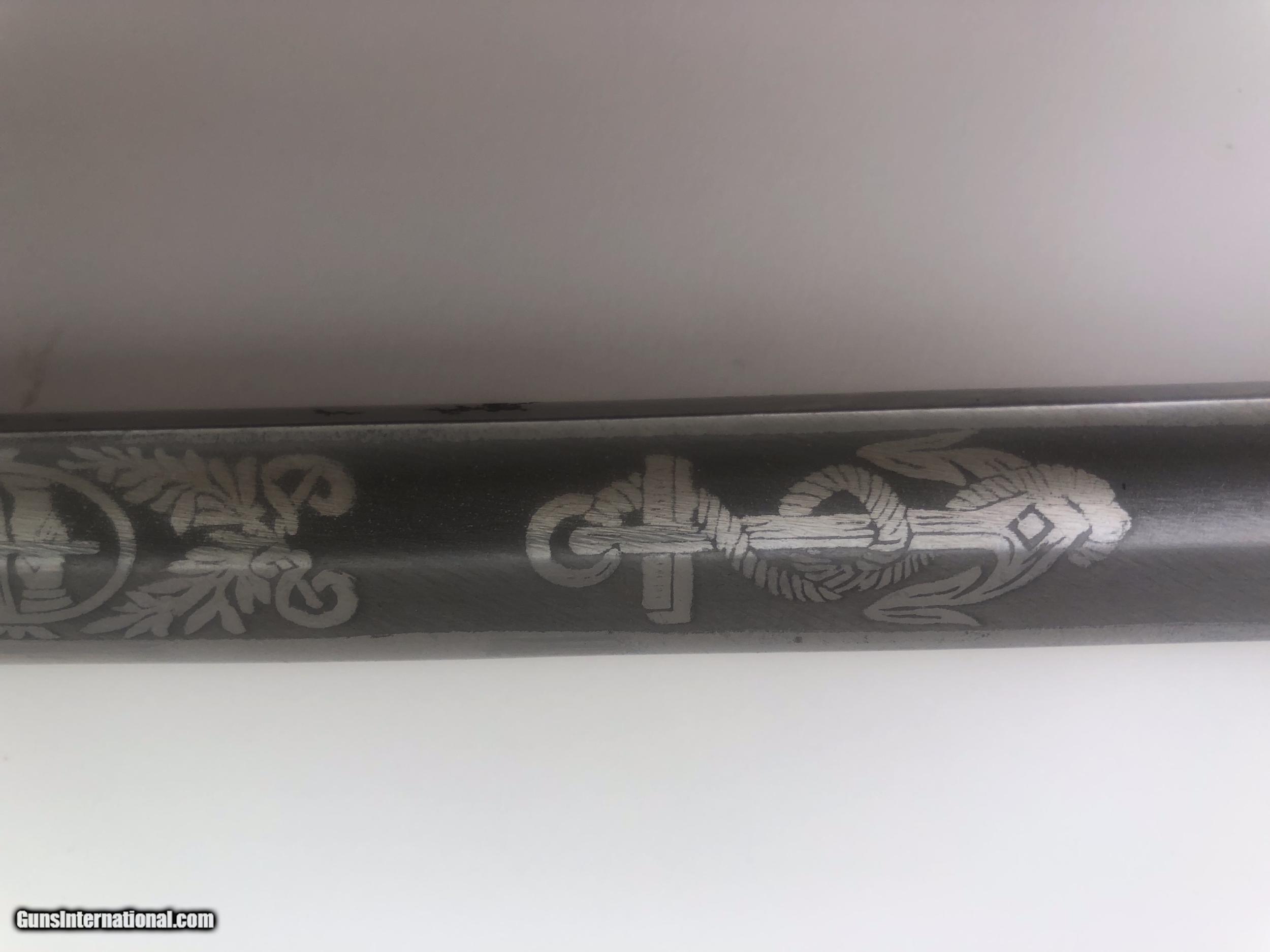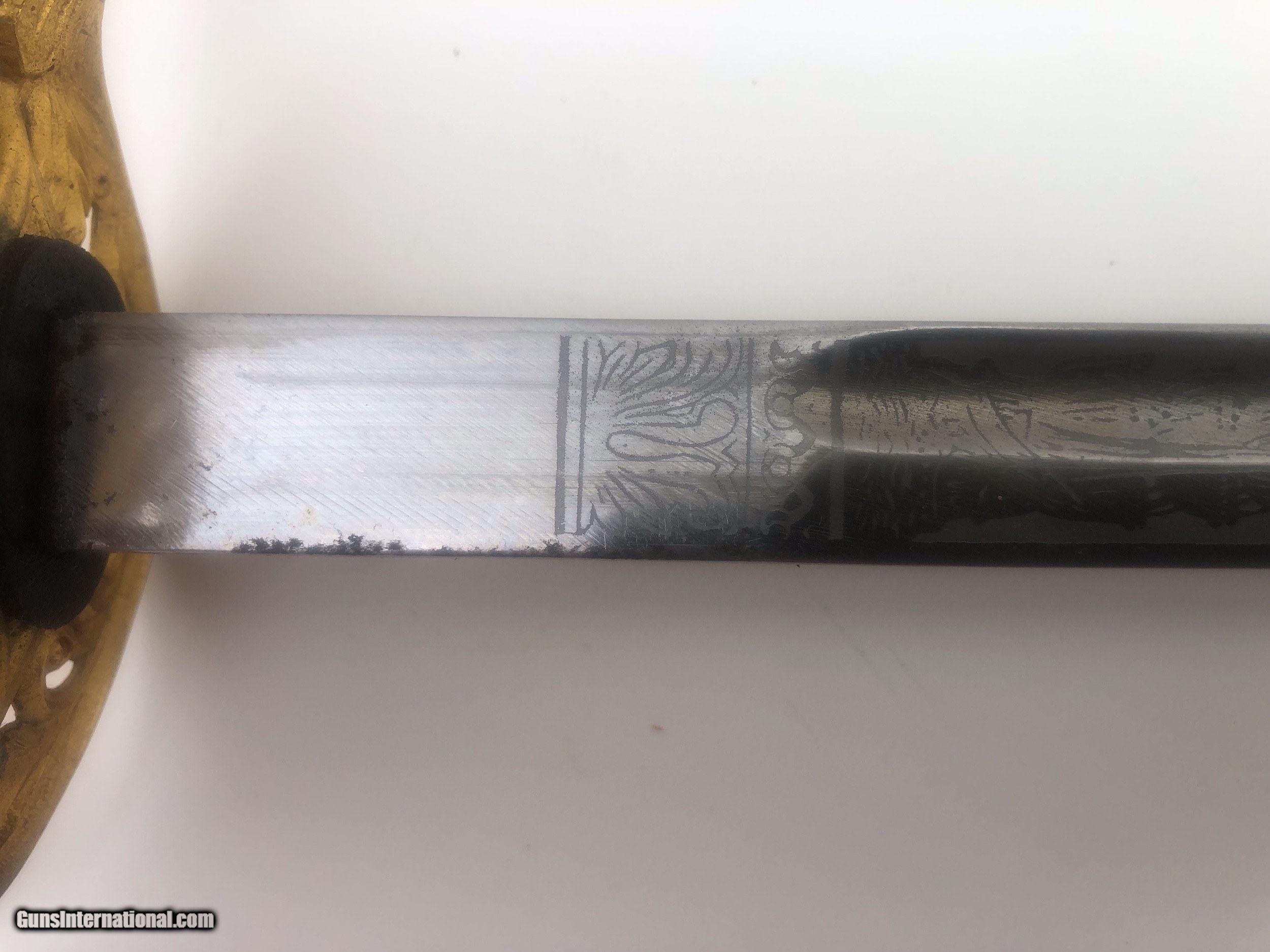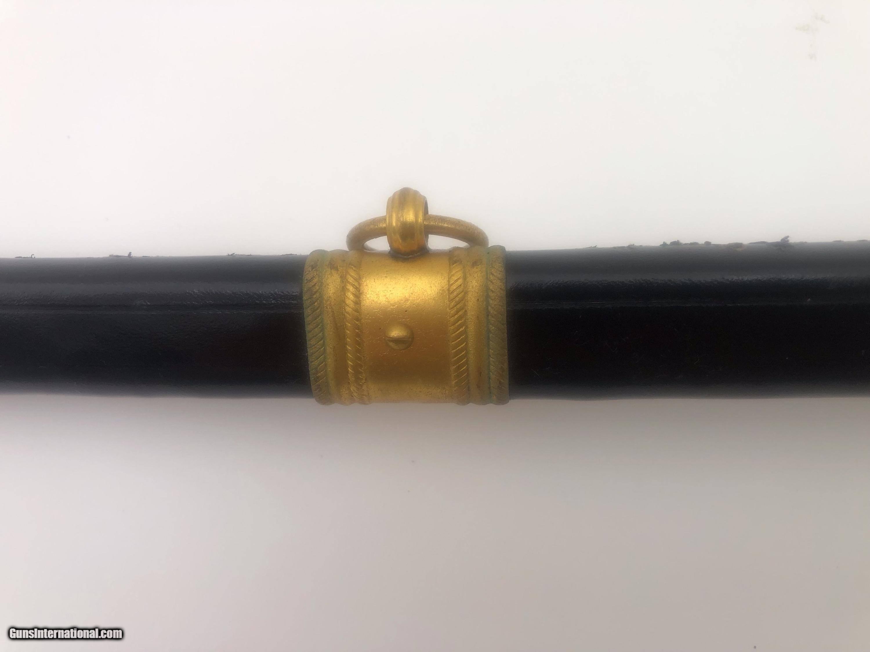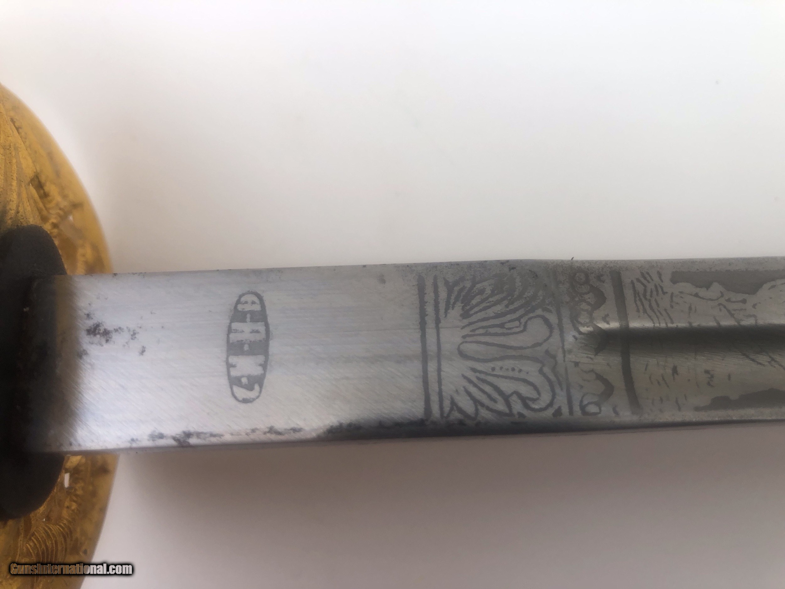 Description: A 19th Century Argentine Naval Officers Sword in leather scabbard with some type of white grip. The mounts are brass with gold wash. The blade is etched with anchors and a floral patern. Dimensions Overall in scabbard approx.33.5" Sword length approx. 32.5" Blade length 27.5" Blade width .76" Condition The sword is very good with great etching and retaining almost all of the gold wash on mounts The leather scabbard covering has several losses from some kind of animal chewing. SOLD |