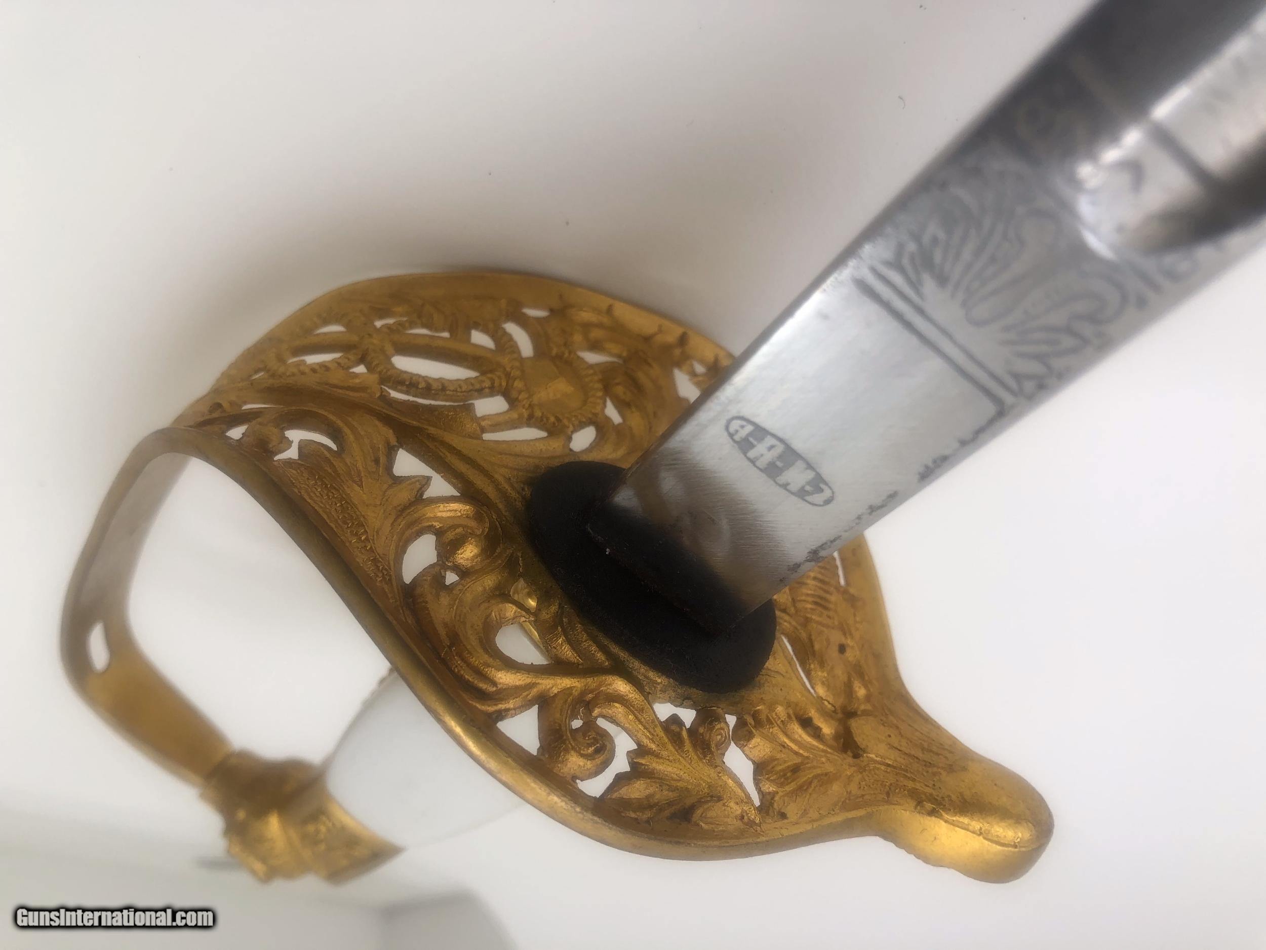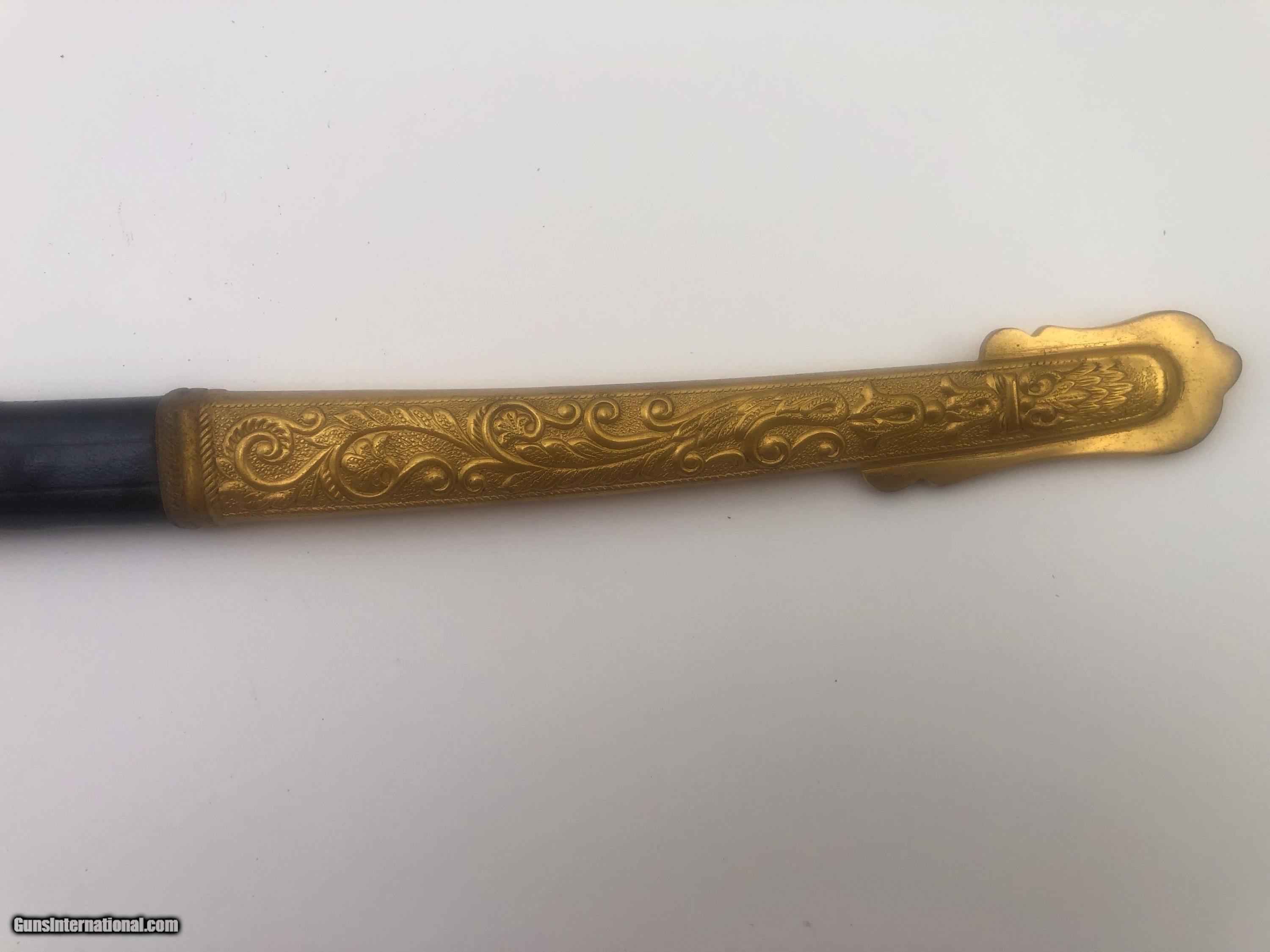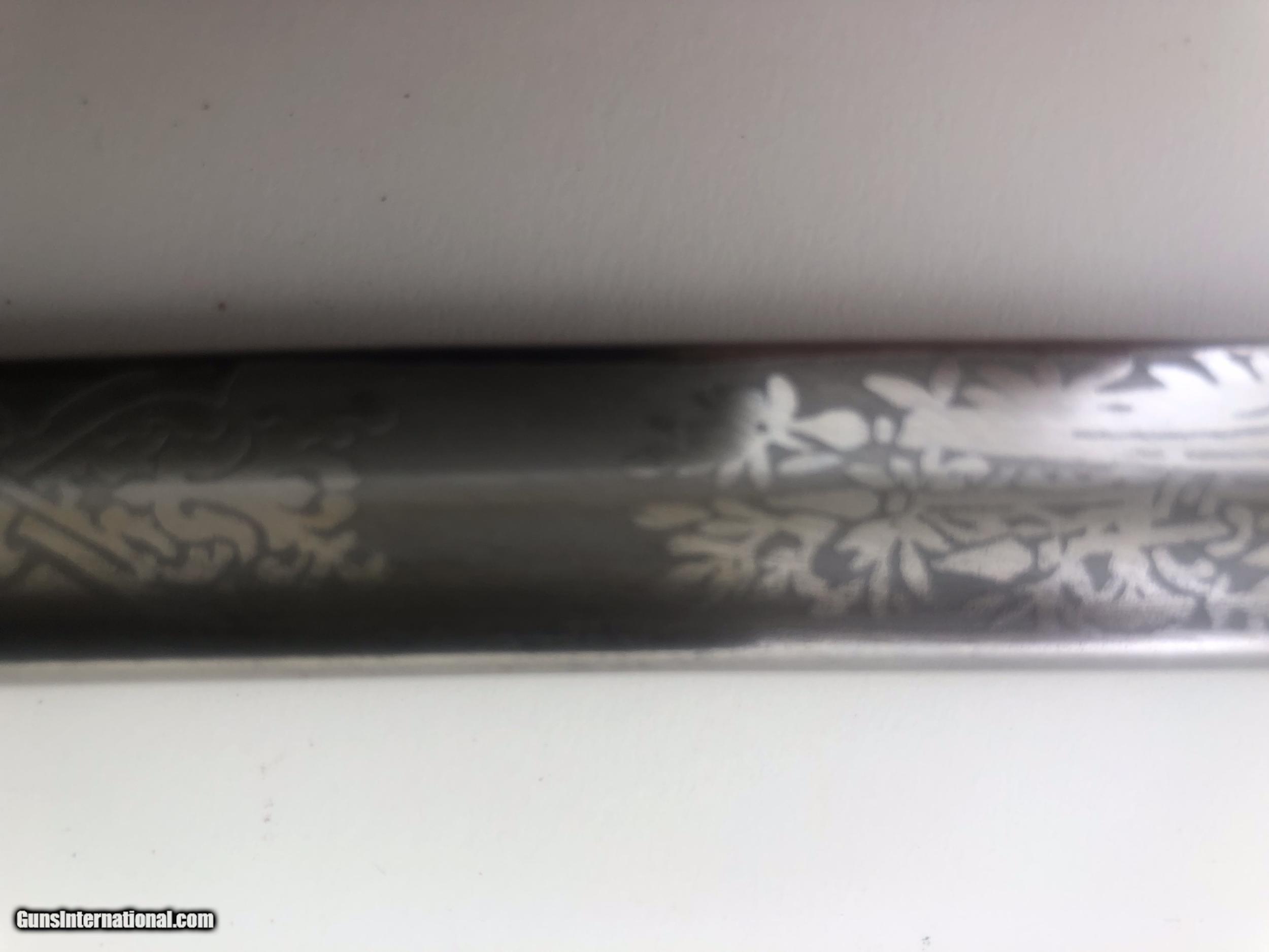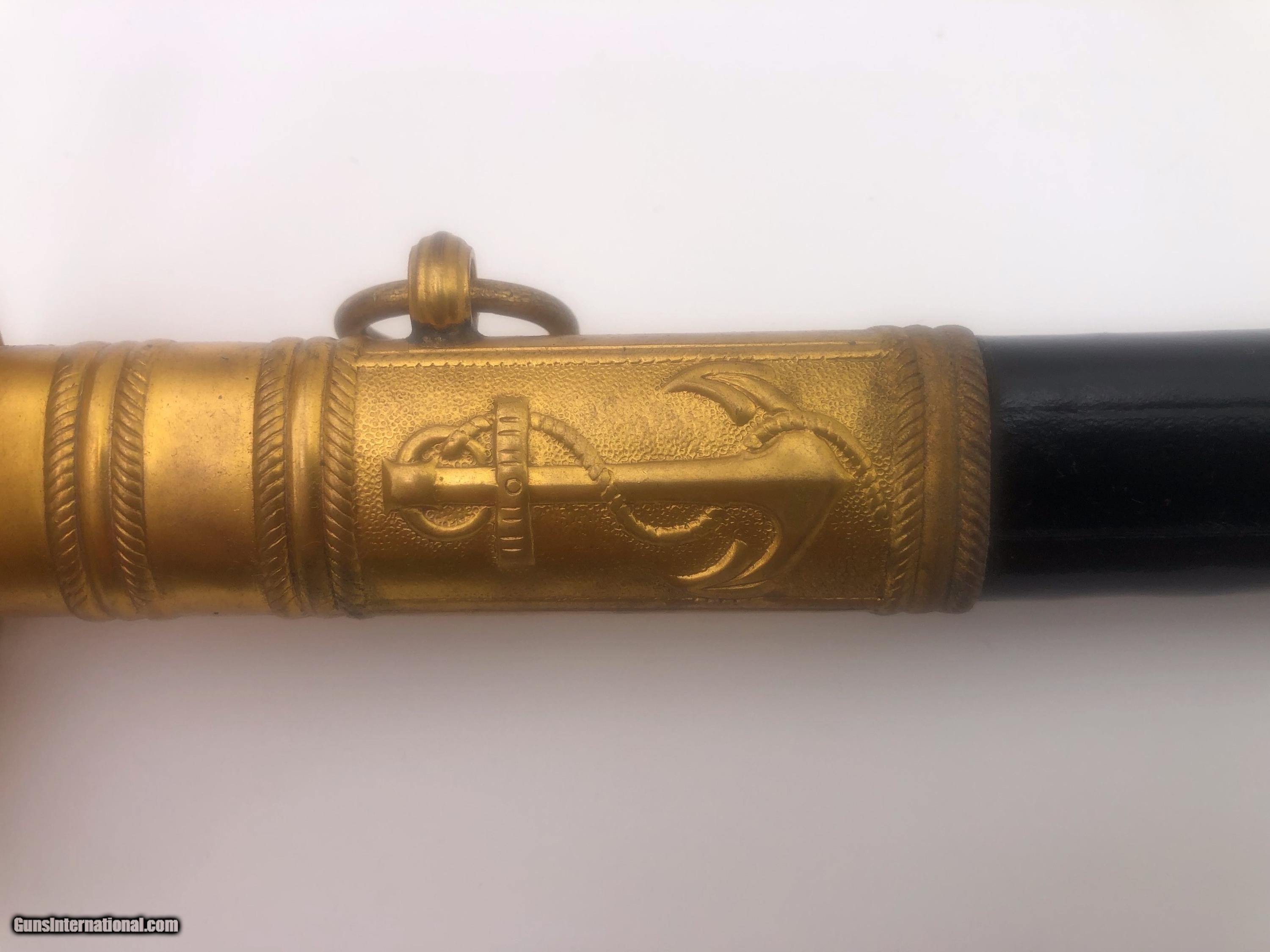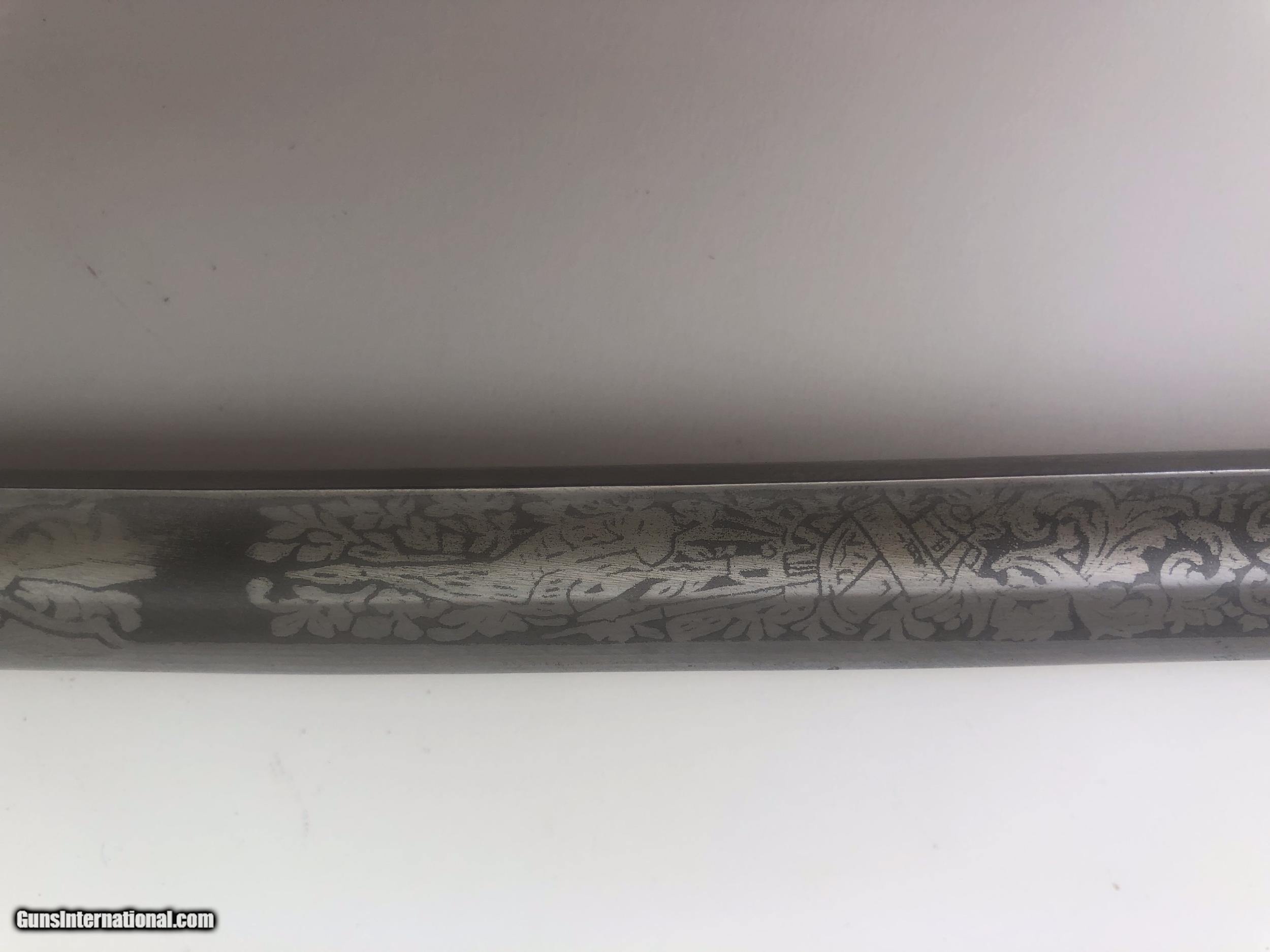 Description: A 19th Century Argentine Naval Officers Sword in leather scabbard with some type of white grip. The mounts are brass with gold wash. The blade is etched with anchors and a floral patern. Dimensions Overall in scabbard approx.33.5" Sword length approx. 32.5" Blade length 27.5" Blade width .76" Condition The sword is very good with great etching and retaining almost all of the gold wash on mounts The leather scabbard covering has several losses from some kind of animal chewing. SOLD |