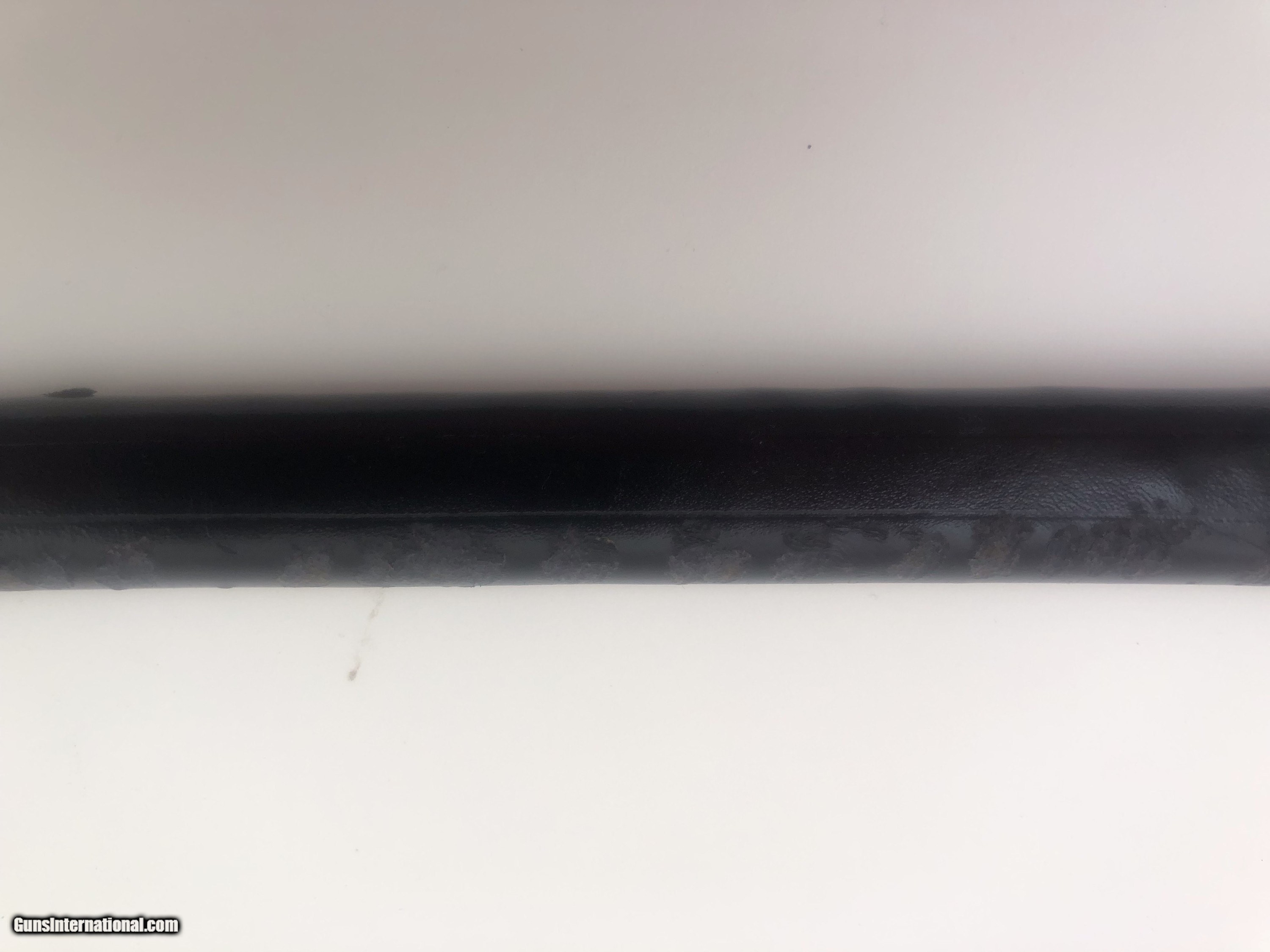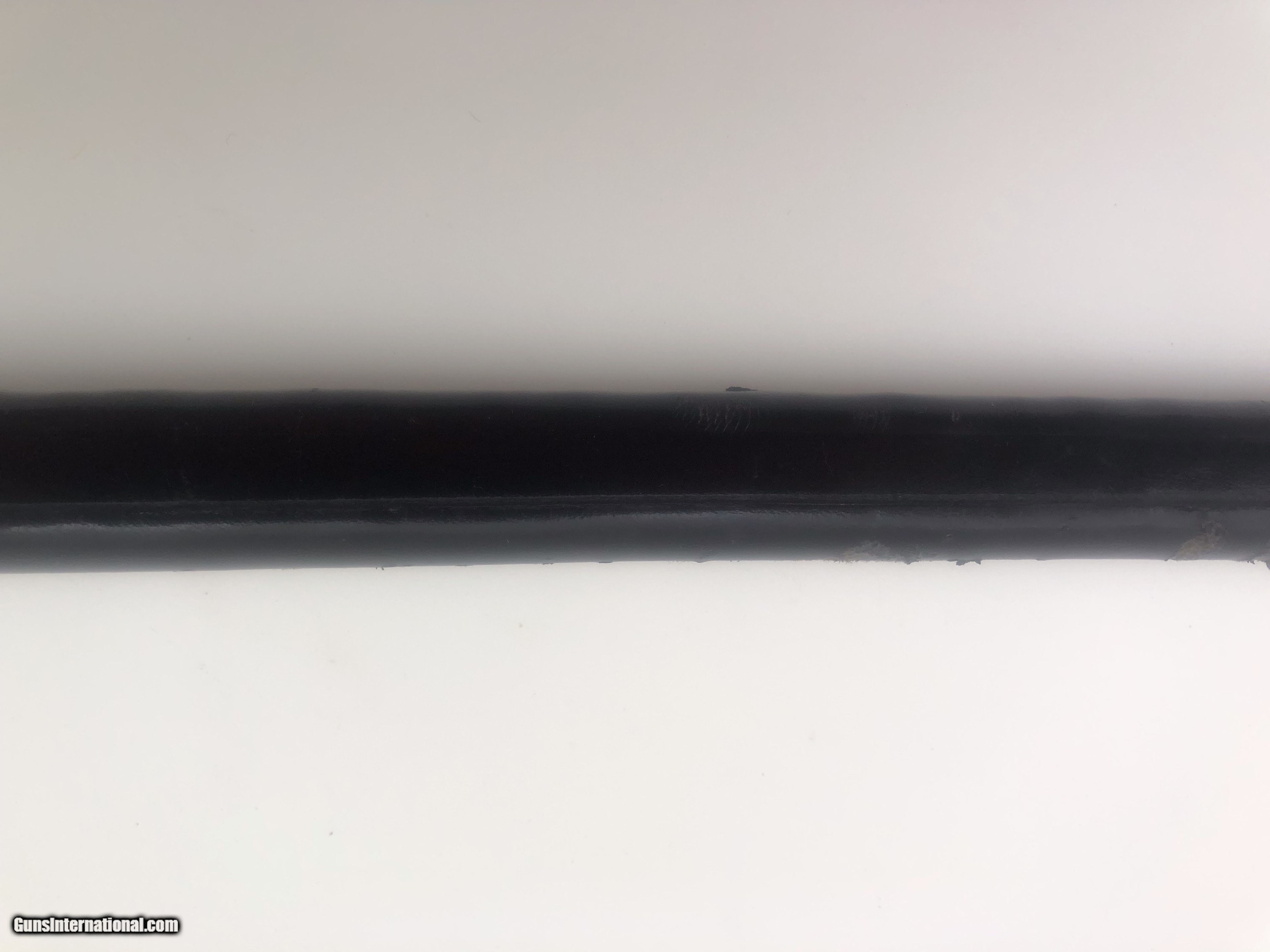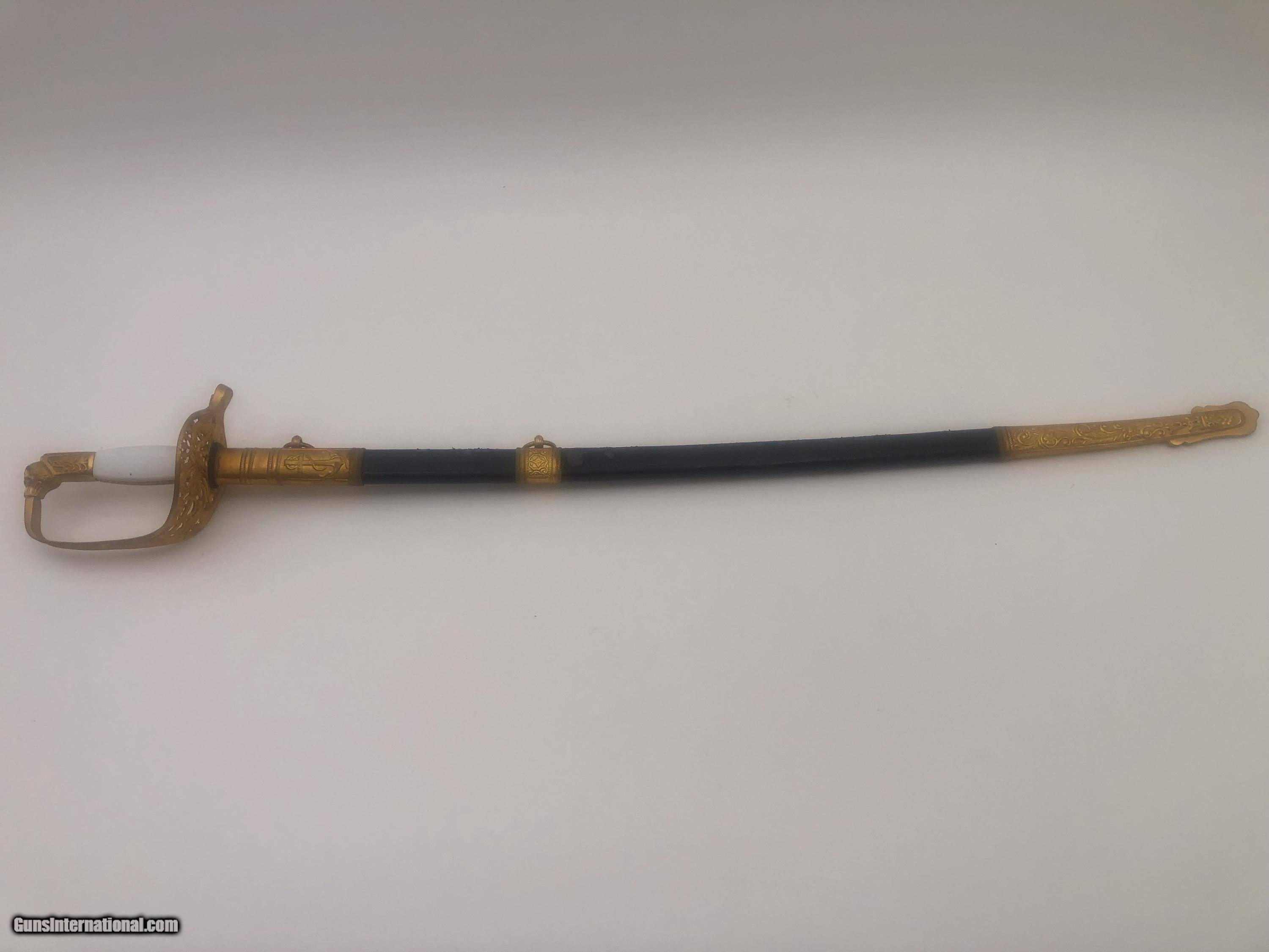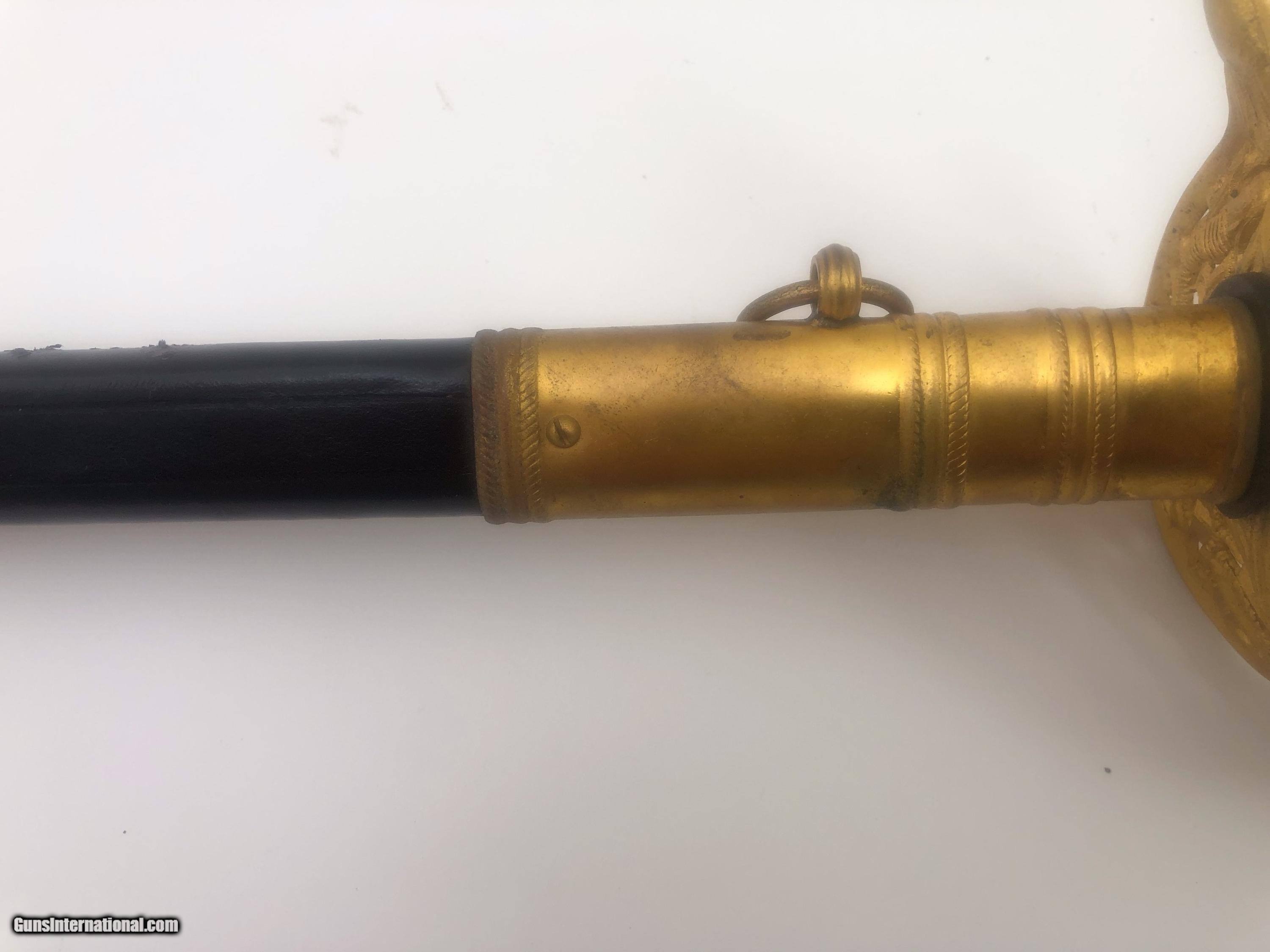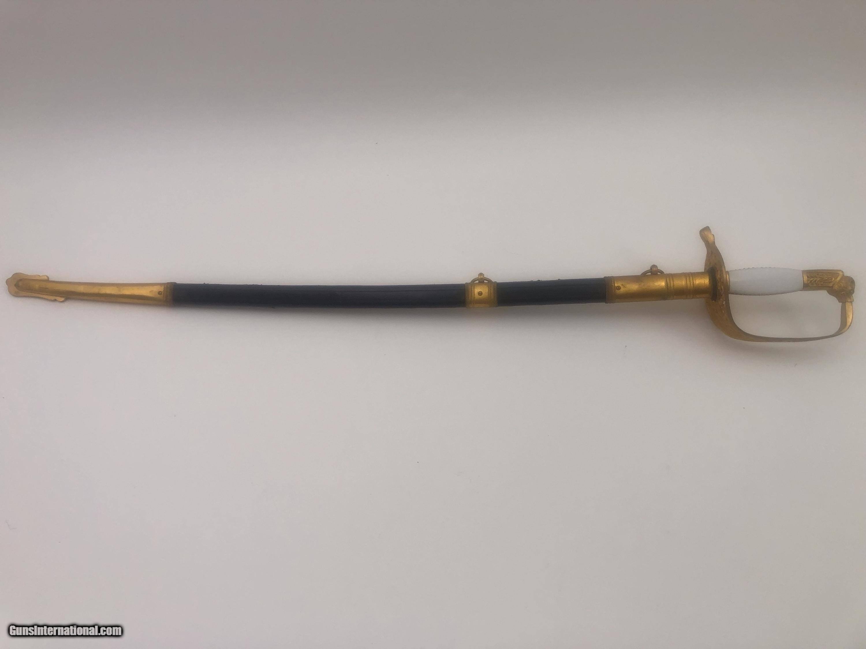 Description: A 19th Century Argentine Naval Officers Sword in leather scabbard with some type of white grip. The mounts are brass with gold wash. The blade is etched with anchors and a floral patern. Dimensions Overall in scabbard approx.33.5" Sword length approx. 32.5" Blade length 27.5" Blade width .76" Condition The sword is very good with great etching and retaining almost all of the gold wash on mounts The leather scabbard covering has several losses from some kind of animal chewing. SOLD |