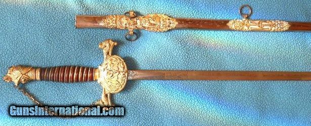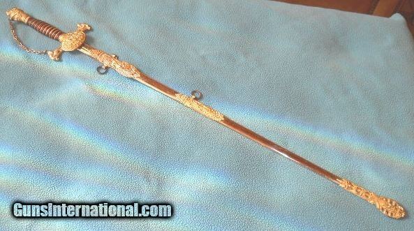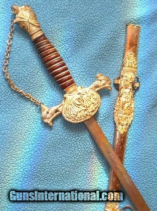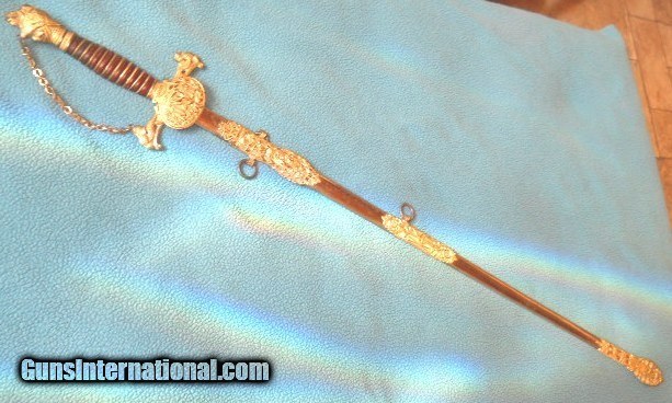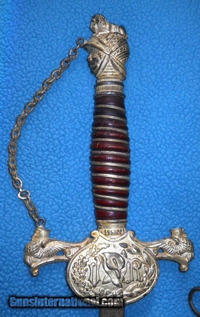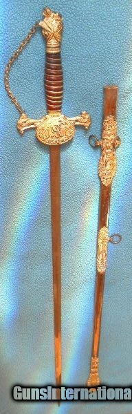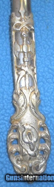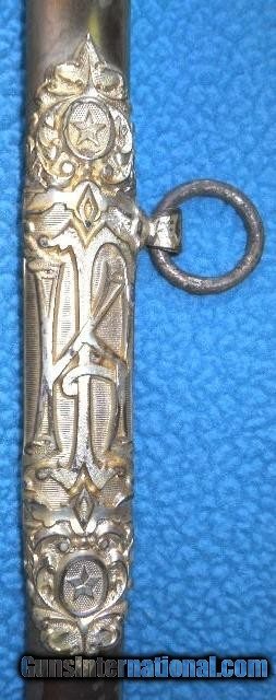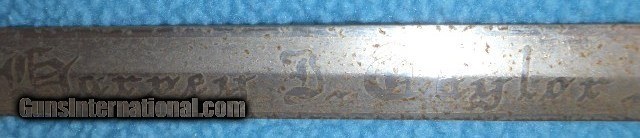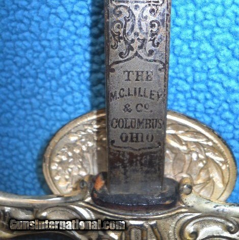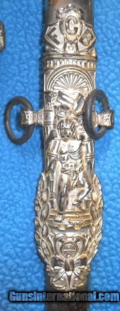 Description: FRATERNAL SWORD BY "THE M.C. LILLEY & Co." COLUMBUS, OHIO. 37 1/2" OVERALL WITH 30" BLADE WHICH IS EMBELLISHED WITH FROSTED PANELS OF FOLIATE SCROLL AND FRATERNAL IMAGES WITH THE ONE TIME OWNERS NAME "HARVEY D. TAYLOR" THE BLADE HAS OVERALL FRECKLING, NO HANDLING MARKS & THE ETCHING REMAINS CRISP. SCABBARD SHOWS FLECKS OF OXIDATION. THE SWORD & SCABBARD RATE VERY GOOD TO NEAR EXCELLENT OVERALL, AS PICTURED. $35.00 S&H EAST or $40.00 WEST OF THE BIG RIVER. SEE ALL "ESTATE ANTIQUES" LISTINGS FOR MORE GODIES FROM OLD TIME COLLECTIONS & ESTATES. SOLD |