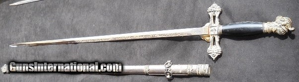 Description: VICTORIAN ERA MASONIC KNIGHTS TEMPLAR FRATERNAL SWORD & MATCHING SCABBARD BY PETTIBONE BROS. SWORD IS ABOUT 39 1/2" LONG WITH 32" BLADE THAT HAS GOLD ETCHINGS AND OWNERS NAME. BLADE IS MIRROR BRIGHT SHOWING VIRTUALLY NO WEAR or LOSS. HANDLE & SCABBARD HAVE MOST OF THE ORIGINAL FINISHES WITH HIGH EDGE WEAR, FLAKING & HANDLING. SWORD SHOWS NO LOOSENESS AND FITS SCABBARD PROPERLY. FANCY DESIGNS, RED AREAS APPEAR TO BE "RUSSIAN ENAMEL" $30.00 S&H DIRECT TO BUYER EAST OF BIG RIVER $35.00 BEYOND. SEE ALL "ESTATE ANTIQUES" LISTINGS FOR MORE INTERESTING ITEMS AT SENSIBLE PRICES FROM OLD TIME COLLECTIONS. SOLD |
