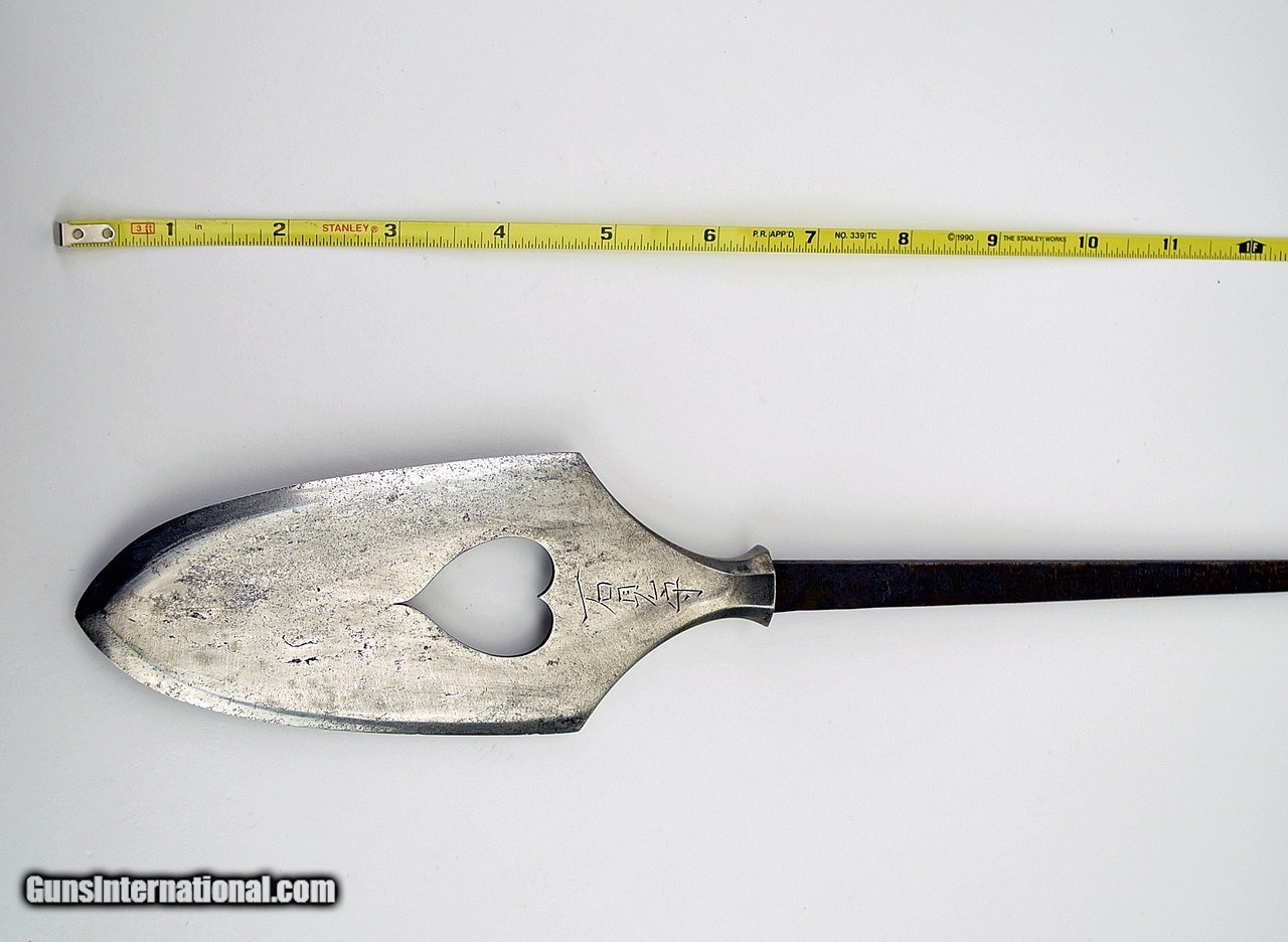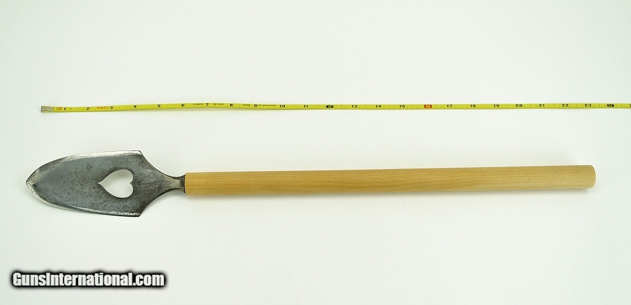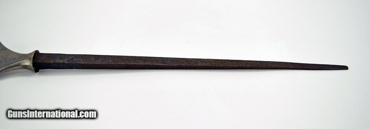Description: "A rare presentation arrowhead. A large, broad leaf shaped arrowhead with central Inume (Boars Eye). Signed on both shoulders: Iwami (No) Kami Fujiwara Kunisuke. Signed on the tang: Ganshu Wakahara Ju’ C Mon (No) Jo Taira (No) Ason Yoshishige Keihaku Hoai Aiganzan Shogun Jizo Daigongen Bu’un Chokyo Nyoi Monzoku Inoridokoro Itsui No Vchi and dated Toki Kanei Ju Roku Tsuchinoto U Reki Shogatsu Nijuyonichi (January 24, 1639). Arrowhead is 6 1/4" long (16cm) And 17" long overall (43.1cm). In Shirasaya lengthy inscription states that this piece was presented to the Shrine of Jizo Daigongen (War God) for continued victory in war. The donor, Wakayama Yoshishige, presented this Yanone on January 24, 1639 after the Tokugawa Shogunate consolidated power and unified the country. With certificate issued by Toensha dated August of 1977. SOLD |
