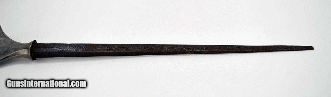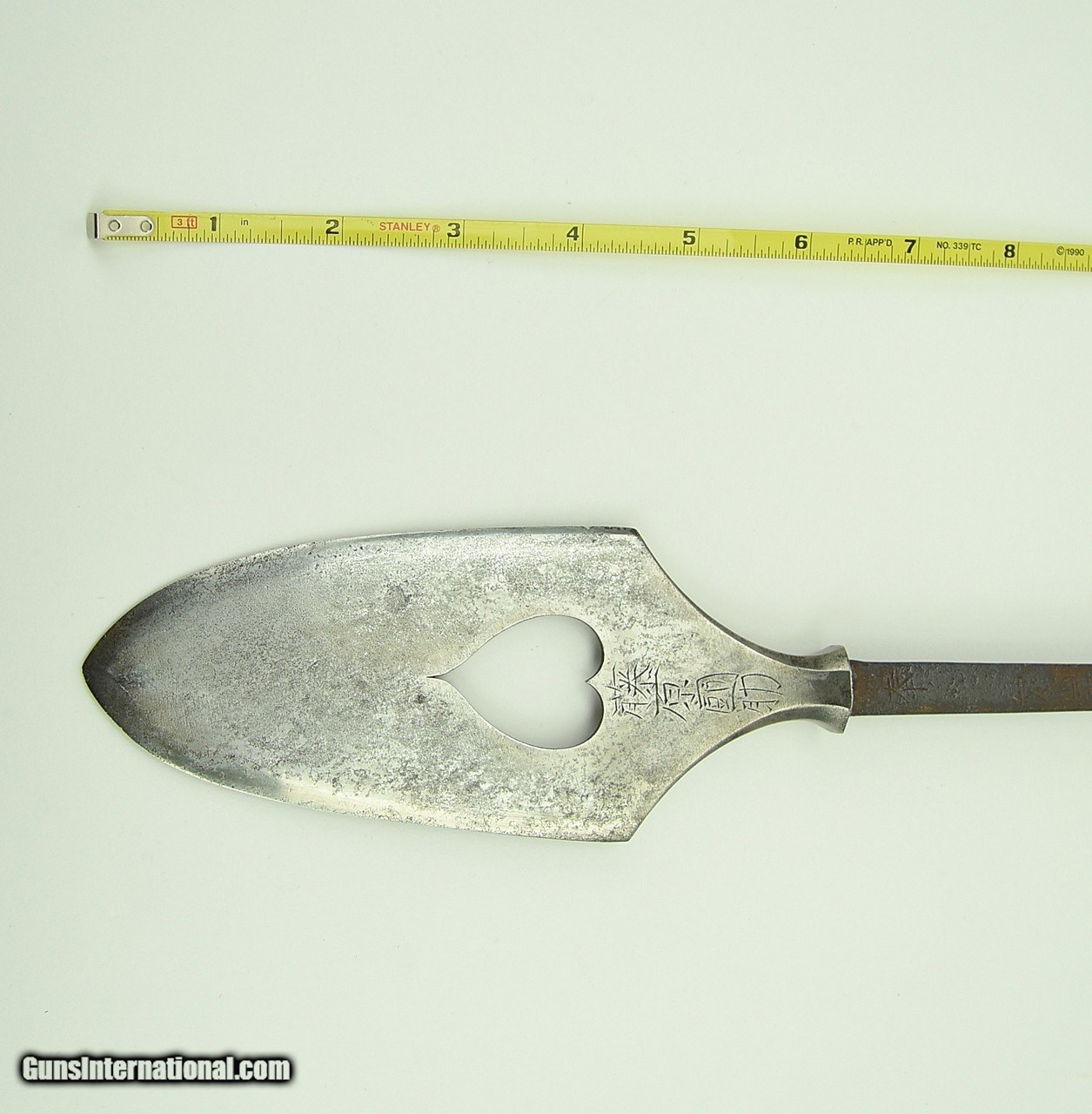 Description: "A rare presentation arrowhead. A large, broad leaf shaped arrowhead with central Inume (Boars Eye). Signed on both shoulders: Iwami (No) Kami Fujiwara Kunisuke. Signed on the tang: Ganshu Wakahara Ju’ C Mon (No) Jo Taira (No) Ason Yoshishige Keihaku Hoai Aiganzan Shogun Jizo Daigongen Bu’un Chokyo Nyoi Monzoku Inoridokoro Itsui No Vchi and dated Toki Kanei Ju Roku Tsuchinoto U Reki Shogatsu Nijuyonichi (January 24, 1639). Arrowhead is 6 1/4" long (16cm) And 17" long overall (43.1cm). In Shirasaya lengthy inscription states that this piece was presented to the Shrine of Jizo Daigongen (War God) for continued victory in war. The donor, Wakayama Yoshishige, presented this Yanone on January 24, 1639 after the Tokugawa Shogunate consolidated power and unified the country. With certificate issued by Toensha dated August of 1977. SOLD |