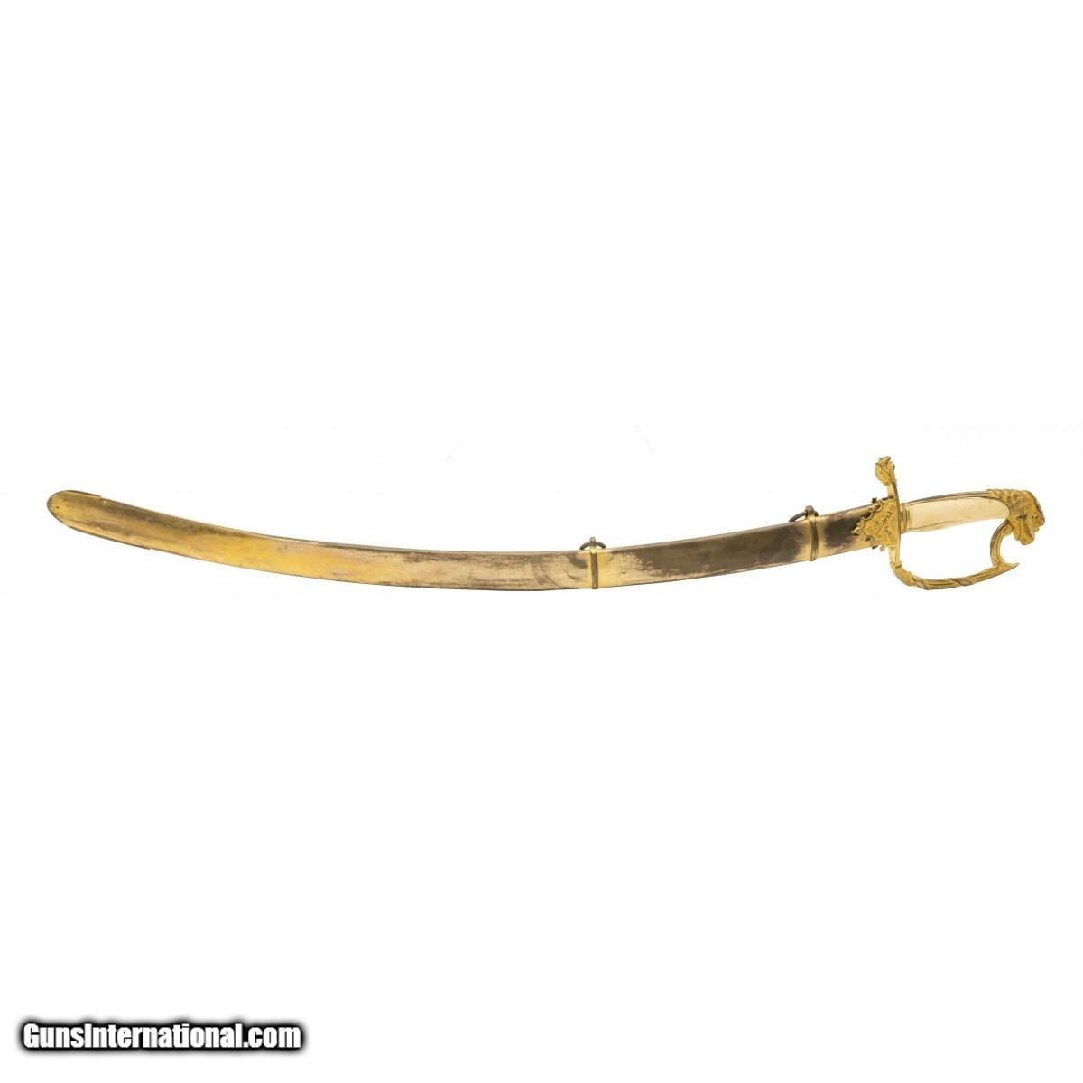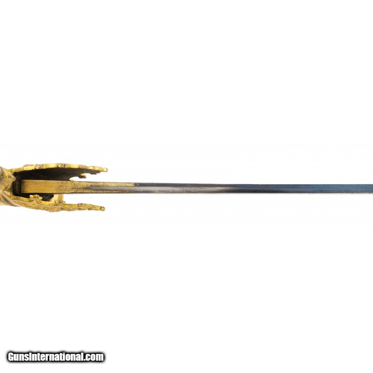 Description: "Absolutely beautiful sword circa 1815. Blade is 31" long and is etched in patriotic themes and finished in blue and gilt. Blade is excellent condition. Hilt is relief cast gilded brass with a fancy guard and even a decorated quillion. Eagle head is big and excellent. Scabbard is beautifully engraved in patriotic themes and is made of gilded brass. Truly a stunning sword! SOLD |