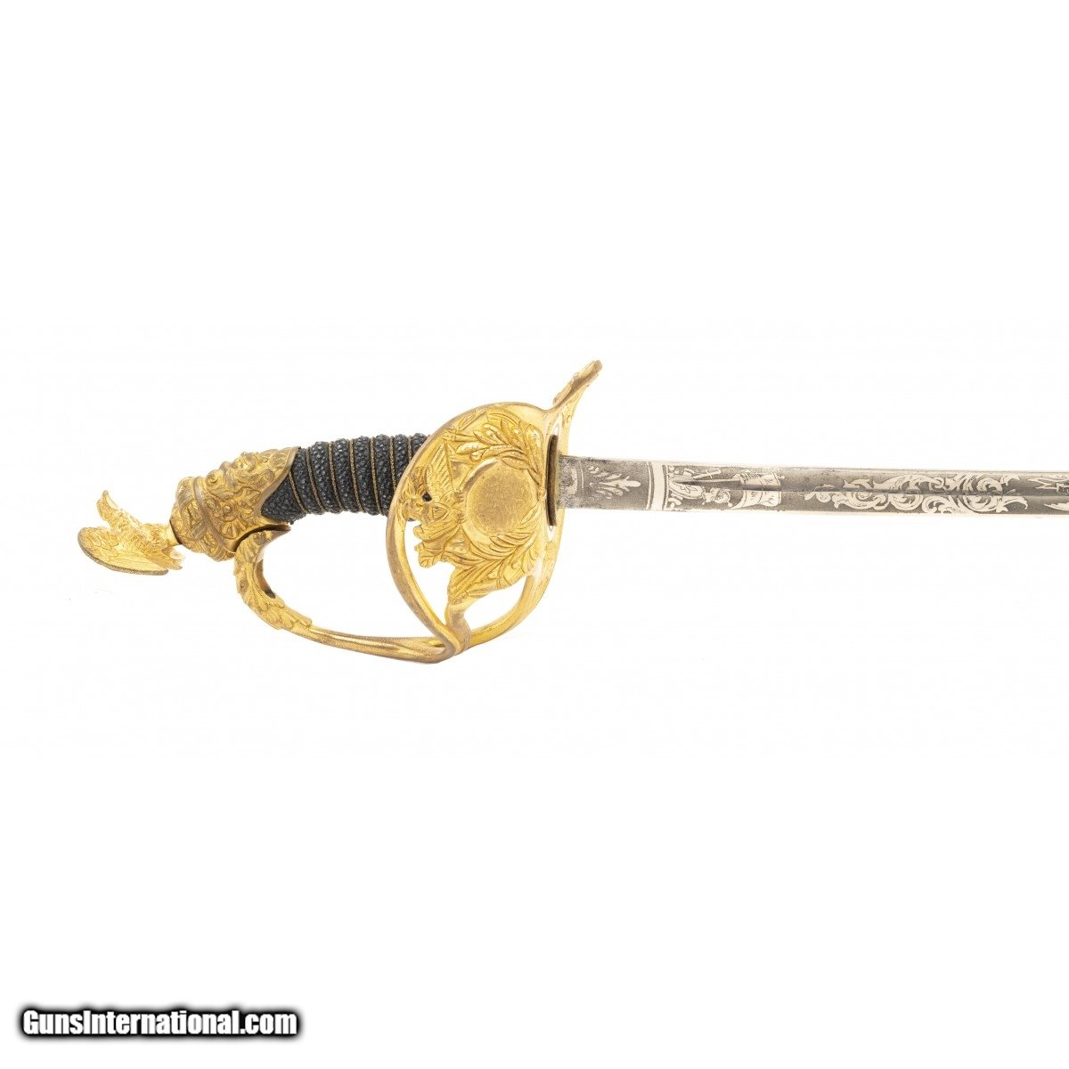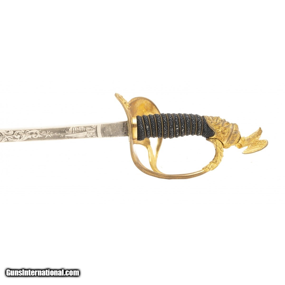 Description: "34" blade made by Pasquale Company. Blade is nickel plated with 95% of the nickel. Blade is acid etched with scrolls and patriotic themes. The hilt is high relief gilded brass. The pommel is a eagle with spread wings. The grip is brass wire wrapped stingray skin. The scabbard is nickel plated with relief cast gilded brass mounts. The presentation reads “Presented to/ Captain Thomas Eides/ BY THE MEMBERS OF Co H 1st Regt L.C.C/ Oct 14th 1903" This is an extremely fine Model 1872 sword and one of the fanciest we have handled. SOLD |