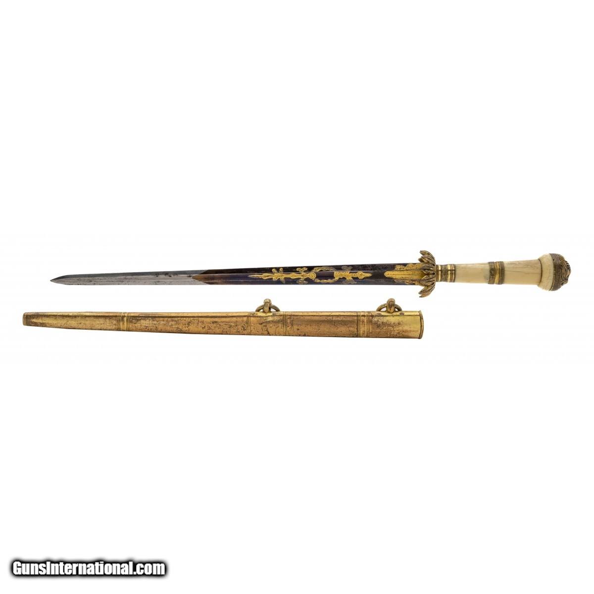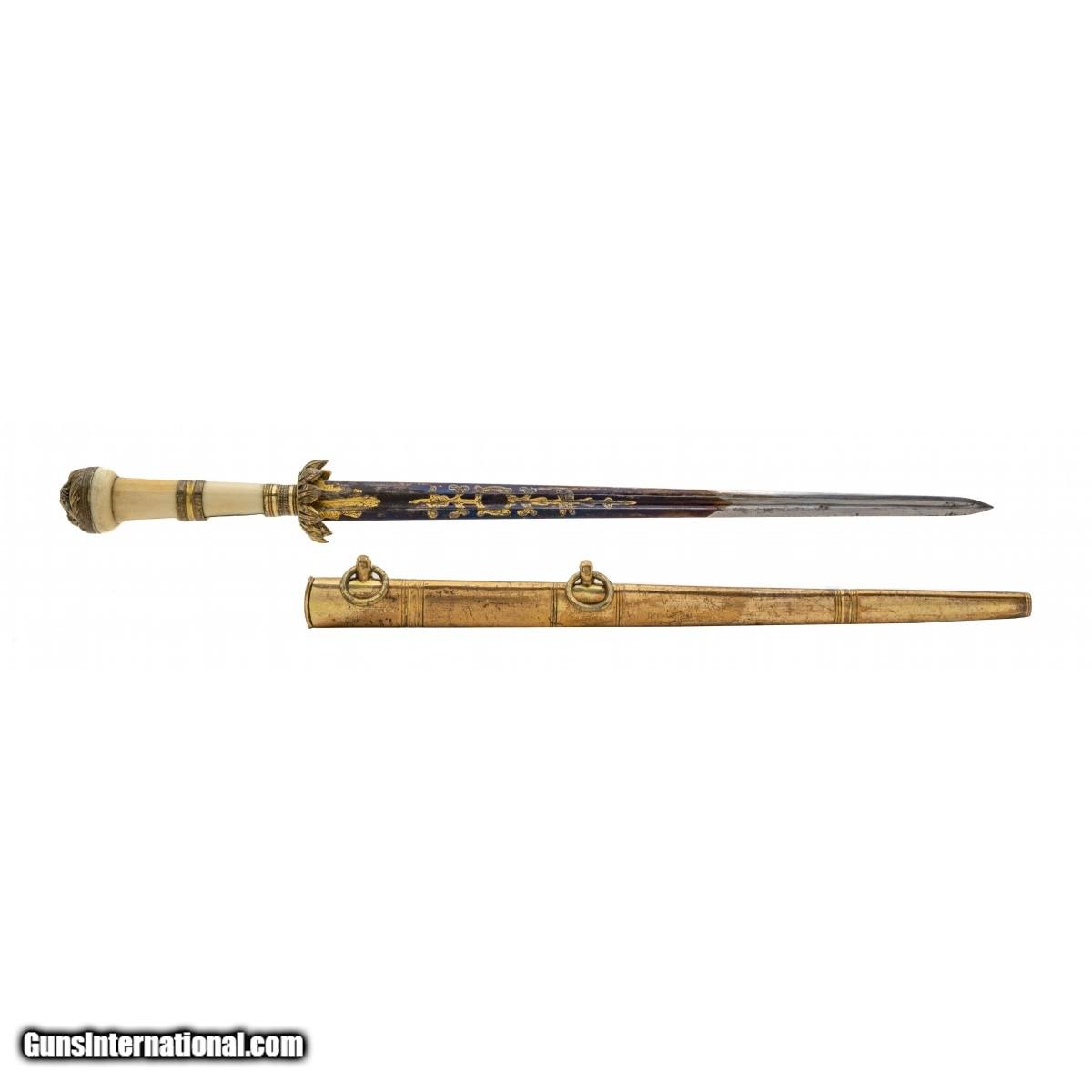 Description: "Circa 1800. Dirk has a 8 ½" blade and is 11 ¾" overall length. Very fine dirk in very fine condition. Blade has excellent blue and gilt. Guard, grip and pommel all have a round profile. The guard has an almost flower profile. Grips is ivory with a brass space. The pommel is a lion’s face. Brass scabbard is gilded. SOLD |