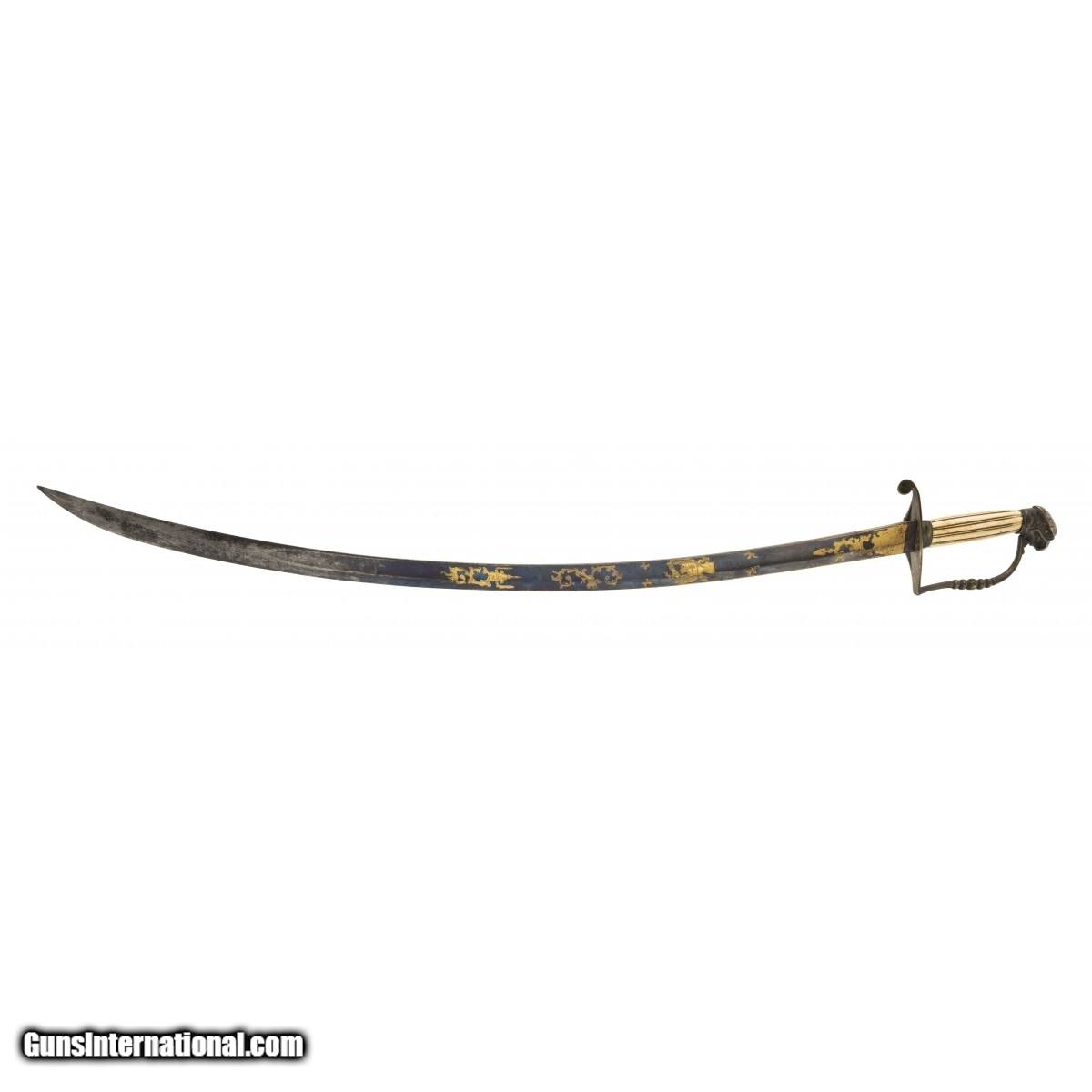 Description: "Circa 1820 – 1830. 33 ½" blade with blue and gilt finish. Blade is very good but does show some finish wear. Blade near the tip going towards the blue has a dark gray to black patina. Hilt is cast brass with a nice eagle. Grip is fluted ivory. SOLD |