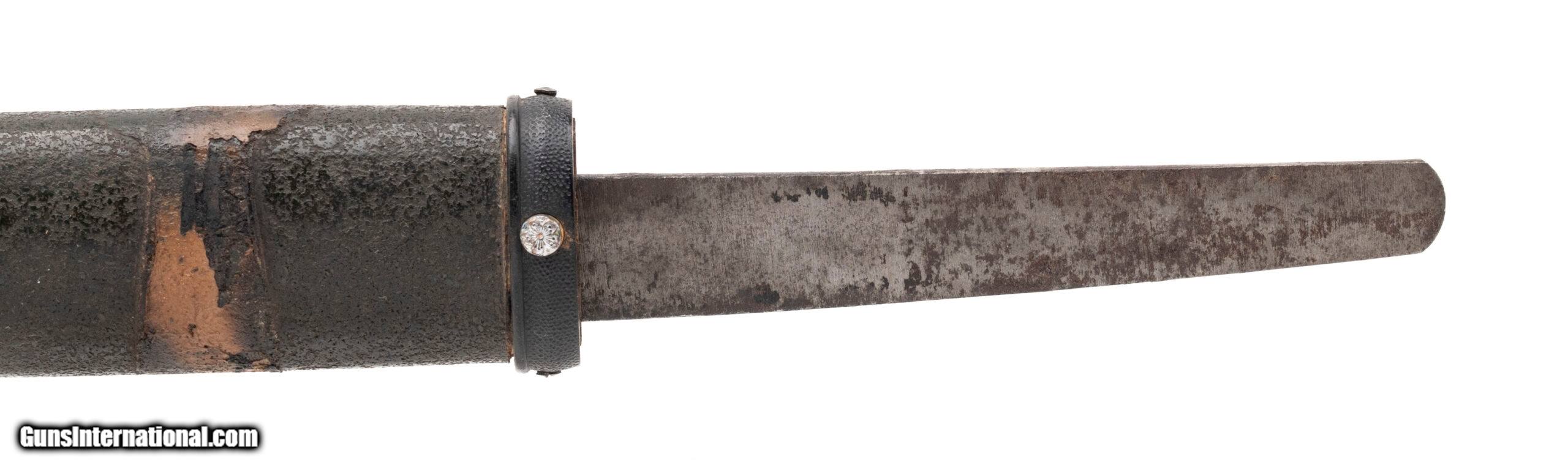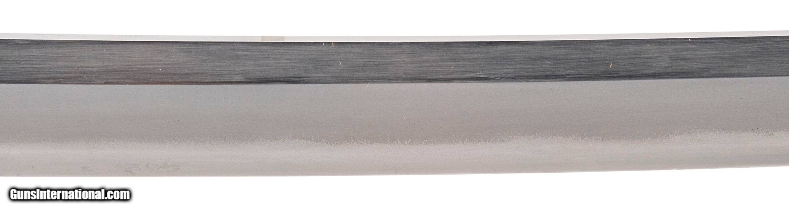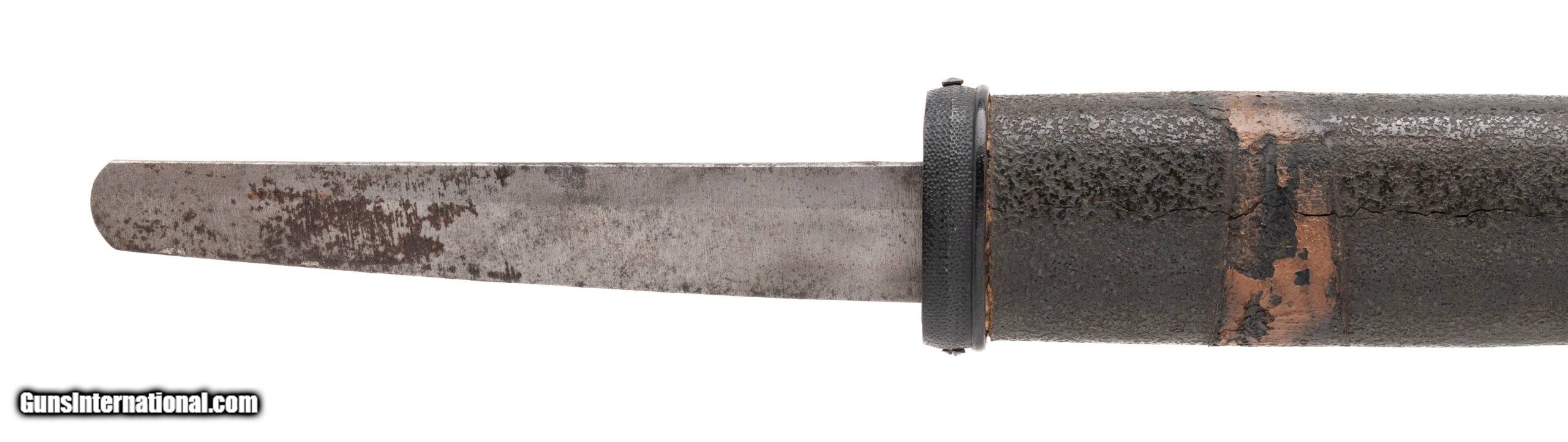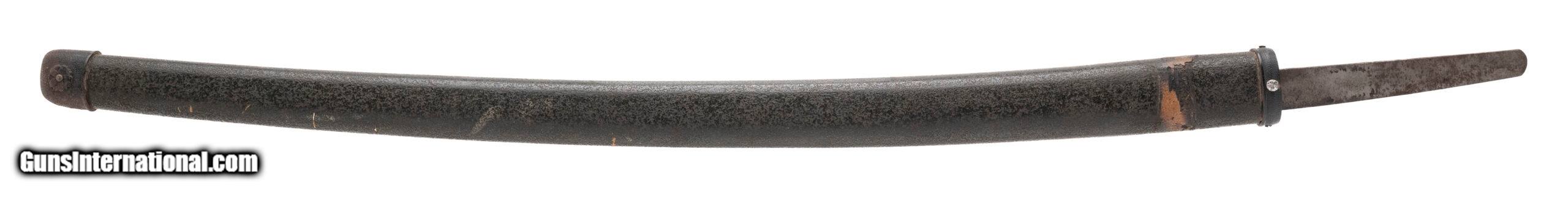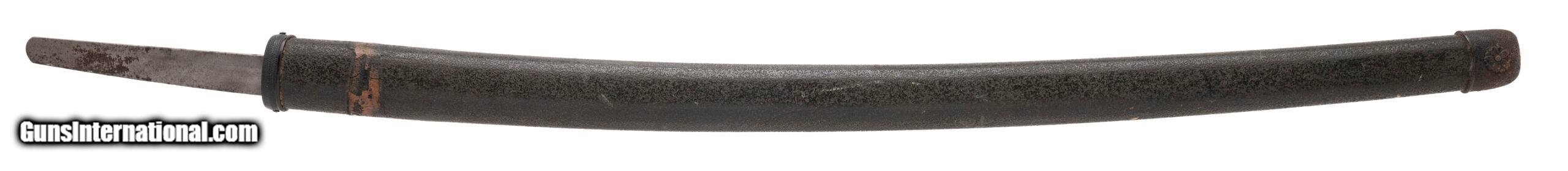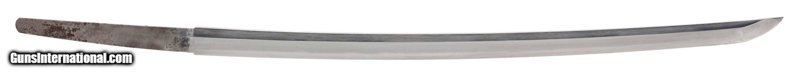 Description: "This is a traditionally made Japanese gendaito dating to the Showa period (WWII era). The blade measures 24.125 inches (nagasa) with a classic shinogi-zukuri form, visible yokote, and an active midare hamon showing good activity in the steel. The hada presents as itame, confirming that this is a hand-forged sword and not a mass-produced showato. The nakago remains untouched and bears no mekugiana, meaning the sword was never mounted with a tsuka. This strongly suggests it was removed directly from the smith or arsenal and brought back to the U.S. by a returning GI before it could be finished for military service. The nakago retains its natural patina and is unsigned (mumei). The sword is accompanied by a plain, field-grade saya, but no tsuka was ever fitted. Such never-mounted bring-backs are rare, representing swords halted in production as the war ended in 1945. Condition: Blade is in a bright polish, with hamon and hada well visible. Nakago shows natural aging with no alterations. Saya displays handling wear consistent with its age. An unusual WWII-era gendaito that was never drilled, never mounted, and brought back in unissued condition — a rare and desirable artifact of the period. Price: $1,595.00 Contact Seller |