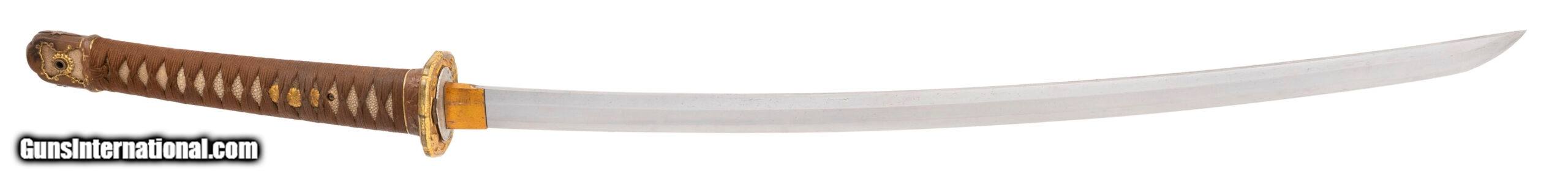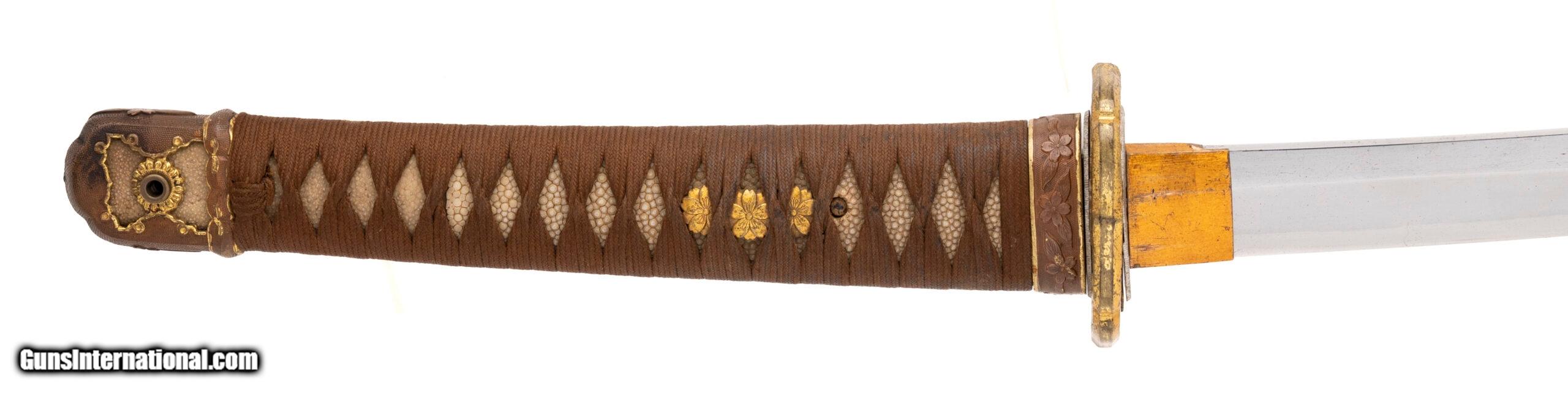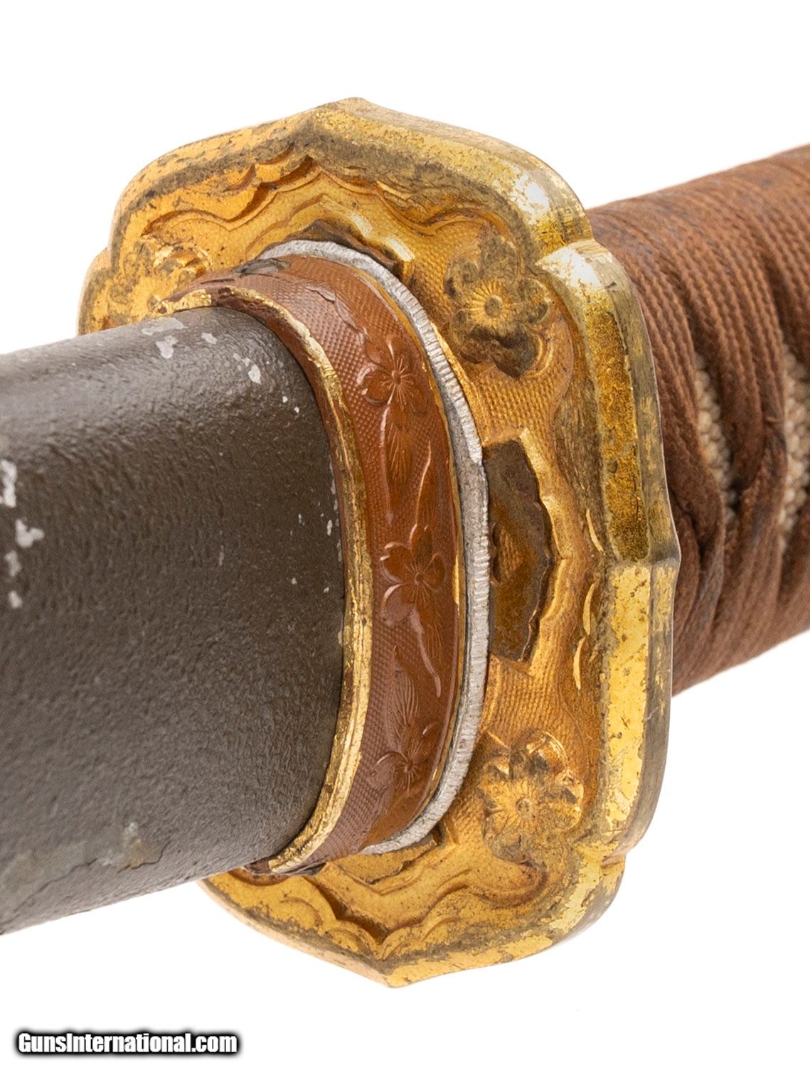 Description: "This is a traditionally-made Japanese katana, mounted in Imperial Army officer koshirae. The blade measures approximately 26.25" and features a wide body with long o-kissaki and graceful curvature (toriizori), typical of the late Edo shin-shinto revival style. The blade shows a prominent notare-midare hamon with bright activity and a well-forged itame hada visible in the ji. The nakago is ubu (unshortened) with a single mekugi-ana, unsigned (mumei). Condition is good with a relatively recent polish that displays the temperline and grain clearly. The sword is accompanied by WWII-era gunto officer mounts, including gilt brass tsuba, fuchi-kashira, and menuki, as well as traditional tsuka-maki. This type of koshirae was commonly fitted for older family blades carried by Japanese officers during the Second World War. Overall, this is a fine example of a genuine Japanese katana forged during the shin-shinto period (late Edo, circa 1780–1860) and remounted for use in WWII. It represents both the long martial tradition of the samurai and the later history of 20th century Japan. Price: $2,795.00 Contact Seller |