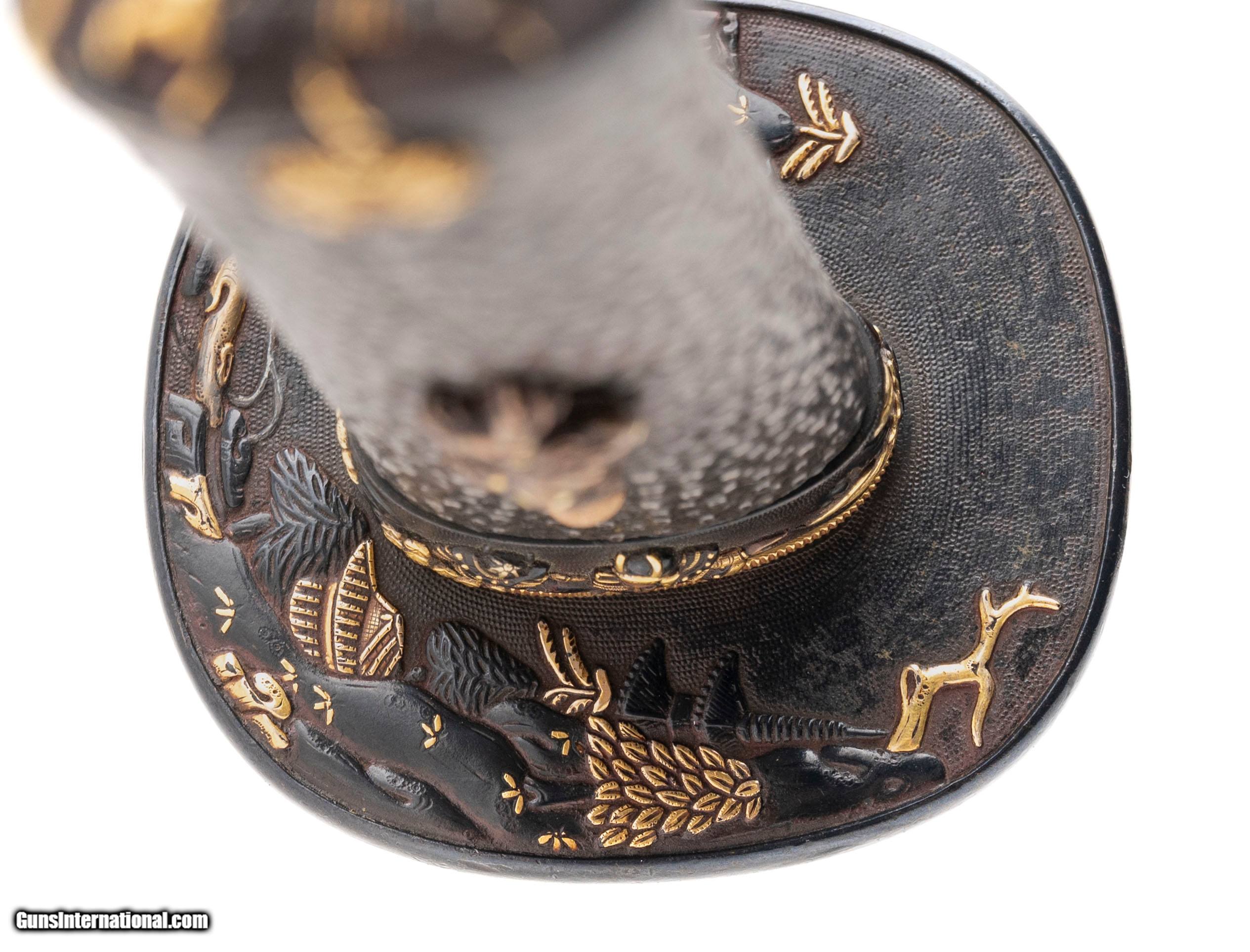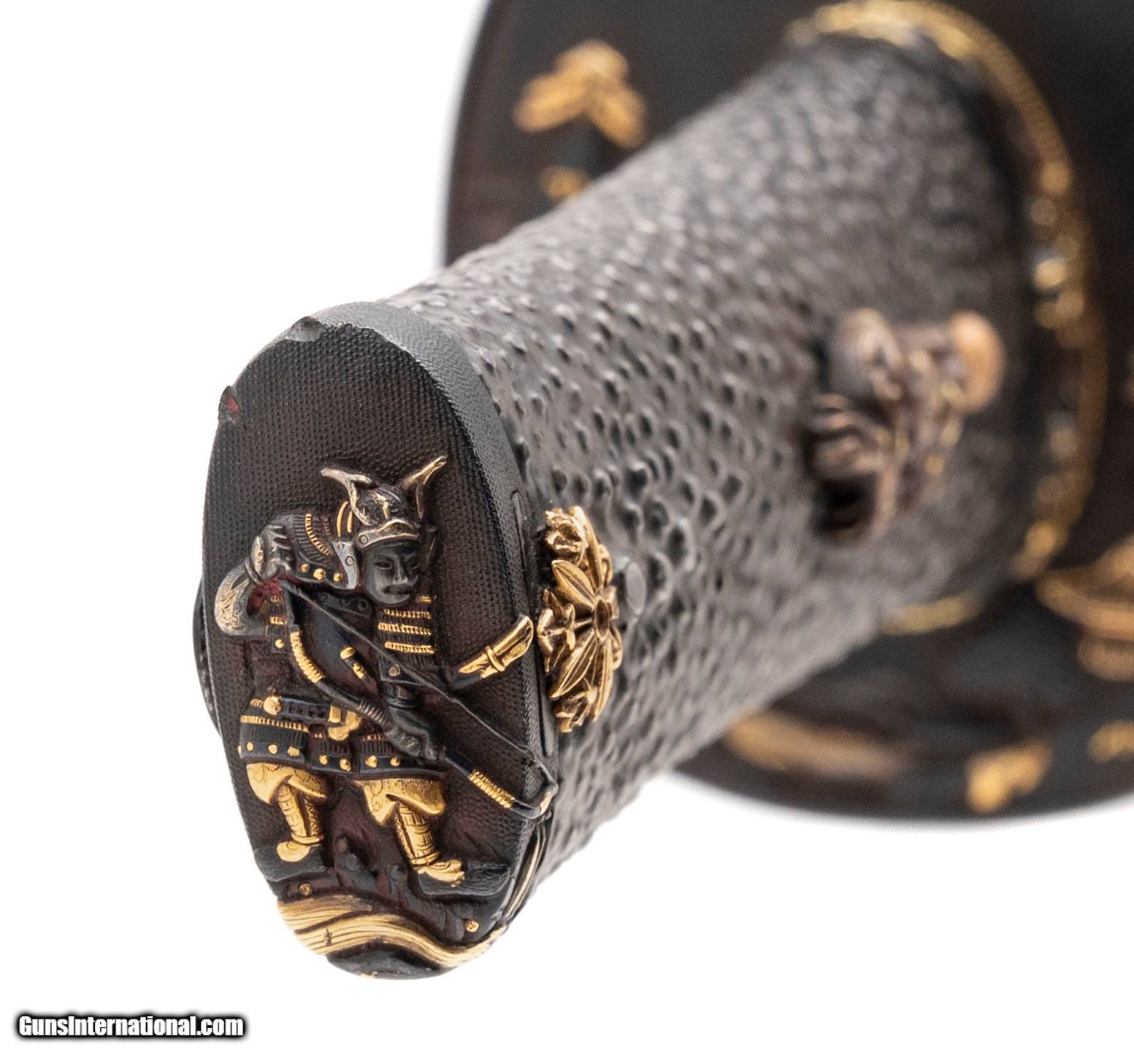 Description: "This is a fine Japanese tanto signed “Kanekuni" (??) of the Mino tradition, dating to the Koto period (late Muromachi, 16th century). The blade measures 12.125 inches (30.8 cm) and is mounted in elaborate Edo-period samurai-themed koshirae. Blade The tanto is forged in hira-zukuri form with a wide body and elegant proportions. The hamon is an active gunome-midare with strong activity and a sweeping kaeri extending well back onto the mune. The hada is visible in the ji, showing a flowing itame typical of Mino workmanship. The tang is ubu, signed Kanekuni (??), with two mekugi-ana — the lower mekugi-ana reinforced with a metal collar insert, a feature seen on older blades re-mounted for continued use. The nakago retains a deep, even patina, with clear chisel work on the mei. Koshirae The mounts are of very high quality, themed around the samurai warrior: • Saya: Ribbed lacquer saya with kozuka slot, retaining excellent finish. • Kozuka: Shakudo with nanako ground, decorated in gilt and copper with a procession of armored samurai; signed on the reverse. • Fuchi-kashira: Iron with gilt inlay. The kashira features a warrior in full armor with bow and yari, while the fuchi depicts complementary martial motifs. • Menuki: Finely detailed gilt shishi (lion-dogs) on shakudo, mounted under samegawa grip. • Tsuba: Iron with nanako ground and gilt inlay, decorated with battle and landscape elements in high relief. • Kashira (pommel): Decorated with a gilt armored samurai in dramatic pose. • Kojiri (butt of saya): Decorated with gilt motifs including a squirrel and vine. • Other fittings: Matching gilt and shakudo elements, all unified in theme and execution. • Habaki: A well-fitted solid gold habaki adds both value and prestige. Commentary This tanto is a superb example of the artistry of the Mino tradition combined with Edo-period koshirae craftsmanship. The blade, signed Kanekuni, represents Koto period work from the Sengoku era, while the koshirae showcases later Edo decorative metalwork at its finest. The reinforced mekugi-ana reflects its practical use and re-mounting across generations. Together, the signed blade, luxurious mounts, and gold habaki create a tanto of both martial heritage and high artistic appeal. Price: $9,500.00 Contact Seller |