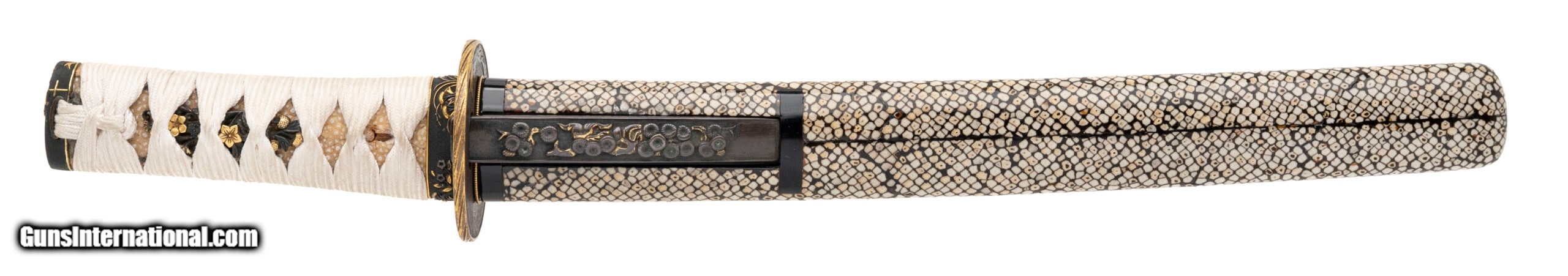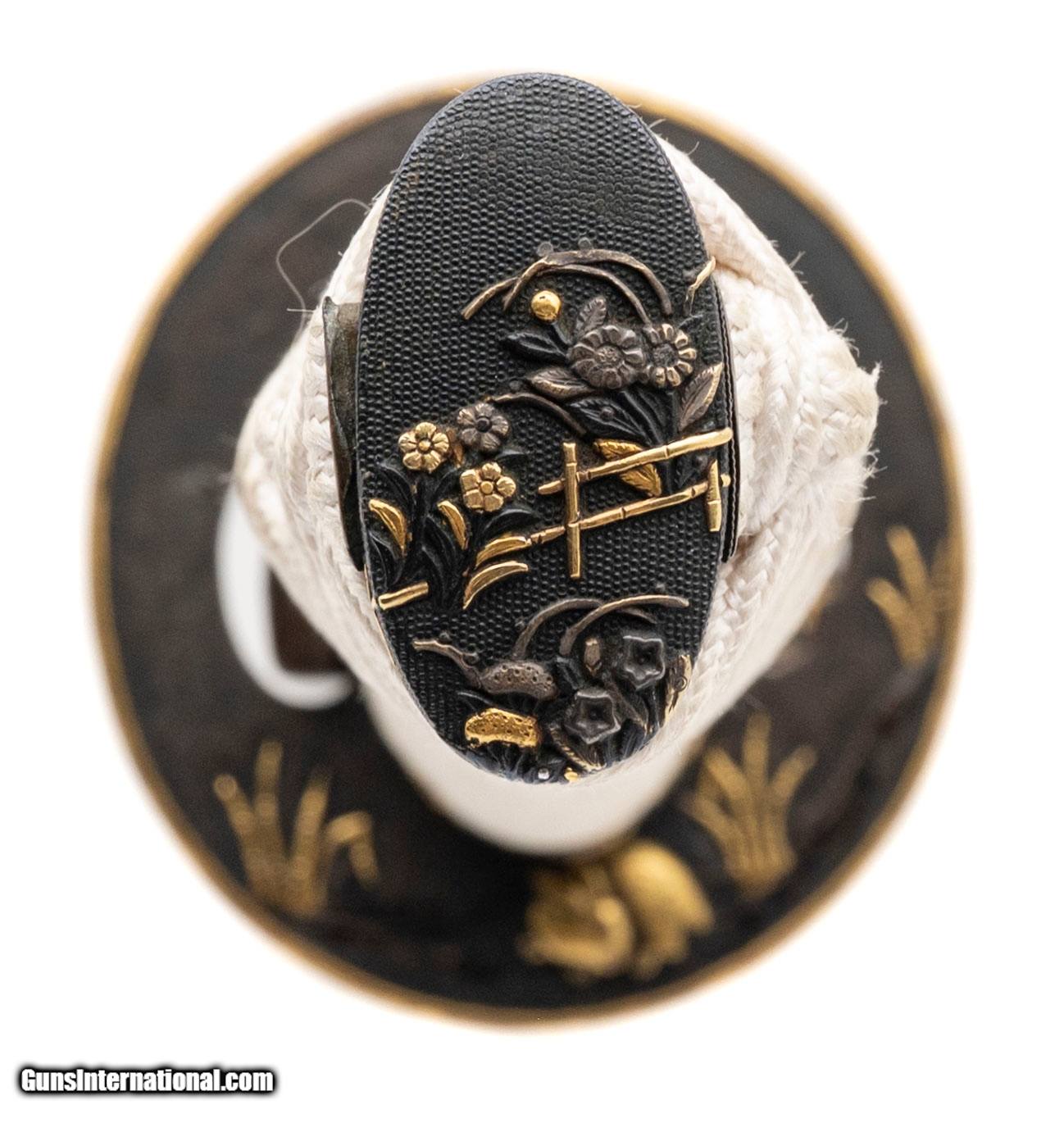 Description: "A handsome Shin-Shinto era tanto with a blade measuring 9 11/16 inches. The blade shows some cloudiness and would benefit from a professional polish, but retains good shape and period character. The mounts are of very fine quality: the saya and tsuka are covered in samegawa (ray skin), with the tsuka tightly wrapped in white ito. The fuchi and kashira are decorated in shakudo with gilt floral motifs, and the menuki are worked in mixed metals with fine gilding. The tsuba is a round iron plate with gilt accents depicting a rabbit among grasses. The kozuka and kogatana are included, the handle decorated en suite with the other fittings and the blade showing engraved designs. Overall, a high-quality presentation tanto, combining a Shin-Shinto blade with very attractive fittings. Measurements: • Nagasa (blade length): 9 11/16" • Period: Shin-Shinto (late Edo into 19th century) • Condition: Blade cloudy, in need of polish. Mounts excellent with rich detail and patina SOLD |