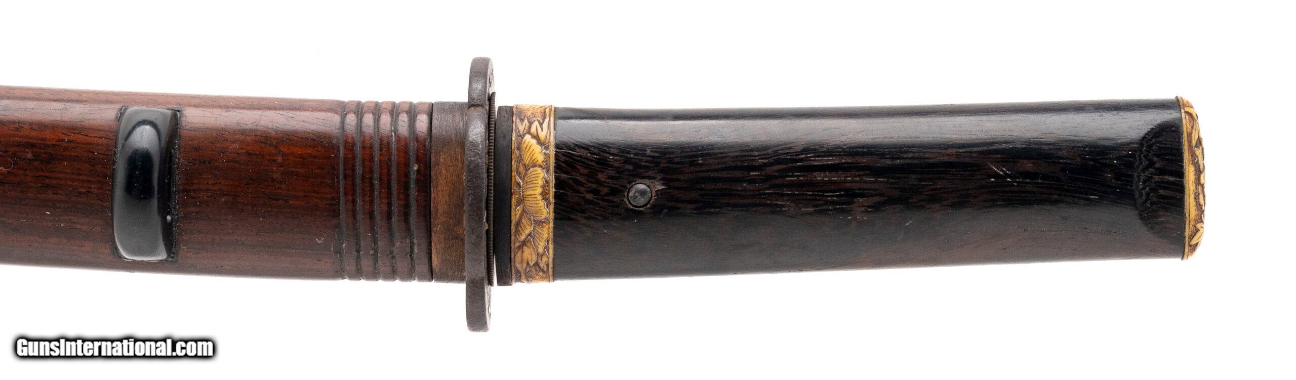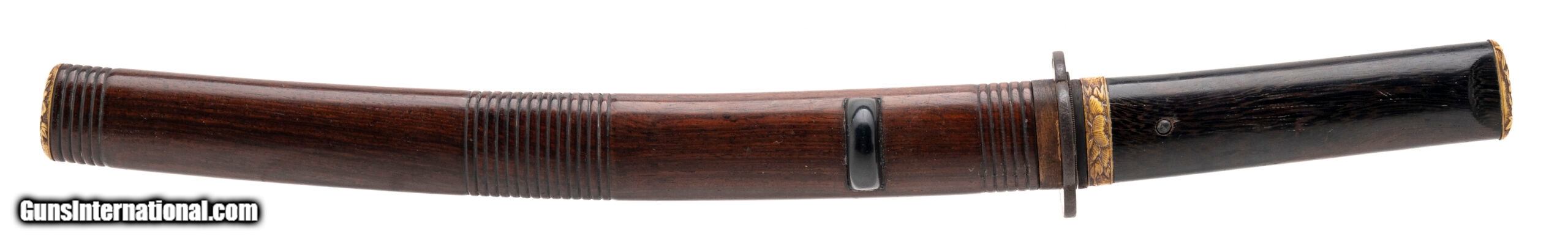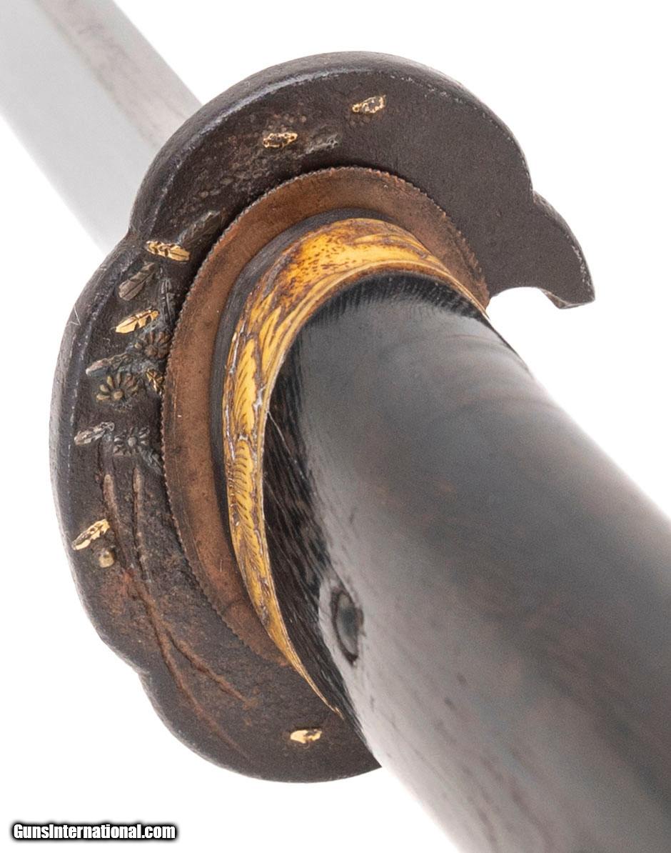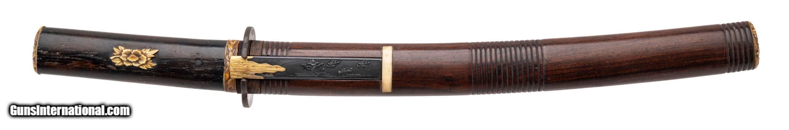 Description: "Blade: A slender ko-tanto with a nagasa of 9.125", straight form (hira-zukuri sugata) with no shinogi ridge. The blade is ubu (unaltered) with two mekugi-ana, and a silver-plated habaki accompanies it. The surface is bright in polish, though somewhat cloudy in places, with a visible straight suguha hamon that is subdued but present along the ha. A few light scratches and areas of surface oxidation are evident, though the edge remains sharp and well defined. Nakago: Ubu with patina appropriate to age, two mekugi-ana, unsigned (mumei). Koshirae (Mounts): The tanto is mounted in fine Edo-period fittings: • Saya: Ribbed lacquer saya in brown with black lacquer sections. The saya includes a kozuka pocket, fitted with a shakudo kozuka decorated with birds among reeds, accented with gilt details and a gilt upper section resembling dripping gold. • Kozuka: Shakudo ground with fine nanako-style texture, decorated with flying birds in takazogan with gilt highlights, capped in gilt with a motif resembling molten gold. Blade (kogatana) present. • Tsuba: Small iron tsuba of irregular mokko-gata form, with simple carved outlines and scattered gold nunome inlay, showing age patina. • Fuchi/Kashira: Dark mounts decorated with gilt floral inlay, with matching gilt kashira cap carved in chrysanthemum motif. • Menuki: Gilt floral ornaments (chrysanthemum) inset into the tsuka. Condition: The blade is bright and healthy, though with a somewhat hazy hamon. Mounts are complete and matching, showing expected wear and lacquer loss, but retain their aesthetic appeal. The kozuka and its detailed workmanship add considerable interest. Remarks: This is an attractive example of a ko-tanto in full Edo-period mounts, notable for its elegant koshirae and inclusion of a decorated kozuka. Its compact size, at just over 9", makes it a classic samurai sidearm. Price: $2,995.00 Contact Seller |