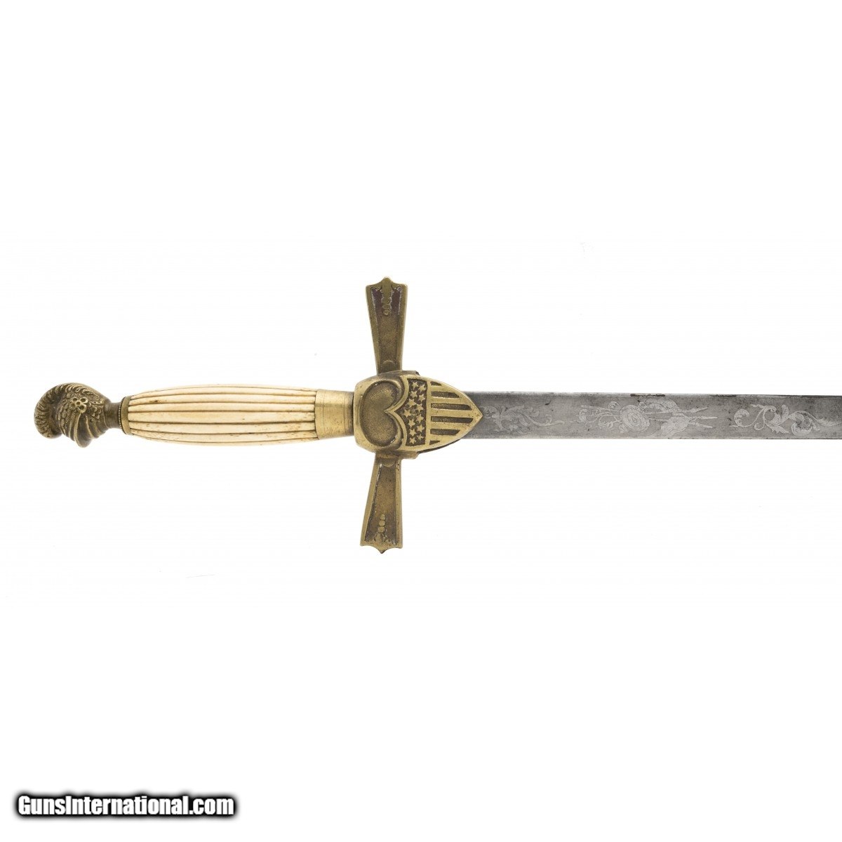 Description: "Circa 1830. This is a Helmet Head Pommel sword with a 25 ½" blade with a acid etched blade. Hilt is cast brass with a shield on the guard with 13 stars for the original 13 colonies. The grip is fluted ivory. The scabbard is a period replacement and the scabbard is longer than the sword. SOLD |