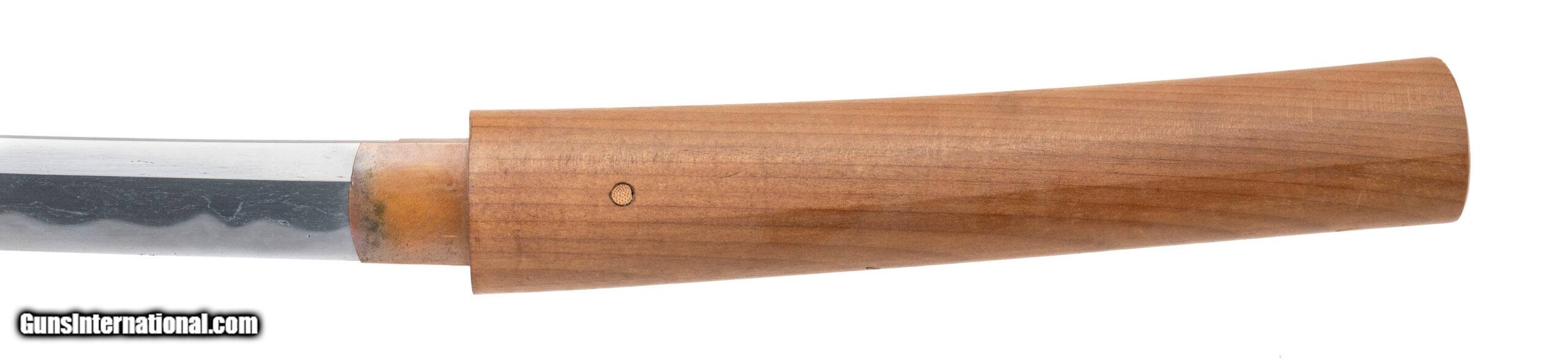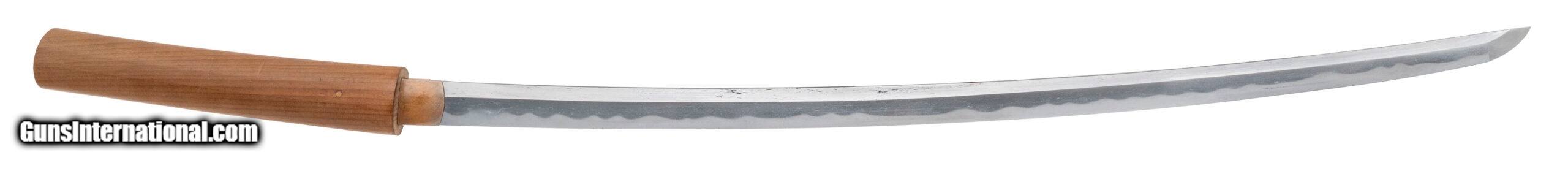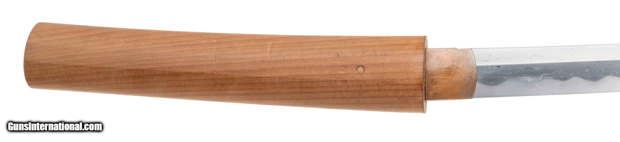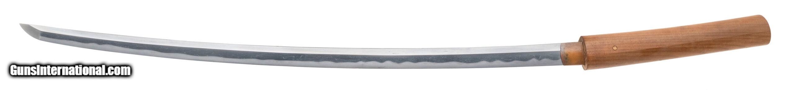 Description: "Period: Koto era, late Muromachi period (c. 1500s) Signature (mei): Mumei (unsigned) Blade (nagasa): 27 3/8 in. Mounts: In plain shira saya with a copper habaki Description: A classic unsigned katana from the Koto era, attributed to the Mino tradition of the late Muromachi period. The blade measures 27 3/8" with a graceful curvature and two mekugi-ana, evidence of multiple remountings during its long service life. The hamon is an attractive irregular midare with gunome elements, visible throughout the length, and continues into the kissaki with a well-formed boshi. The sugata, healthy proportions, and active hamon are consistent with Sue-koto Mino work of the 16th century. As is often the case with older swords, the blade was left unsigned (mumei), allowing attribution to be made by style and workmanship. Condition: The blade is in a relatively bright polish that displays the hamon well, with only light scratches and handling marks present. No fatal flaws or major ware observed. The shira saya remains in excellent condition and provides proper long-term storage. Measurements: • Nagasa: 27 3/8" • Nakago: two mekugi-ana, unsigned • Curvature: moderate sori Collector Notes: An elegant Mumei Koto katana preserved in shira saya, with strong features pointing to the Mino school of the 1500s. A fine representative example of late Muromachi work and a worthy addition to any collection of early Japanese swords. Price: $3,500.00 Contact Seller |