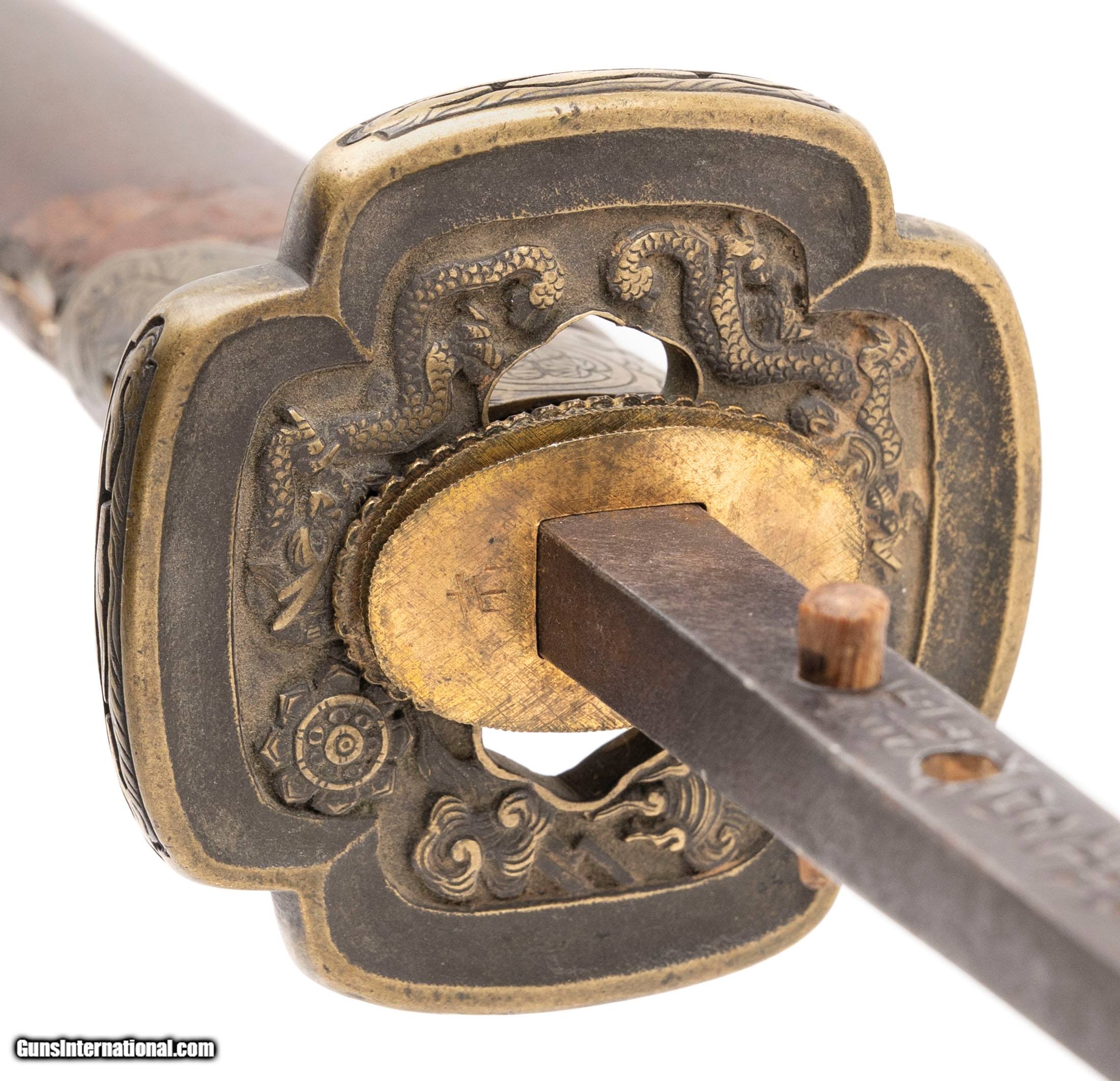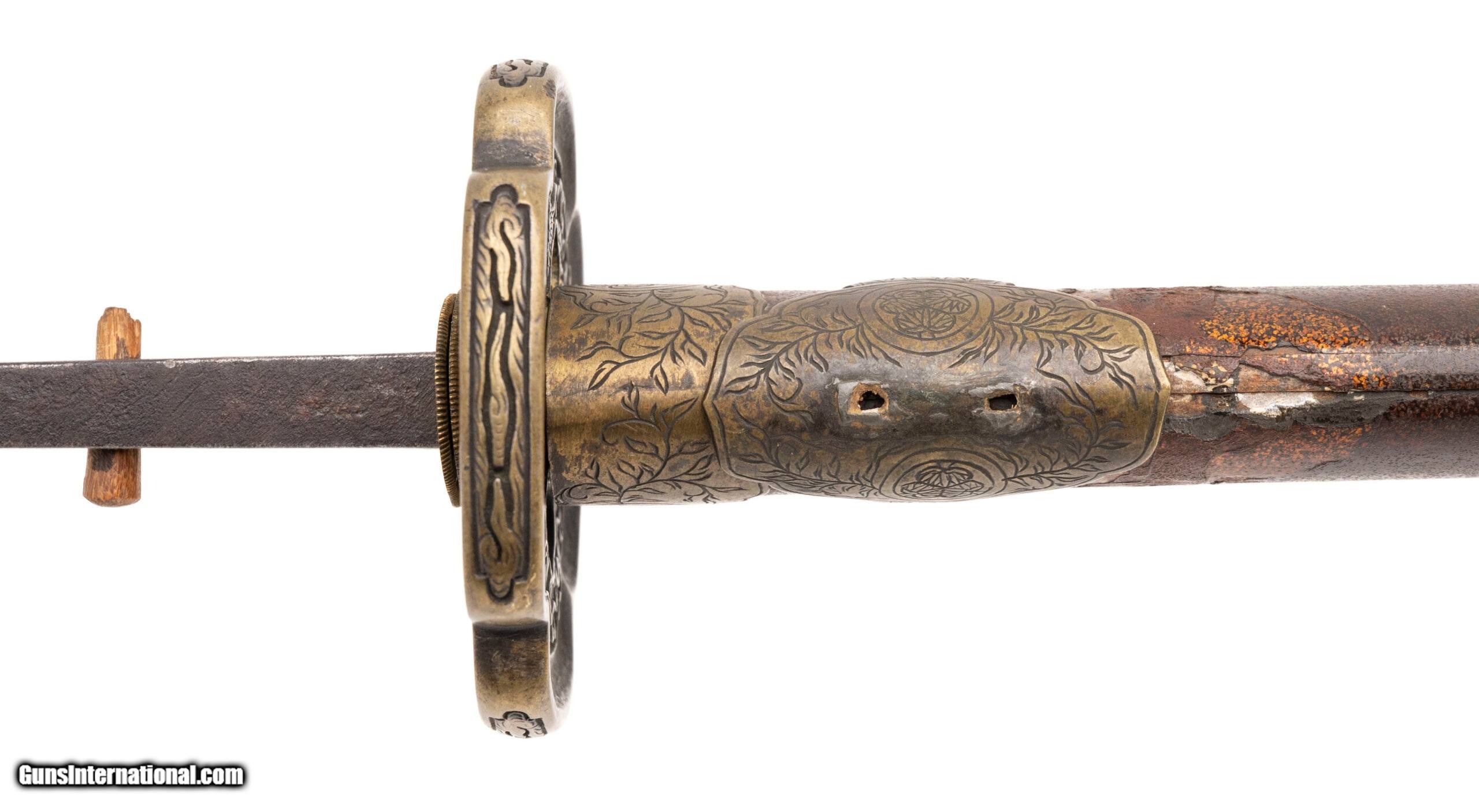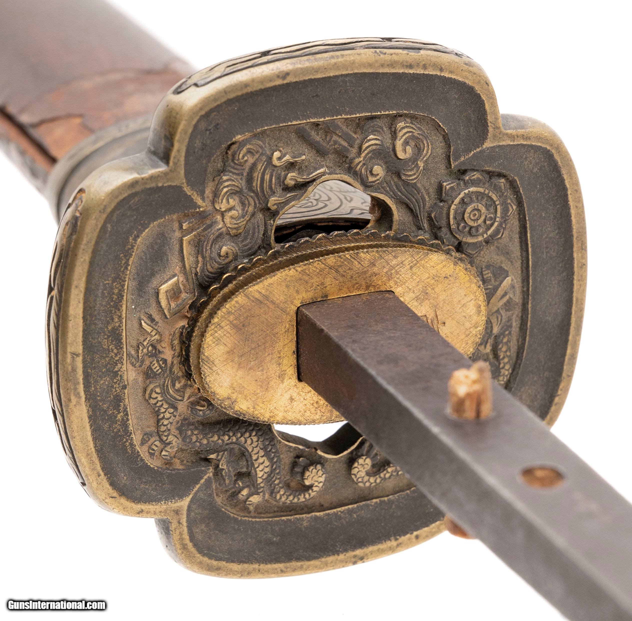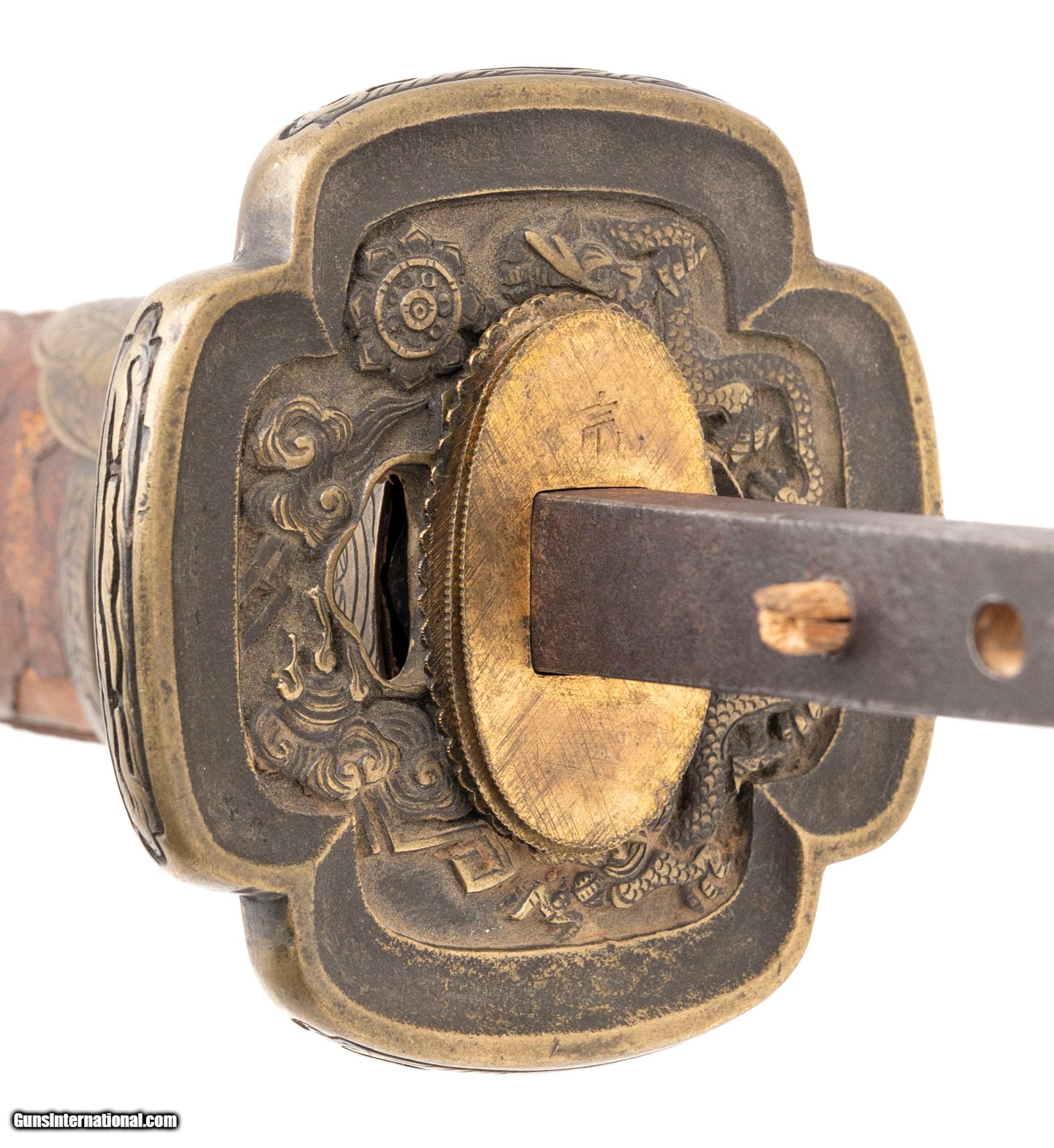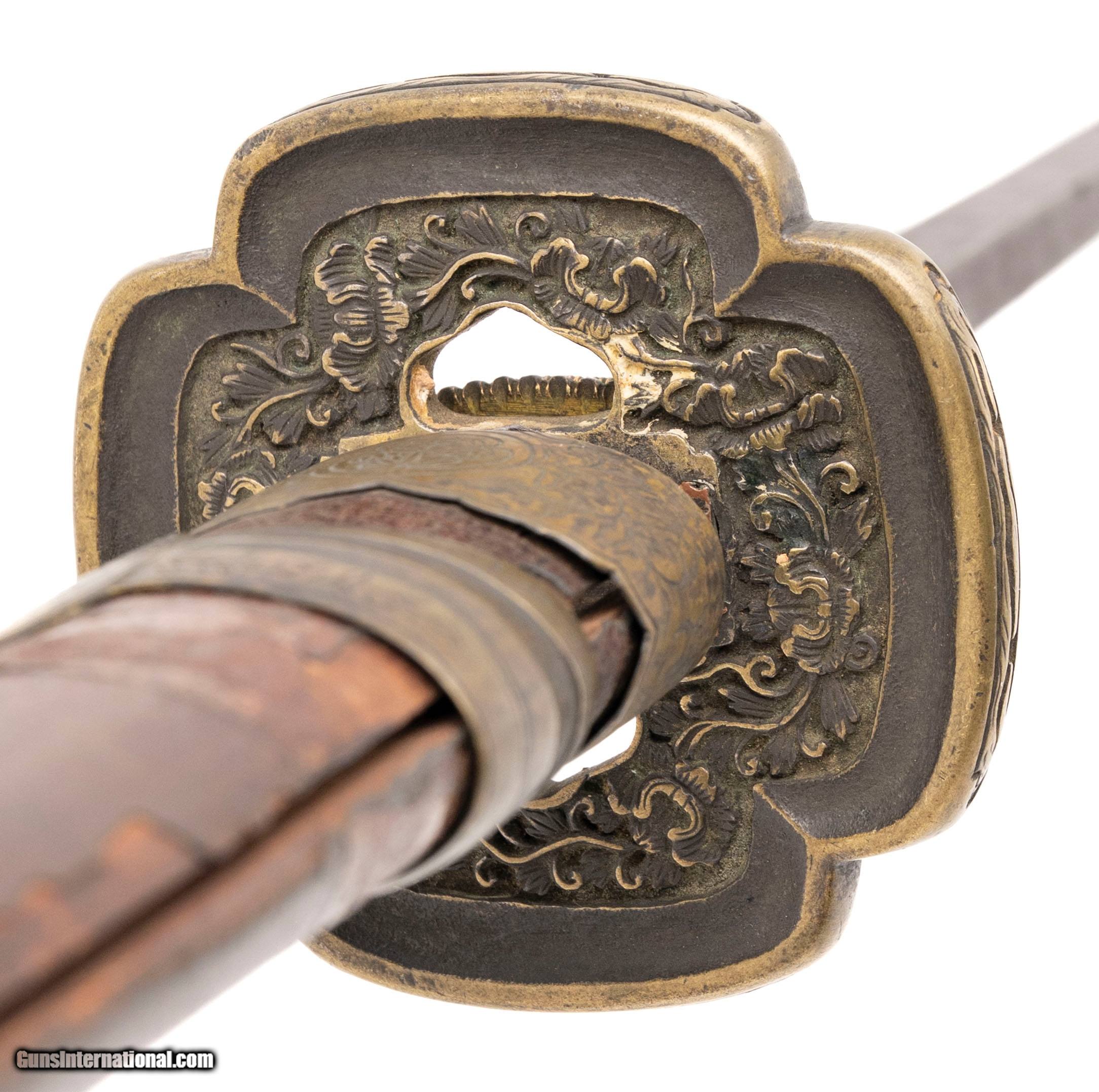 Description: "Blade: A massive omi-yari with a nagasa of 28" — unusually long for the type. The blade is of su-yari form, double-edged with a long central ridge and a deep bo-hi extending down the shaft. The geometry remains sharp and crisp, with a rounded spear point (minor edge bruise noted). Bright polish shows a clean ji and activity in the ha, though some areas display surface scratches and cloudiness from earlier oxidation. Nakago: Long tang with two mekugi-ana, cut with the detailed mei: ?????????? (Noto Kuni ju Fujiwara Yoshiyuki). Translation: “Yoshiyuki of the Fujiwara clan, residing in Noto Province." Yasurime are straight, typical of Edo-period workmanship. Mounts: Unusually, this yari is found in katana-style mounts rather than on a pole. • Tsuba: Heavy brass/bronze guard of mokko-gata form, decorated in low relief with twin coiling dragons among clouds on the obverse and reverse. The carving is detailed, with additional symbolic motifs including a Buddhist wheel. The hitsu-ana are intact. • Saya: Lacquered wood saya fitted with decorative brass bands and kojiri. The lacquer finish shows flaking and wear but retains its original Edo-period character. • Other fittings: The tsuka (handle) is missing, but seppa and other spacers remain present. Condition: The blade is in a bright polish, with some abrasions and a few surface blemishes, but overall remains impressive. Mounts are worn, with lacquer losses to the saya, but all major components are intact and display well. Remarks: Omi-yari of this size are rare, especially when signed and mounted in katana-style koshirae. The blade’s mei attributes it to Fujiwara Yoshiyuki of Noto Province, a documented Edo-period smith. This was not a battlefield yari but rather a prestige piece — likely for ceremonial or display use in the late Edo period. Price: $6,500.00 Contact Seller |