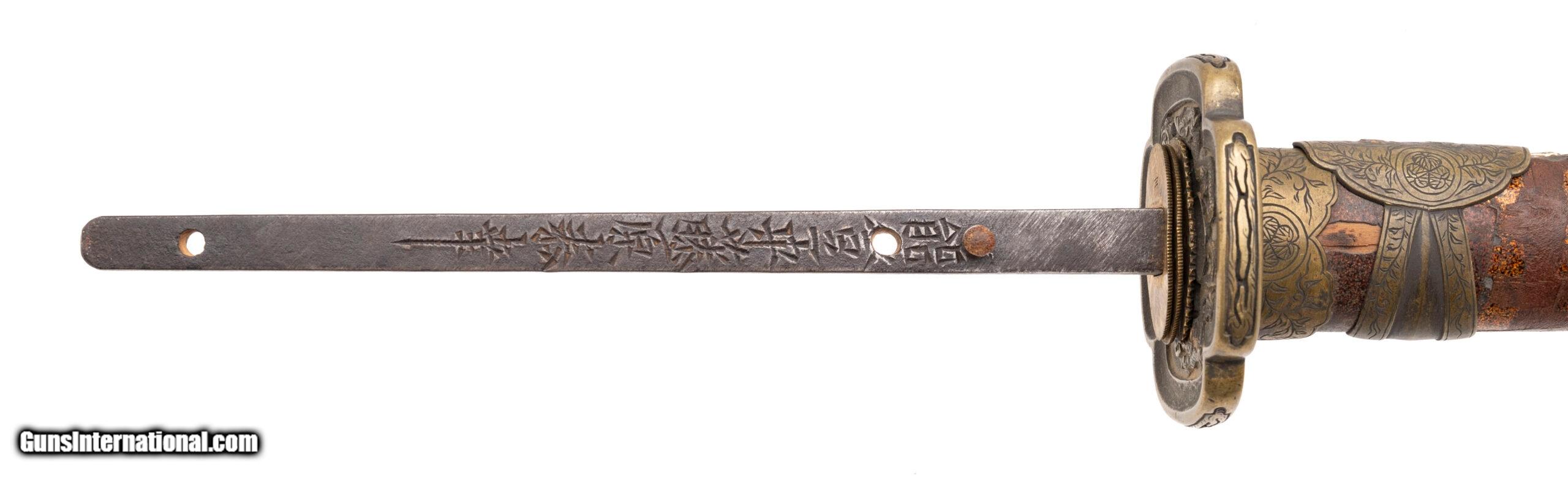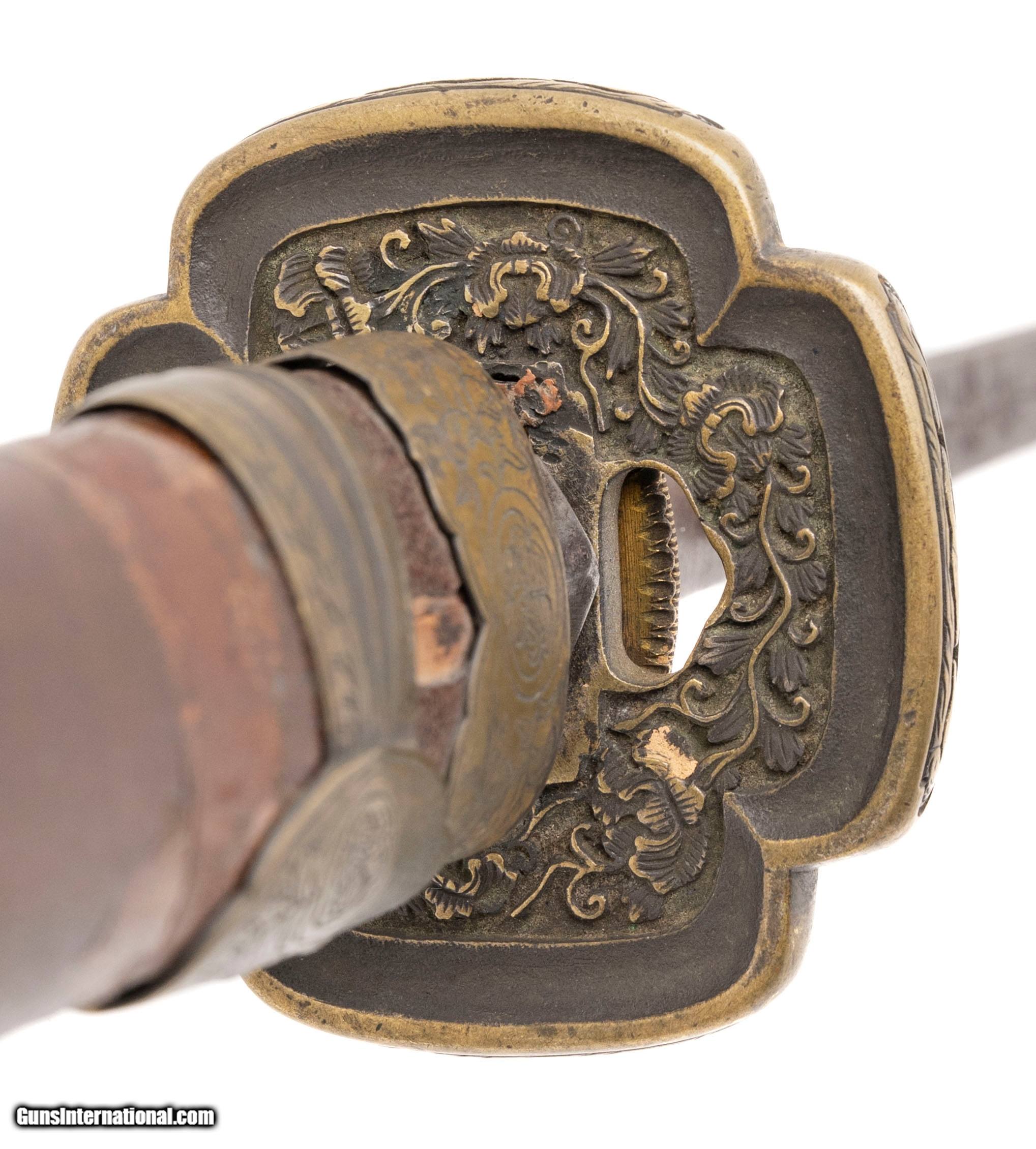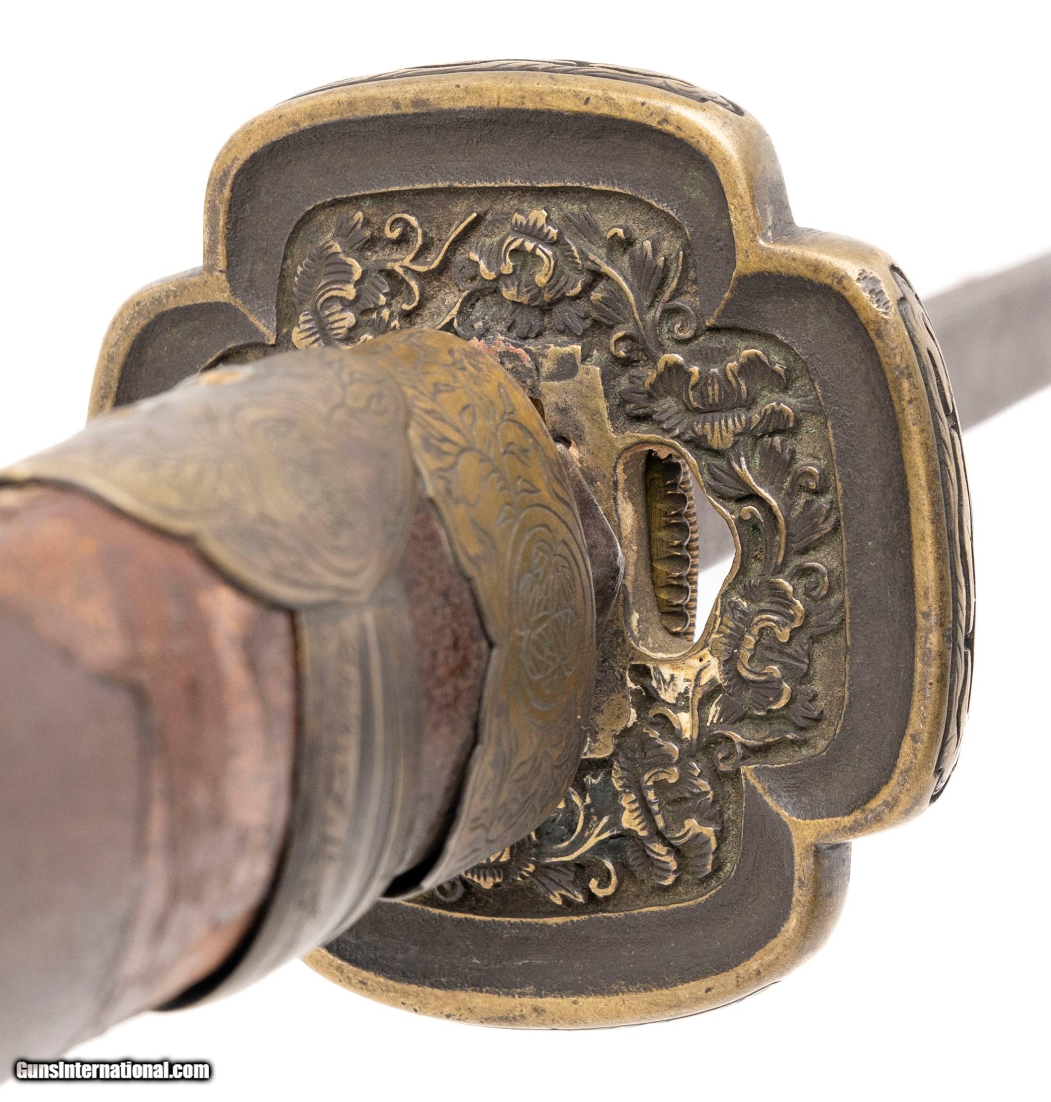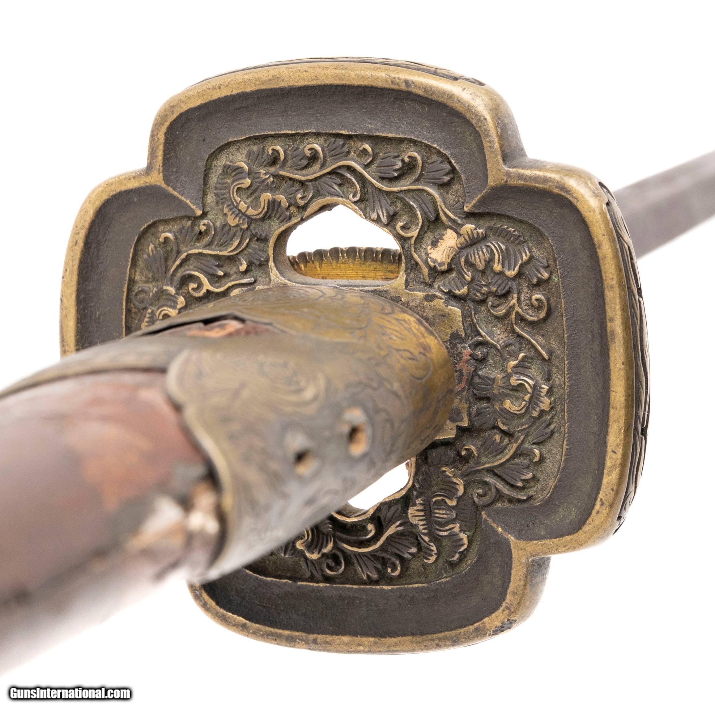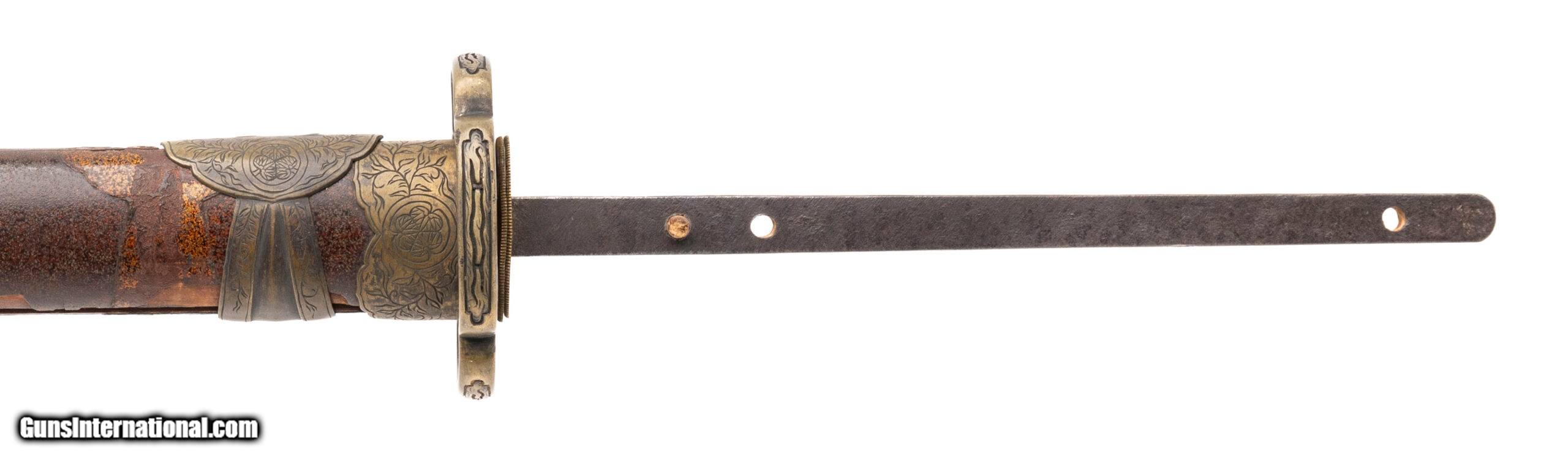 Description: "Blade: A massive omi-yari with a nagasa of 28" — unusually long for the type. The blade is of su-yari form, double-edged with a long central ridge and a deep bo-hi extending down the shaft. The geometry remains sharp and crisp, with a rounded spear point (minor edge bruise noted). Bright polish shows a clean ji and activity in the ha, though some areas display surface scratches and cloudiness from earlier oxidation. Nakago: Long tang with two mekugi-ana, cut with the detailed mei: ?????????? (Noto Kuni ju Fujiwara Yoshiyuki). Translation: “Yoshiyuki of the Fujiwara clan, residing in Noto Province." Yasurime are straight, typical of Edo-period workmanship. Mounts: Unusually, this yari is found in katana-style mounts rather than on a pole. • Tsuba: Heavy brass/bronze guard of mokko-gata form, decorated in low relief with twin coiling dragons among clouds on the obverse and reverse. The carving is detailed, with additional symbolic motifs including a Buddhist wheel. The hitsu-ana are intact. • Saya: Lacquered wood saya fitted with decorative brass bands and kojiri. The lacquer finish shows flaking and wear but retains its original Edo-period character. • Other fittings: The tsuka (handle) is missing, but seppa and other spacers remain present. Condition: The blade is in a bright polish, with some abrasions and a few surface blemishes, but overall remains impressive. Mounts are worn, with lacquer losses to the saya, but all major components are intact and display well. Remarks: Omi-yari of this size are rare, especially when signed and mounted in katana-style koshirae. The blade’s mei attributes it to Fujiwara Yoshiyuki of Noto Province, a documented Edo-period smith. This was not a battlefield yari but rather a prestige piece — likely for ceremonial or display use in the late Edo period. Price: $6,500.00 Contact Seller |