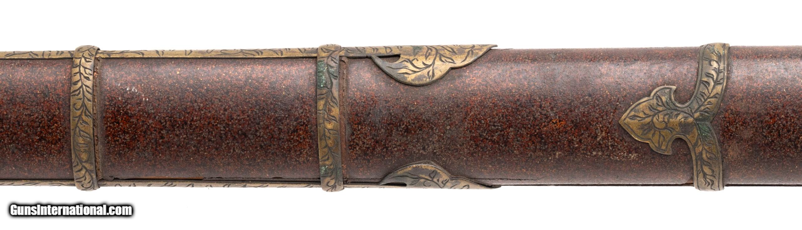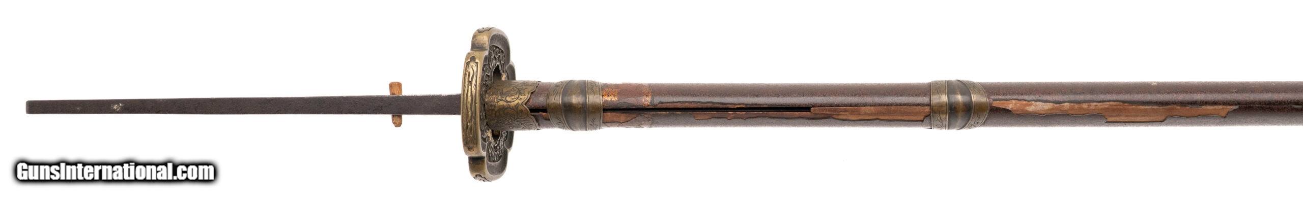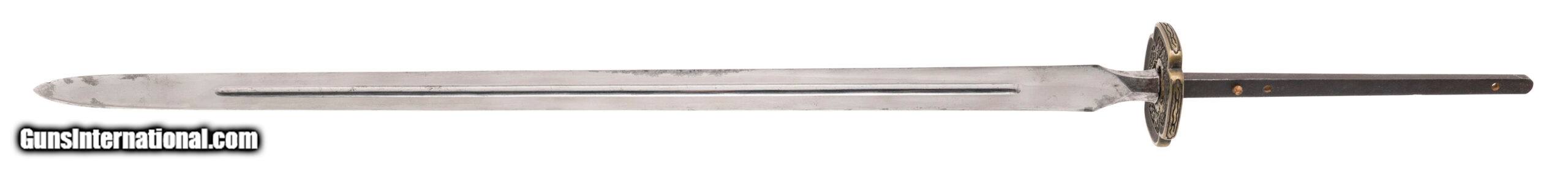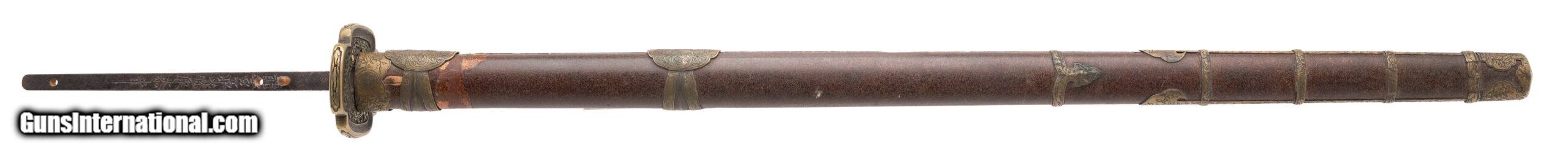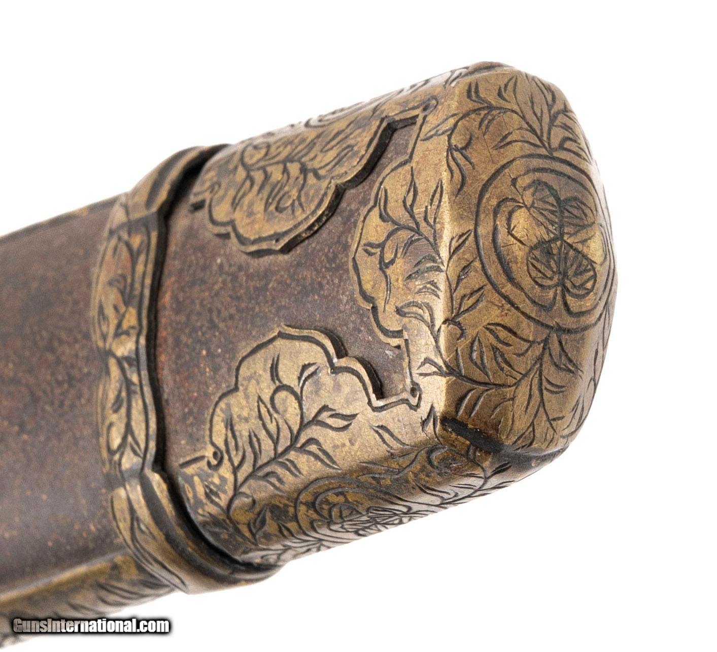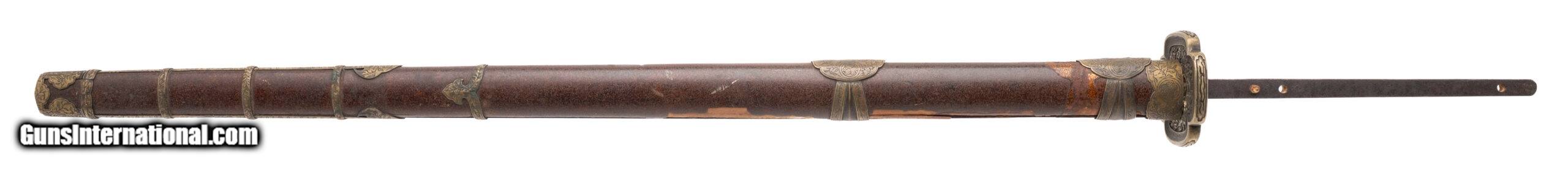 Description: "Blade: A massive omi-yari with a nagasa of 28" — unusually long for the type. The blade is of su-yari form, double-edged with a long central ridge and a deep bo-hi extending down the shaft. The geometry remains sharp and crisp, with a rounded spear point (minor edge bruise noted). Bright polish shows a clean ji and activity in the ha, though some areas display surface scratches and cloudiness from earlier oxidation. Nakago: Long tang with two mekugi-ana, cut with the detailed mei: ?????????? (Noto Kuni ju Fujiwara Yoshiyuki). Translation: “Yoshiyuki of the Fujiwara clan, residing in Noto Province." Yasurime are straight, typical of Edo-period workmanship. Mounts: Unusually, this yari is found in katana-style mounts rather than on a pole. • Tsuba: Heavy brass/bronze guard of mokko-gata form, decorated in low relief with twin coiling dragons among clouds on the obverse and reverse. The carving is detailed, with additional symbolic motifs including a Buddhist wheel. The hitsu-ana are intact. • Saya: Lacquered wood saya fitted with decorative brass bands and kojiri. The lacquer finish shows flaking and wear but retains its original Edo-period character. • Other fittings: The tsuka (handle) is missing, but seppa and other spacers remain present. Condition: The blade is in a bright polish, with some abrasions and a few surface blemishes, but overall remains impressive. Mounts are worn, with lacquer losses to the saya, but all major components are intact and display well. Remarks: Omi-yari of this size are rare, especially when signed and mounted in katana-style koshirae. The blade’s mei attributes it to Fujiwara Yoshiyuki of Noto Province, a documented Edo-period smith. This was not a battlefield yari but rather a prestige piece — likely for ceremonial or display use in the late Edo period. Price: $6,500.00 Contact Seller |