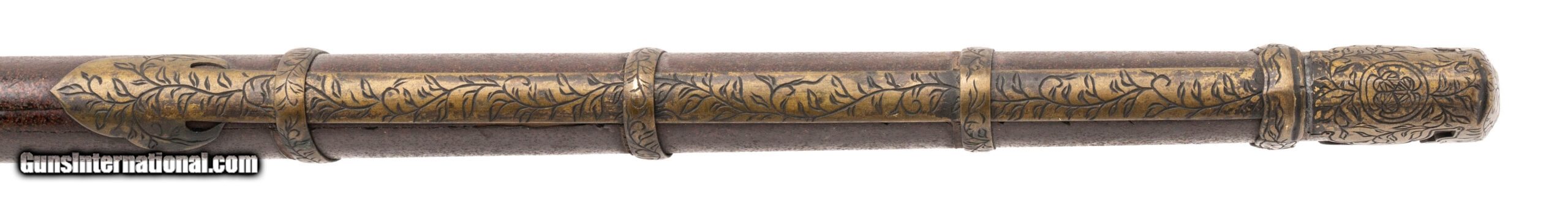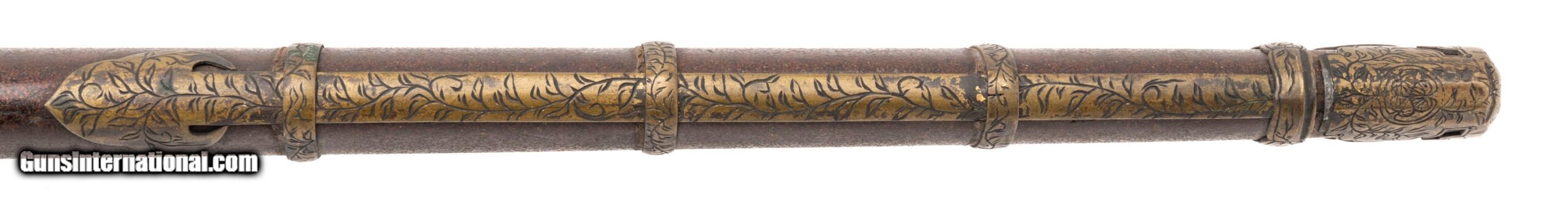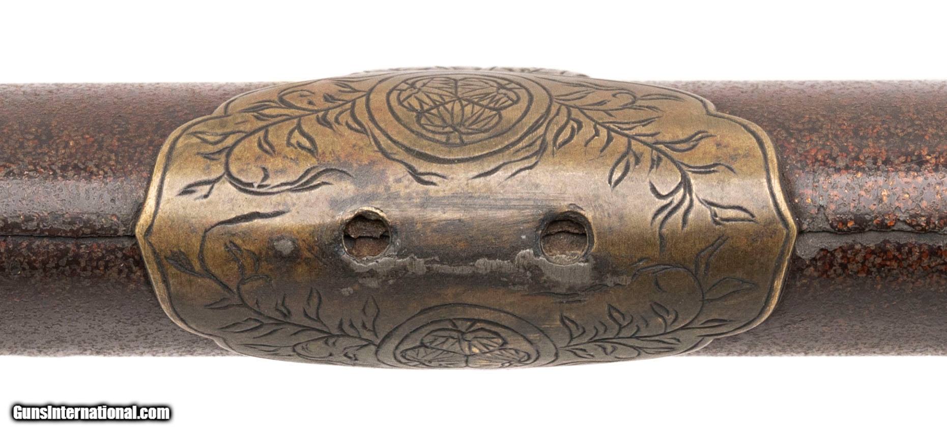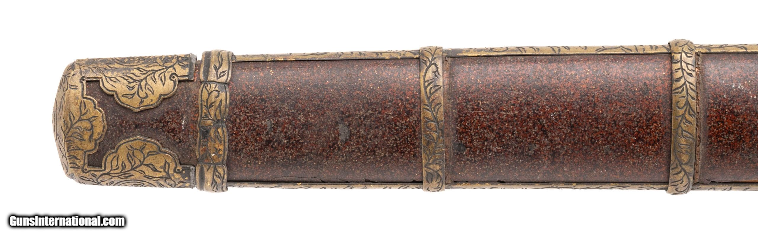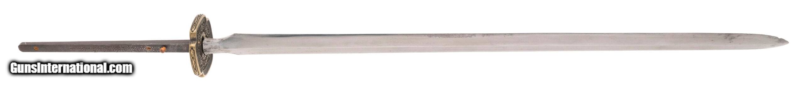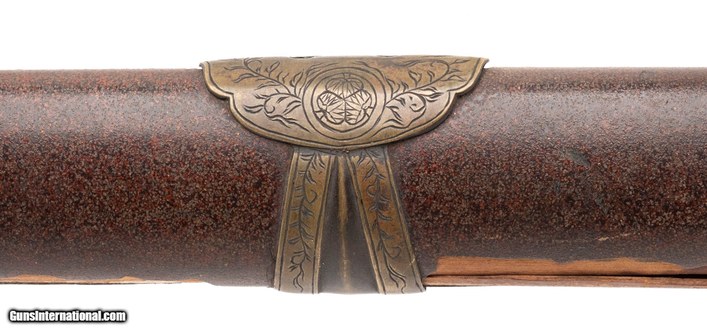 Description: "Blade: A massive omi-yari with a nagasa of 28" — unusually long for the type. The blade is of su-yari form, double-edged with a long central ridge and a deep bo-hi extending down the shaft. The geometry remains sharp and crisp, with a rounded spear point (minor edge bruise noted). Bright polish shows a clean ji and activity in the ha, though some areas display surface scratches and cloudiness from earlier oxidation. Nakago: Long tang with two mekugi-ana, cut with the detailed mei: ?????????? (Noto Kuni ju Fujiwara Yoshiyuki). Translation: “Yoshiyuki of the Fujiwara clan, residing in Noto Province." Yasurime are straight, typical of Edo-period workmanship. Mounts: Unusually, this yari is found in katana-style mounts rather than on a pole. • Tsuba: Heavy brass/bronze guard of mokko-gata form, decorated in low relief with twin coiling dragons among clouds on the obverse and reverse. The carving is detailed, with additional symbolic motifs including a Buddhist wheel. The hitsu-ana are intact. • Saya: Lacquered wood saya fitted with decorative brass bands and kojiri. The lacquer finish shows flaking and wear but retains its original Edo-period character. • Other fittings: The tsuka (handle) is missing, but seppa and other spacers remain present. Condition: The blade is in a bright polish, with some abrasions and a few surface blemishes, but overall remains impressive. Mounts are worn, with lacquer losses to the saya, but all major components are intact and display well. Remarks: Omi-yari of this size are rare, especially when signed and mounted in katana-style koshirae. The blade’s mei attributes it to Fujiwara Yoshiyuki of Noto Province, a documented Edo-period smith. This was not a battlefield yari but rather a prestige piece — likely for ceremonial or display use in the late Edo period. Price: $6,500.00 Contact Seller |