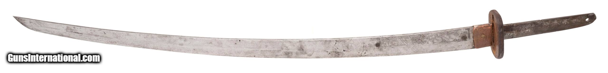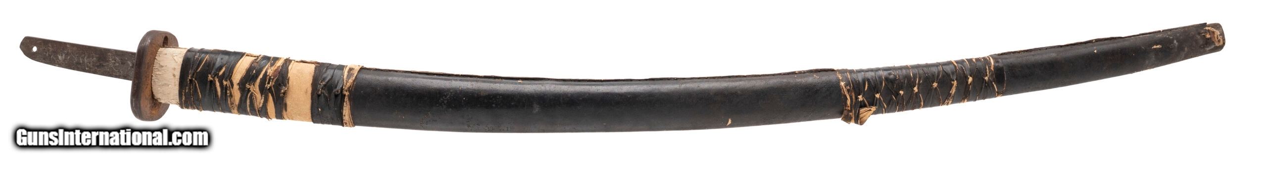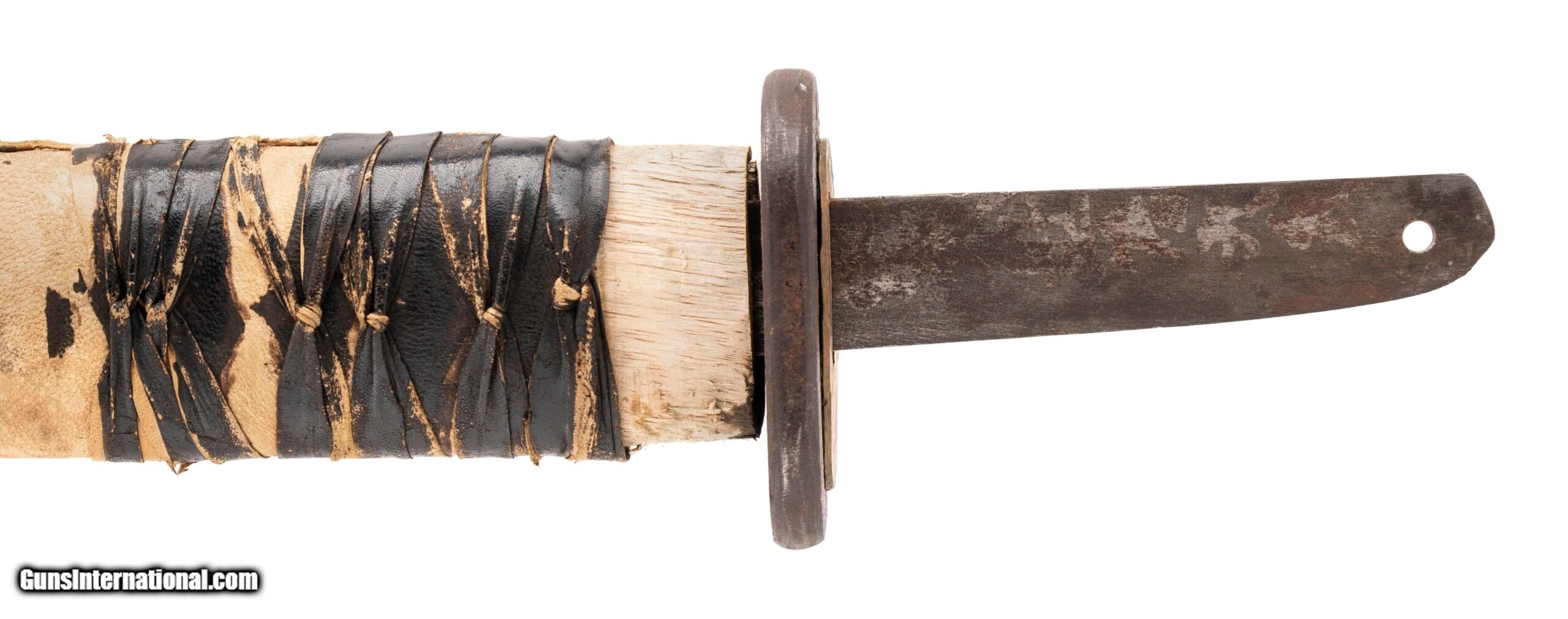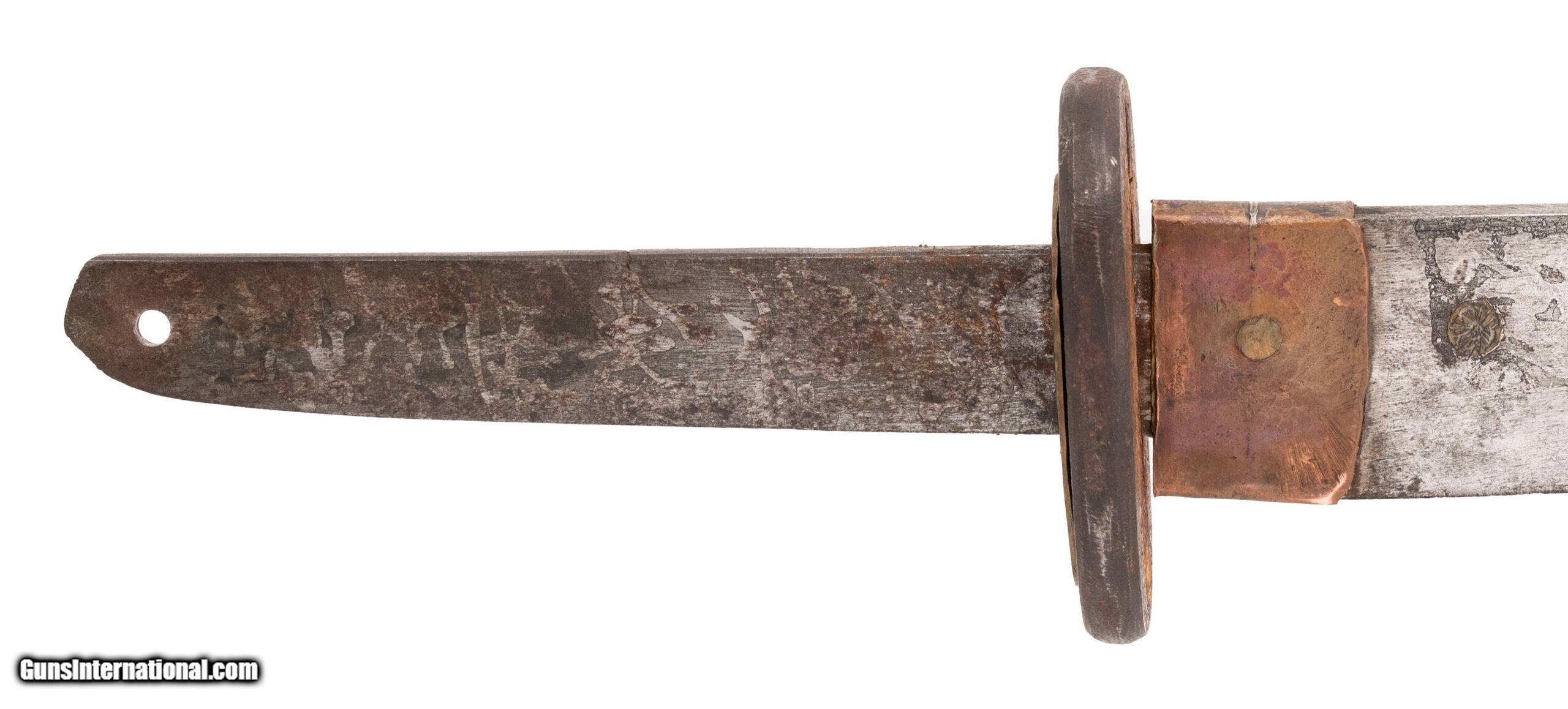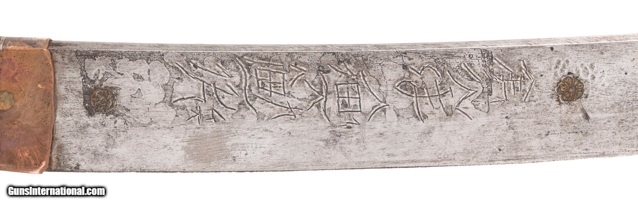 Description: "A rare and imposing Japanese honoto (shrine dedication sword), measuring 39.5 inches in cutting length with a width of 1.625 inches. Unlike combat swords, this oversized odachi-style blade was produced for ceremonial and religious purposes. One side bears the inscription ???? (“Respectfully Dedicated to Military Glory"), while the other reads ?????? (“Respectfully Dedicated to Kurahachi Shrine"), each flanked by chrysanthemum crests of Imperial association. Such swords were typically offered at Shinto shrines as acts of devotion or patriotic dedication, particularly during the late Meiji through Showa periods. The sheer size, bold inscriptions, and imperial symbolism make this a highly unusual and significant example of a shrine dedication blade, suitable as a centerpiece in a collection of Japanese militaria or religious artifacts. Price: $9,500.00 Contact Seller |